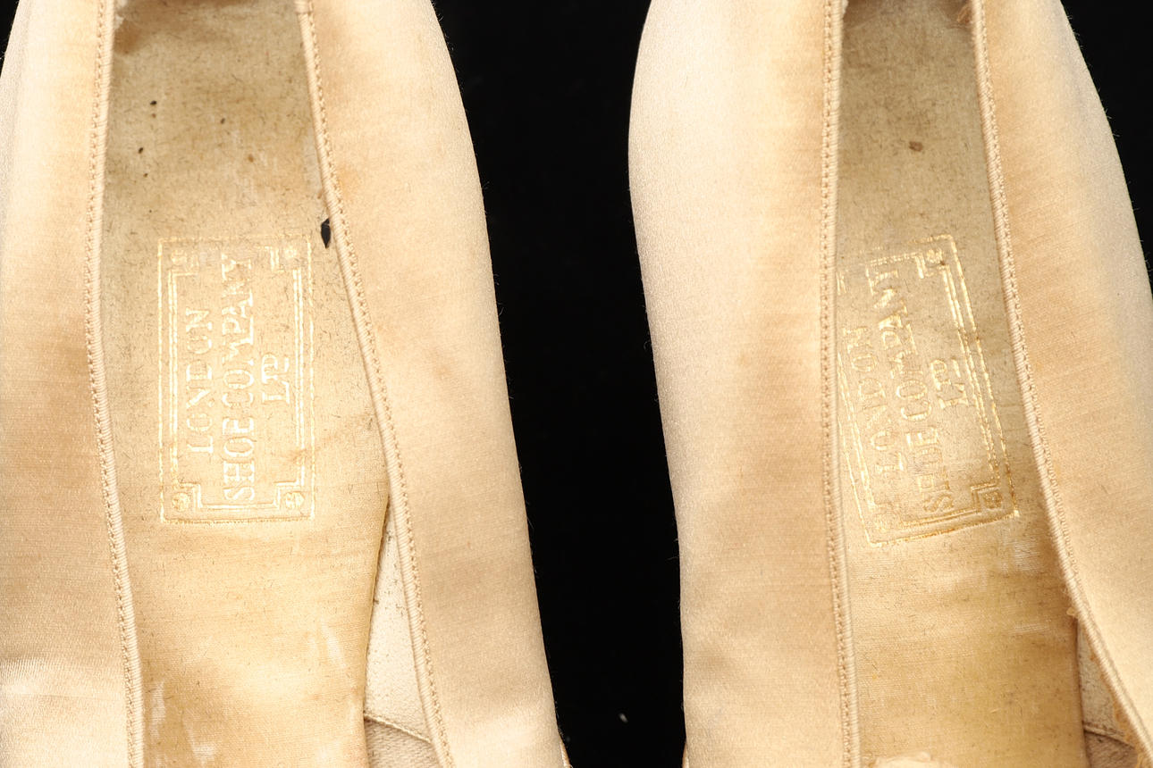 wohl 1920er. Ein Paar cremefarbene Seidenpumps der London Shoe Company Ltd, möglicherweise Größe 6, und ein Paar Ledersandalen, ursprünglich silberfarben mit goldenen und mehrfarbigen Ornamenten. Zusammen mit einer Hutschachtel von Walter Barnard & Son, 33 cm x 29 cm.