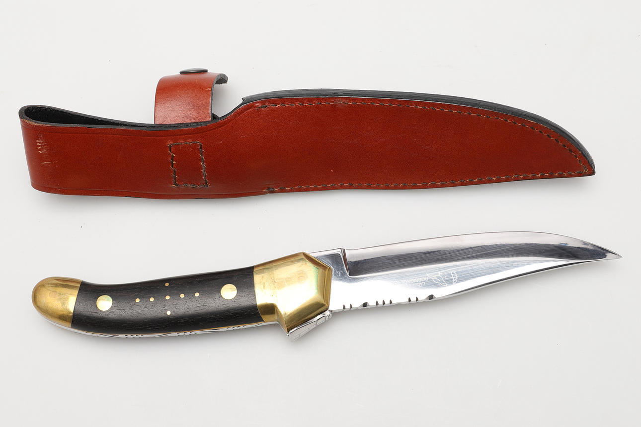 2045695. LAGUIOLE ROSSIGNOL. EIN JAGDMESSER IN EINER LEDERSCHEIDE.