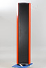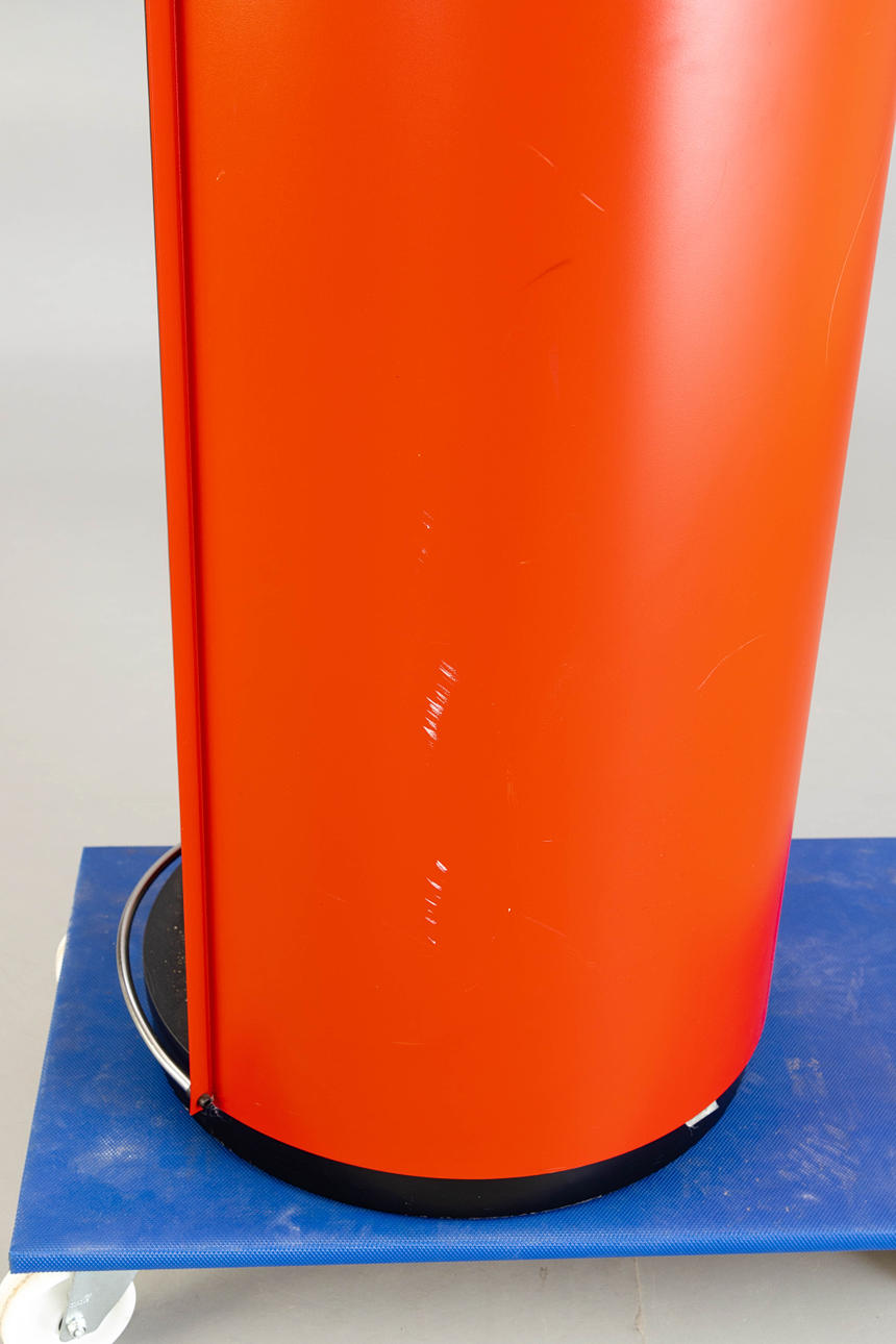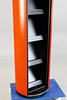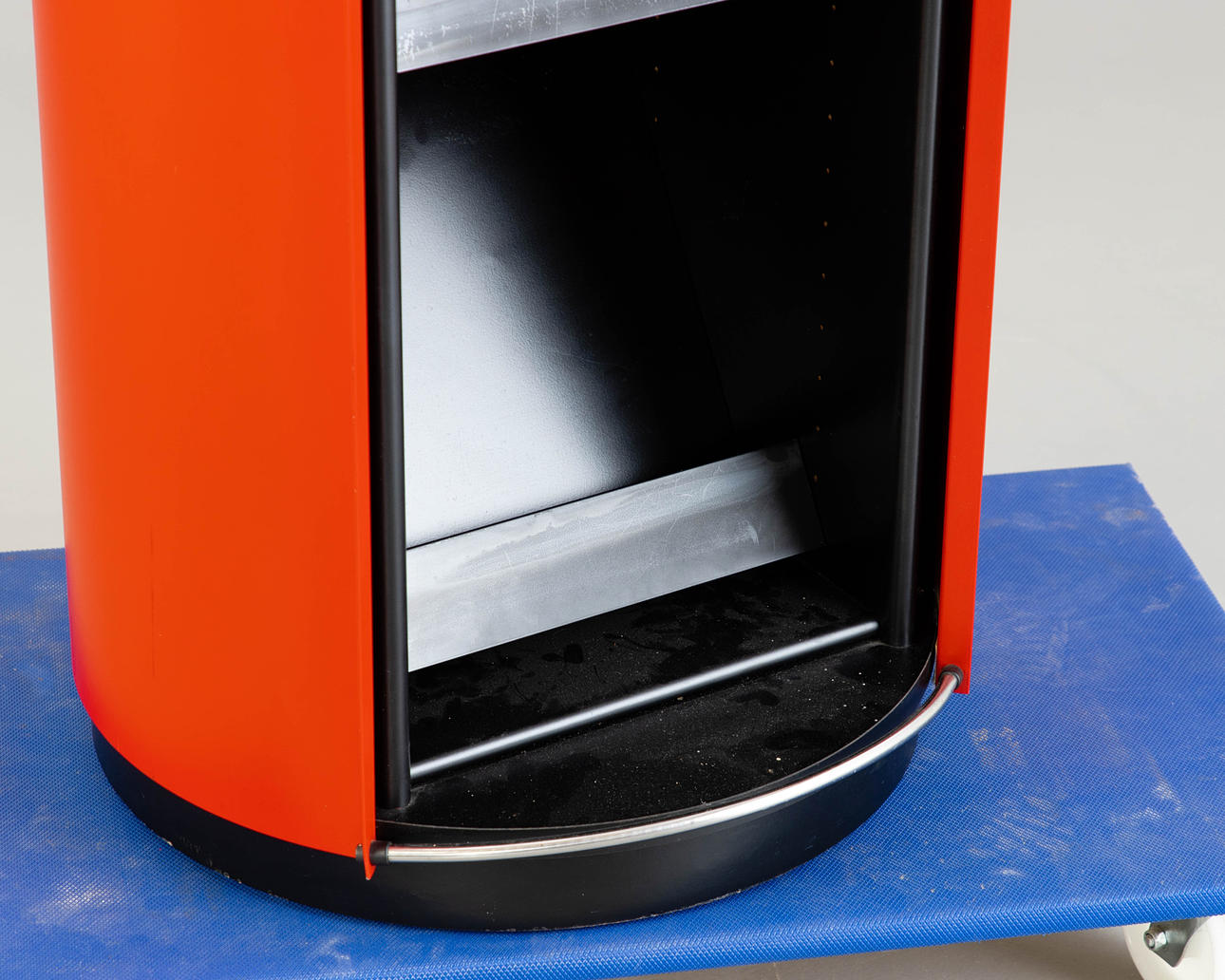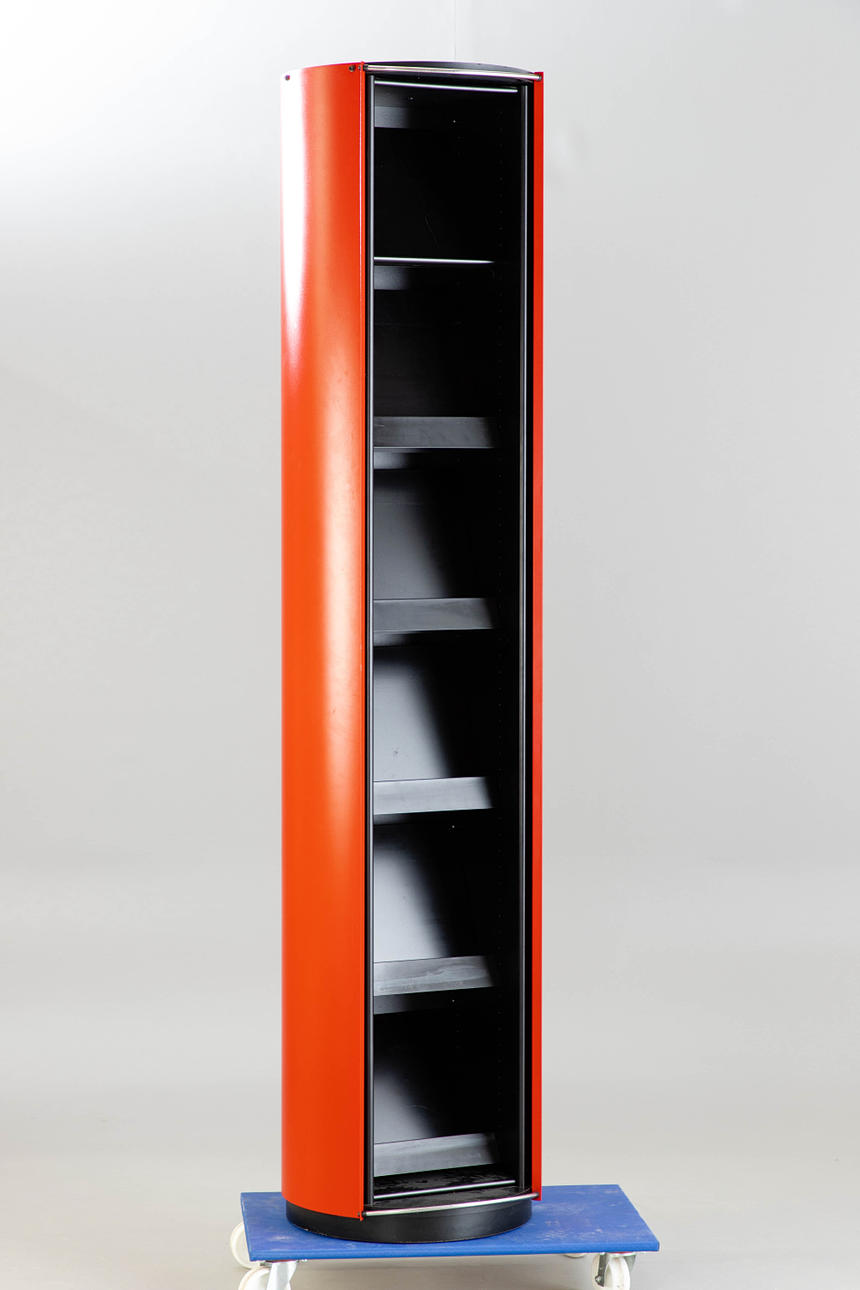 Entwurf: 1994. Indoor Litfaßsäule / Raumteiler. Drehbarer Ummantelung aus rot lackiertem Metall, Innenraum aus schwarz lackiertem Holz, Tablare aus schwarz lackiertem Blech. H. 224 cm, Ø 50 cm.
