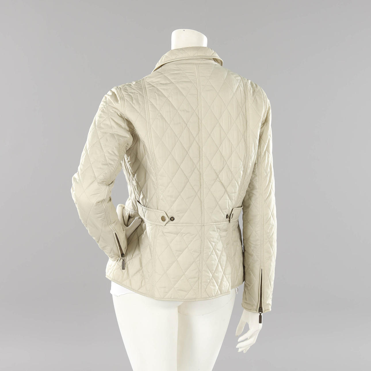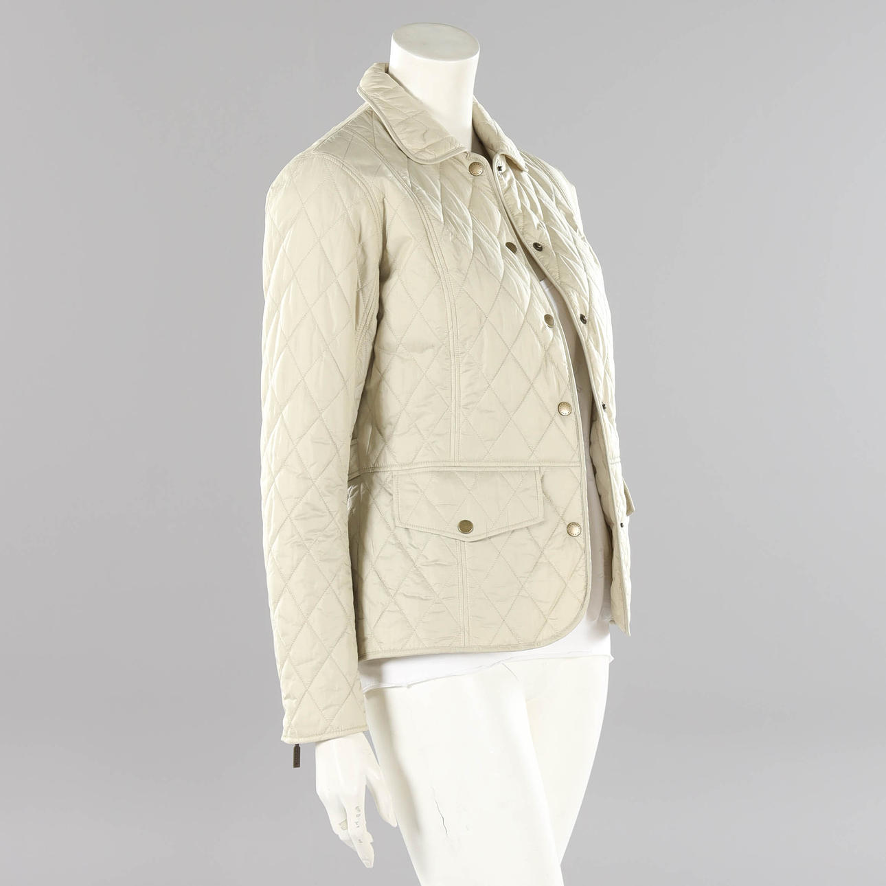 Leichte Steppjacke aus beigefarbenem Nylon, vorne mit Druckknöpfen zu schließen, zwei Außentaschen mit Deckel. Größe. 38.