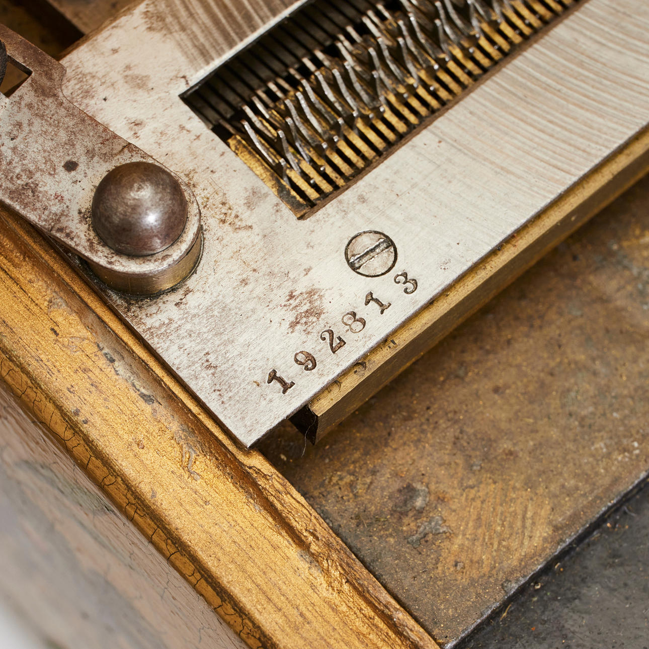 Altersgemäße Gebrauchs- und Reibespuren, partieller Abrieb und Abplatzungen, sowie Oxidationsspuren, Holzgehäuse wurde in der 2. Hälfte des 20. Jahrhunderts restauriert.