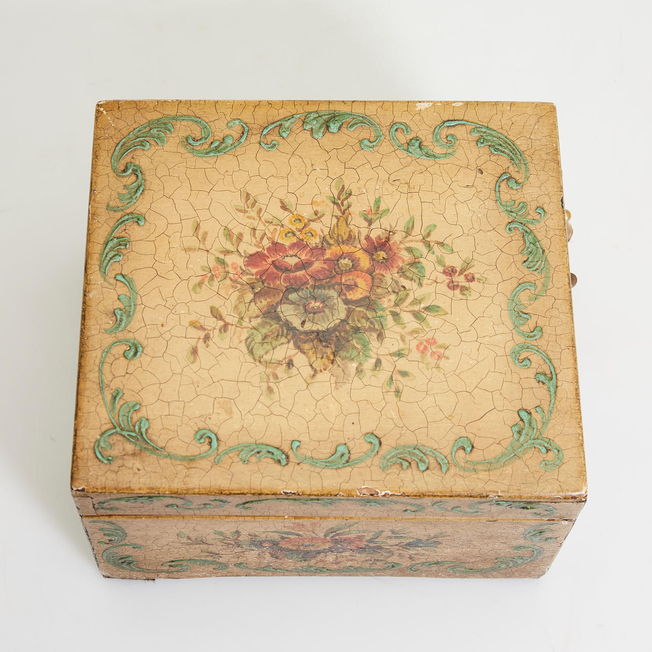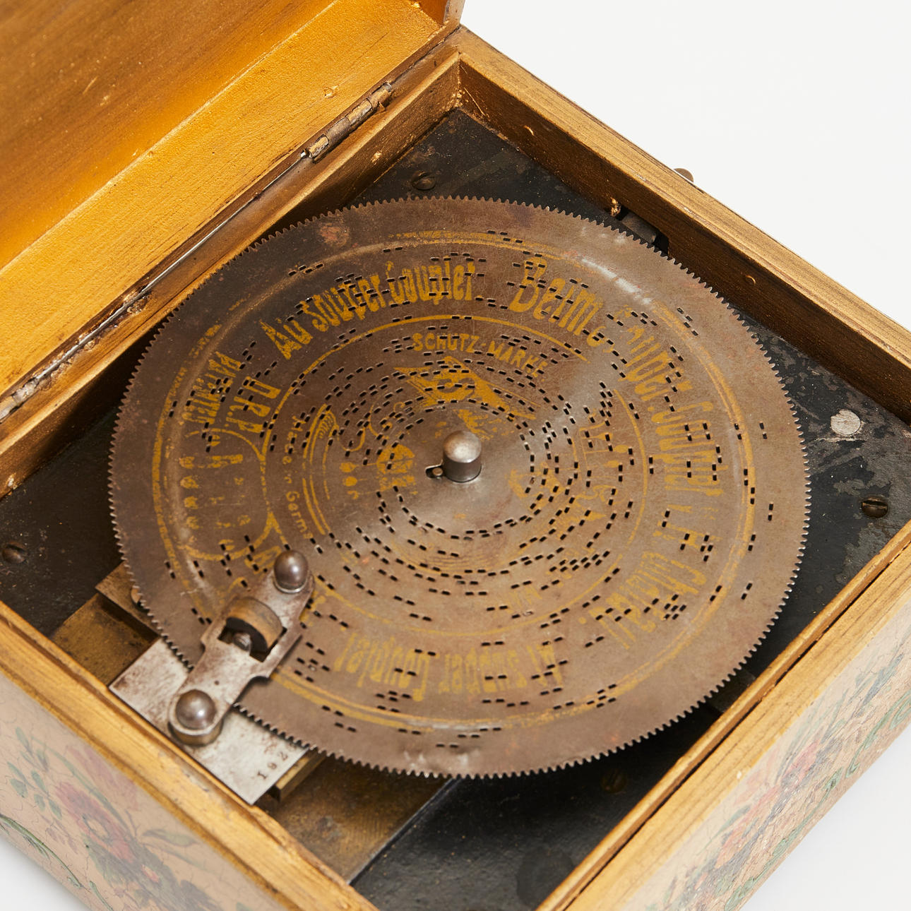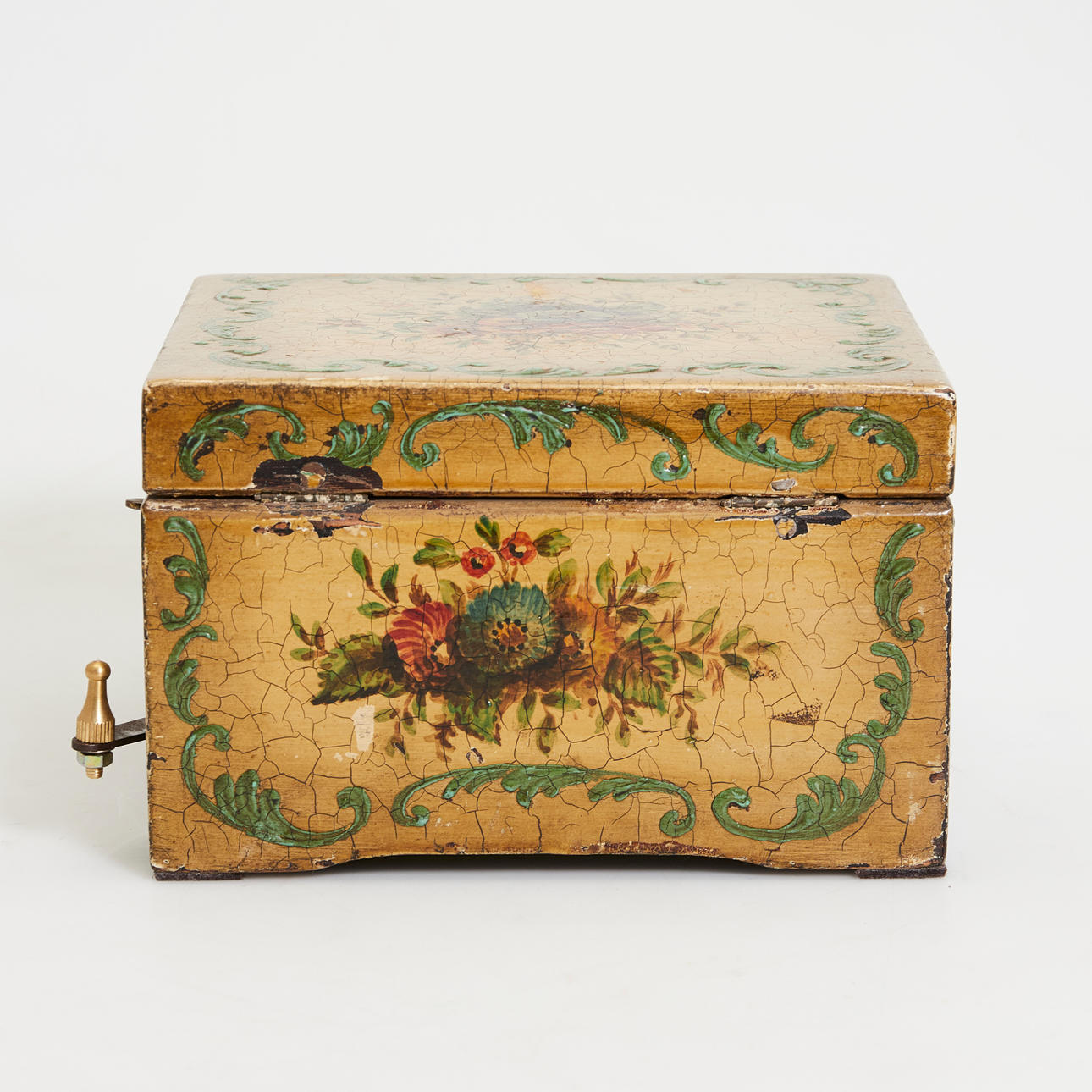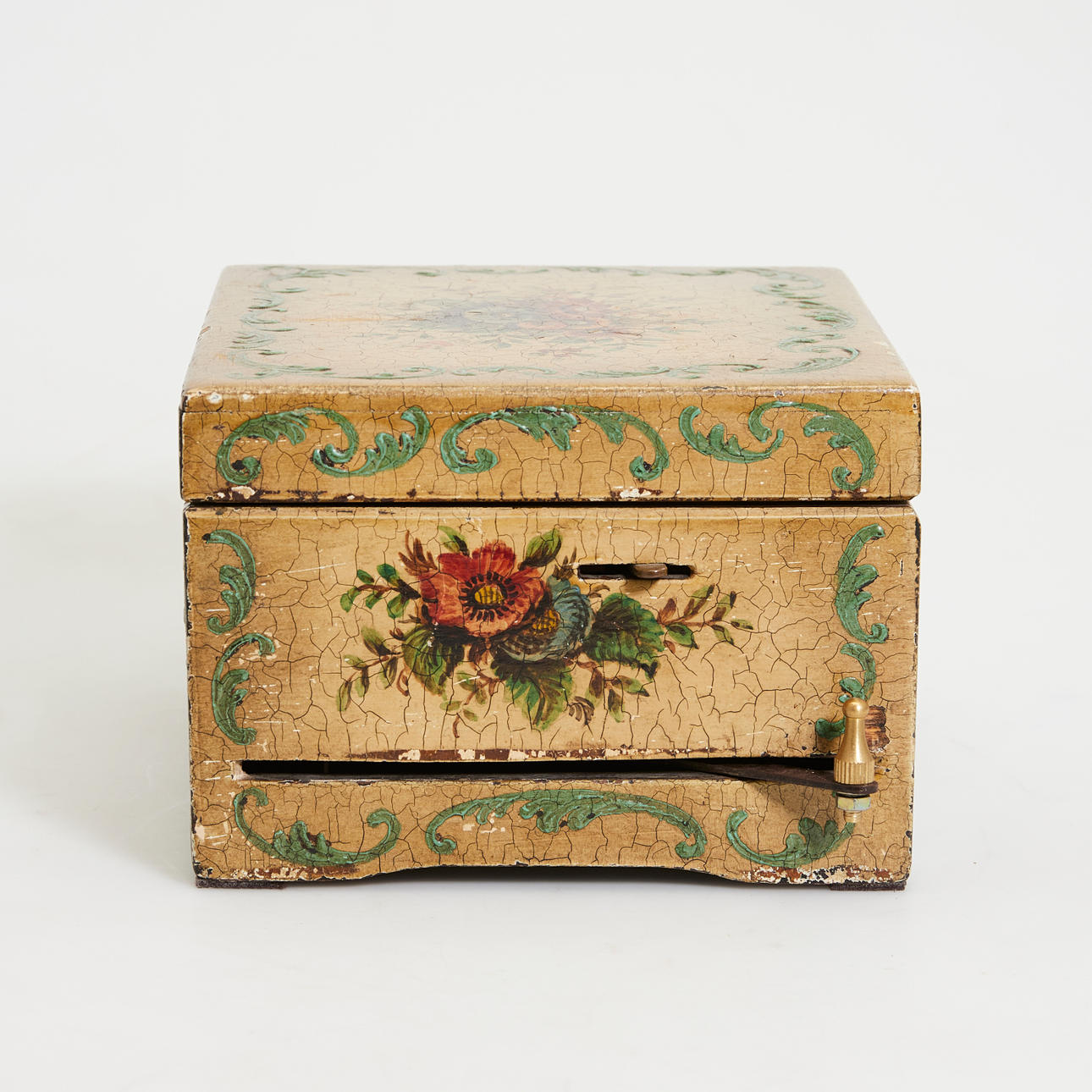 Spieluhr / Spieldose, Holz, um 1930. Spieldose mit einem polychrom lackierten und floral staffierten Holzgehäuse, innen mit einer Musikplatte versehen, mit '1928' graviert, H.12cm, L.19cm, B.19cm.