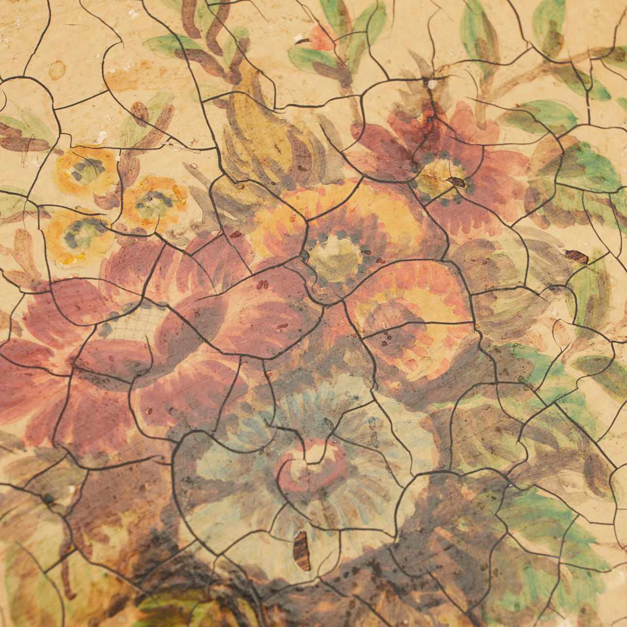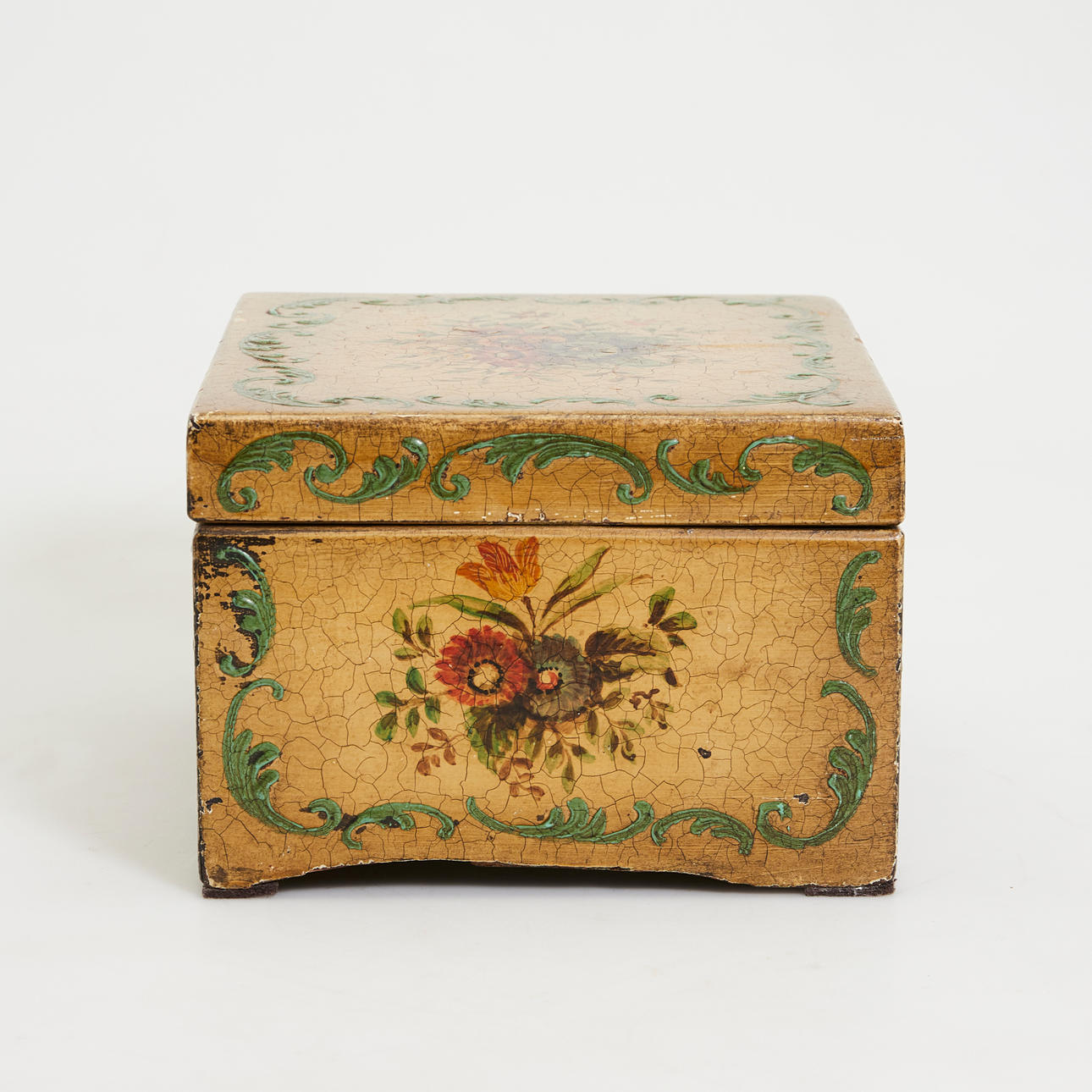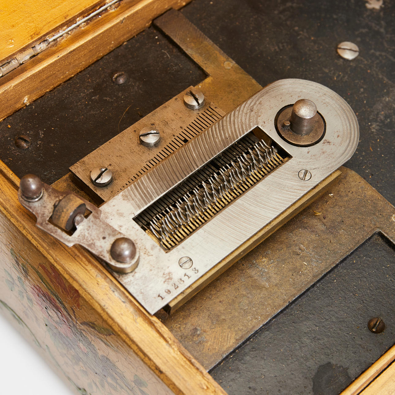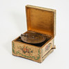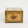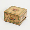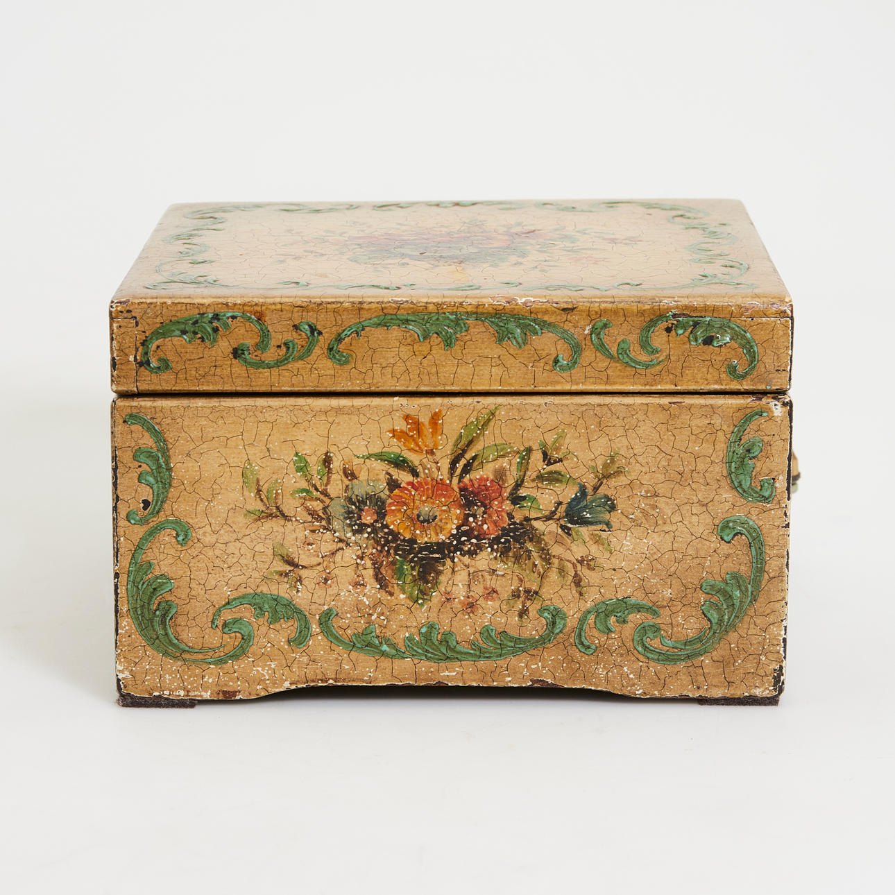 Spieluhr / Spieldose, Holz, um 1930. Spieldose mit einem polychrom lackierten und floral staffierten Holzgehäuse, innen mit einer Musikplatte versehen, mit '1928' graviert, H.12cm, L.19cm, B.19cm.