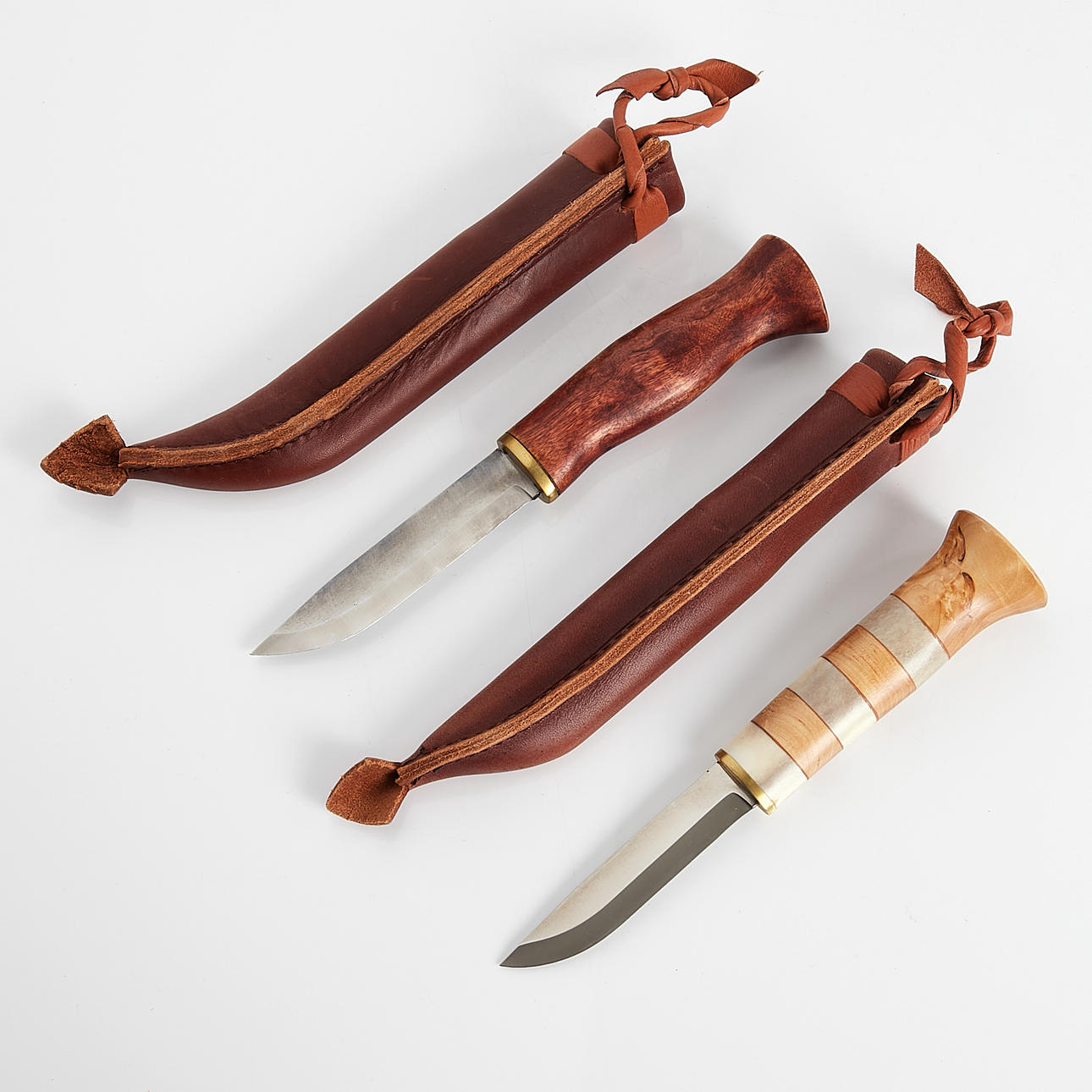Griffe in Birke furniert oder Rentiergeweih und Birke, Lederscheiden, 1900er/2000er Jahre, Gesamtlänge 25-26 cm.