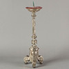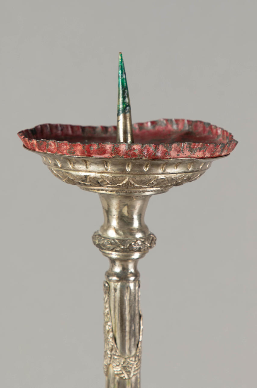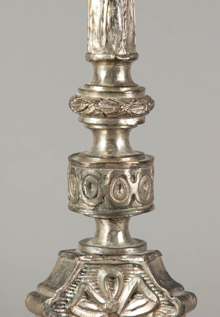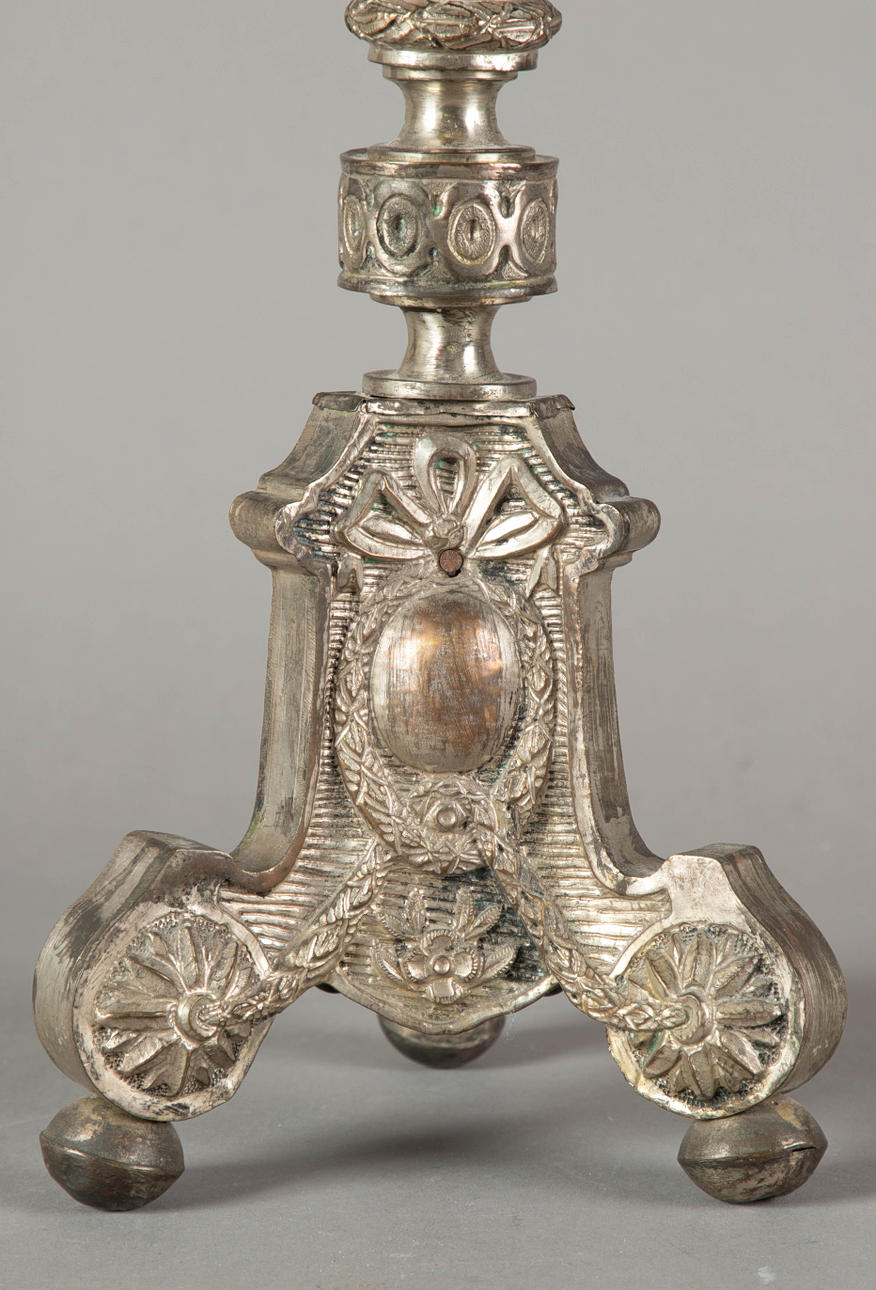 Metall, versilbert, gedrückt und getrieben. Dreiseitig, konkav eingezogener Sockel auf gedrückten Kugeln. Gegliederter Schaft mit schalenförmigem Teller. Hochreliefierte Ornamentik des Louis Seize. HxDm: ca. 60,5 x 19 cm.