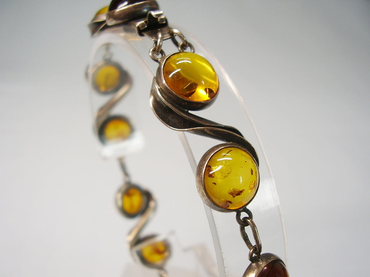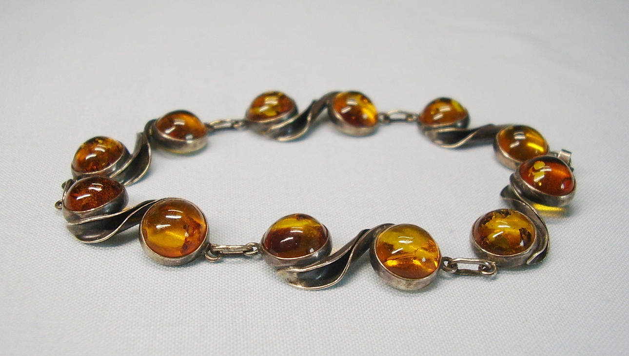 Es ist besetzt mit 12 runden Bernstein-Cabochons mit natürlichen Einschlüssen.