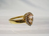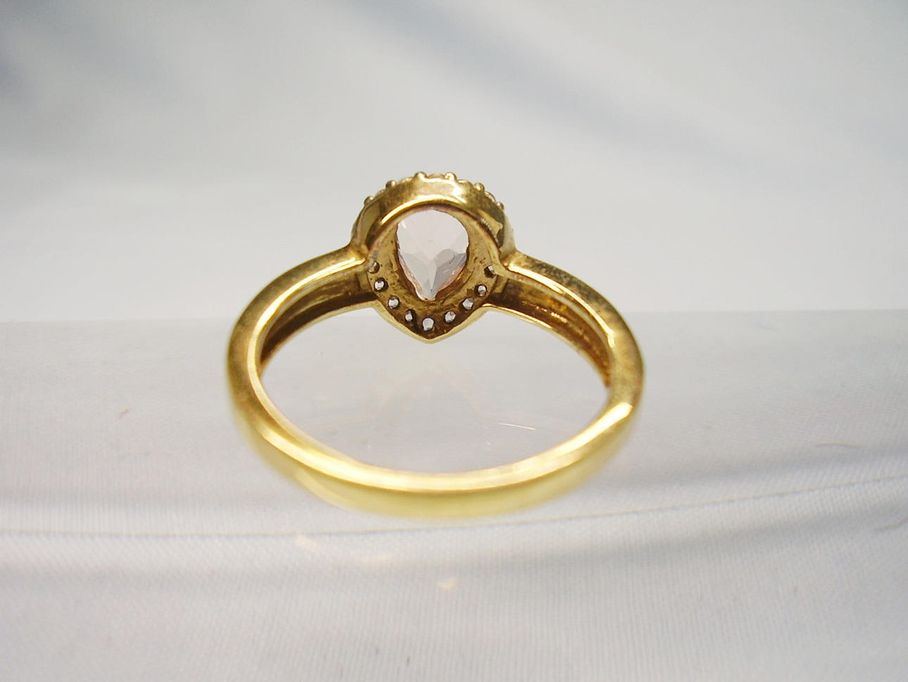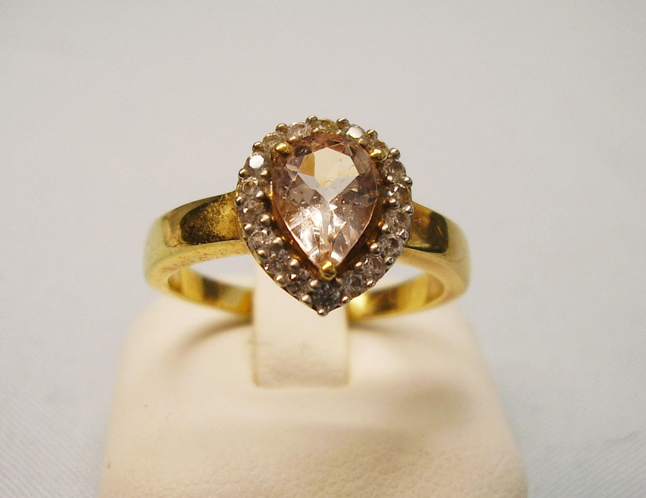 Er ist besetzt mit einem tropfenförmig facettierten Morganit umgeben von Zirkonia-Entourage.