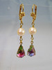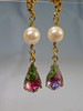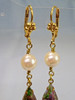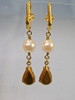 Die antiken Ohrringe sind in Schaumgold ausgeführt. An den Klapp-Ohrbügeln sind echte, weiße Akoya-Zuchtperlen in feinem Lüster und herrlichem Glanz sowie reliefierte, fein irisierende Rheinkiesel-Tropfen beweglich abgehängt.