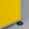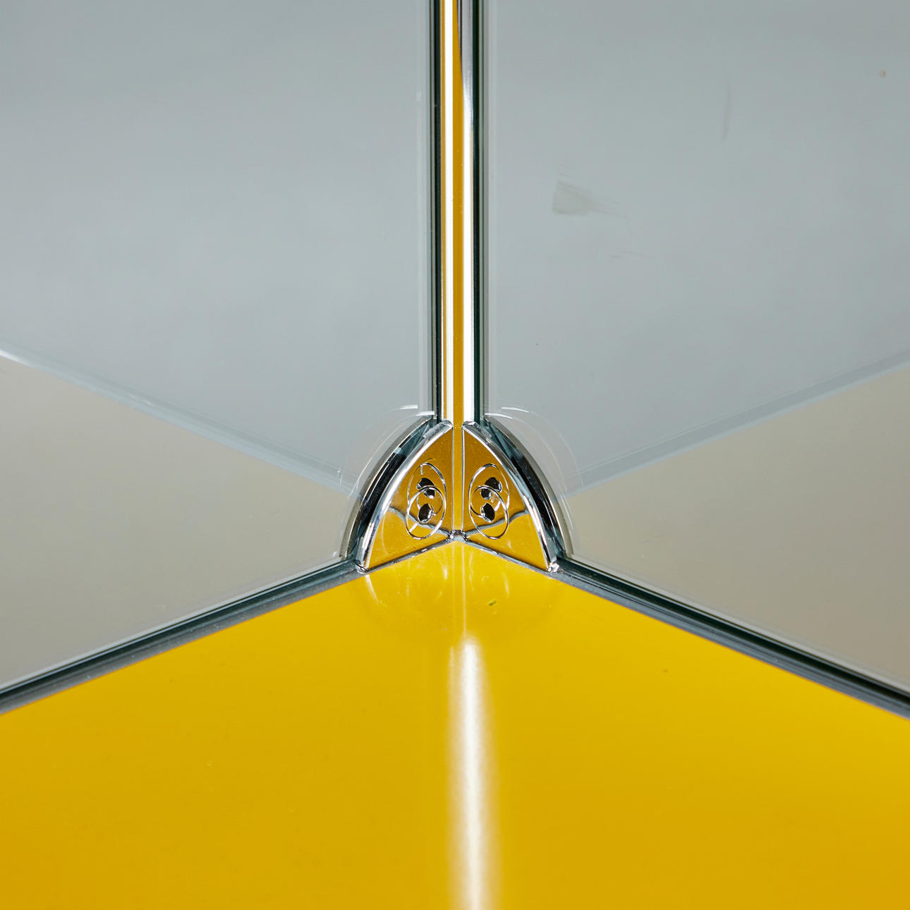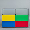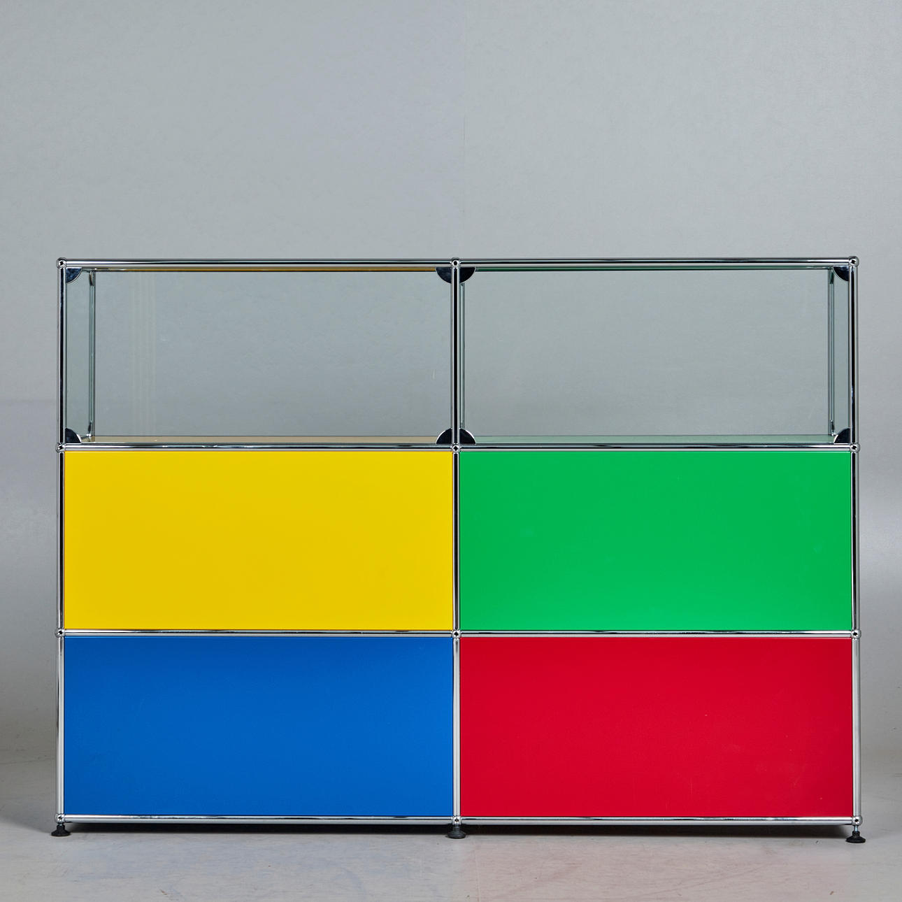 USM Haller, Vitrine / Sideboard, Glas, Chrom. Vitrine mit einem Rahmen aus verchromten Kugeln und Rohren, unten mit Kästen in Goldgelb, USM Grün, Enzianblau und USM Rubinrot mit verschließbaren Klapptüren ausgestattet, innen mit Regalböden und Fächern versehen, oben mit zwei verglasten Kästen, mit Hersteller-Klebeetikett bezeichnet, H.110cm, L.152cm, B.37cm.