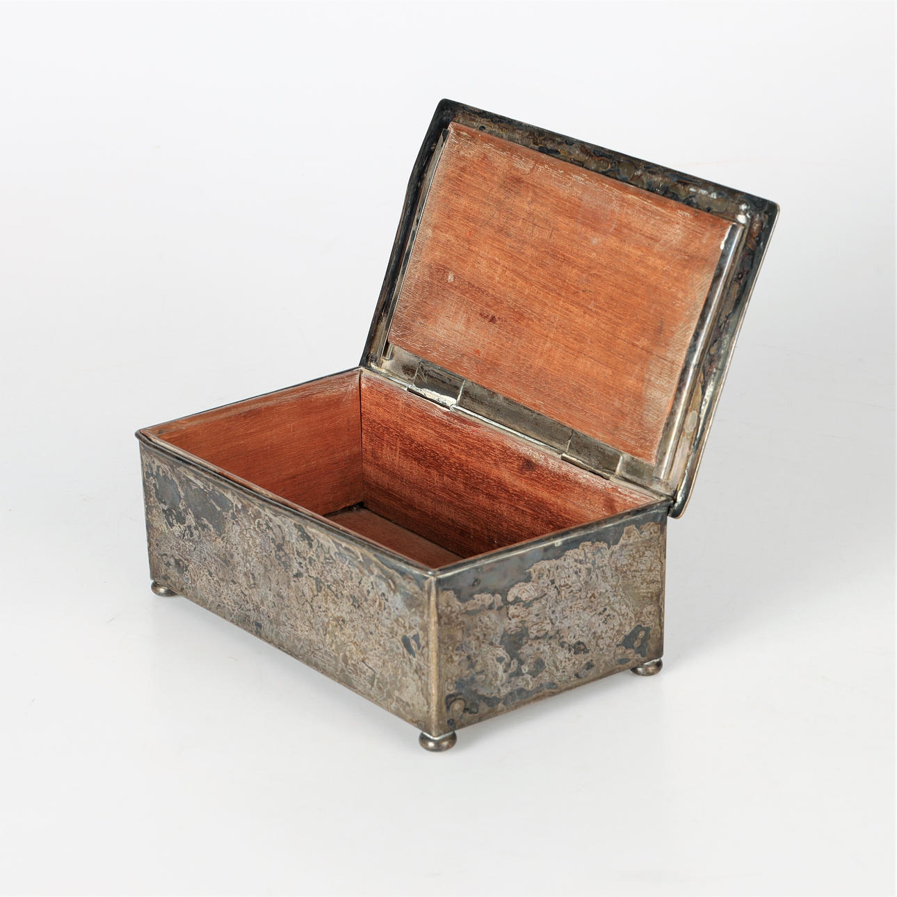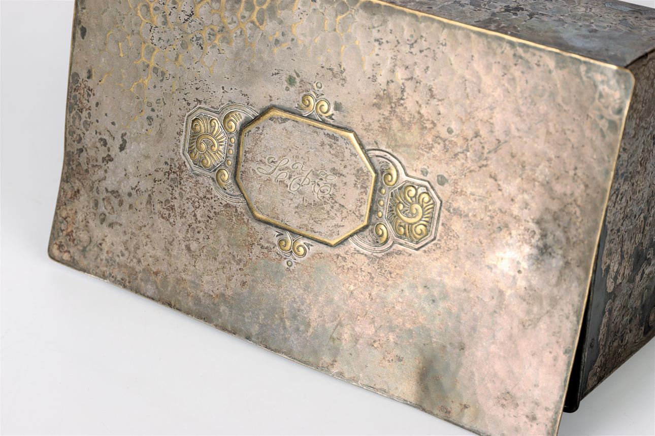 versilbertes Messing, innen Holz. Monogramm auf dem Deckel.