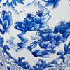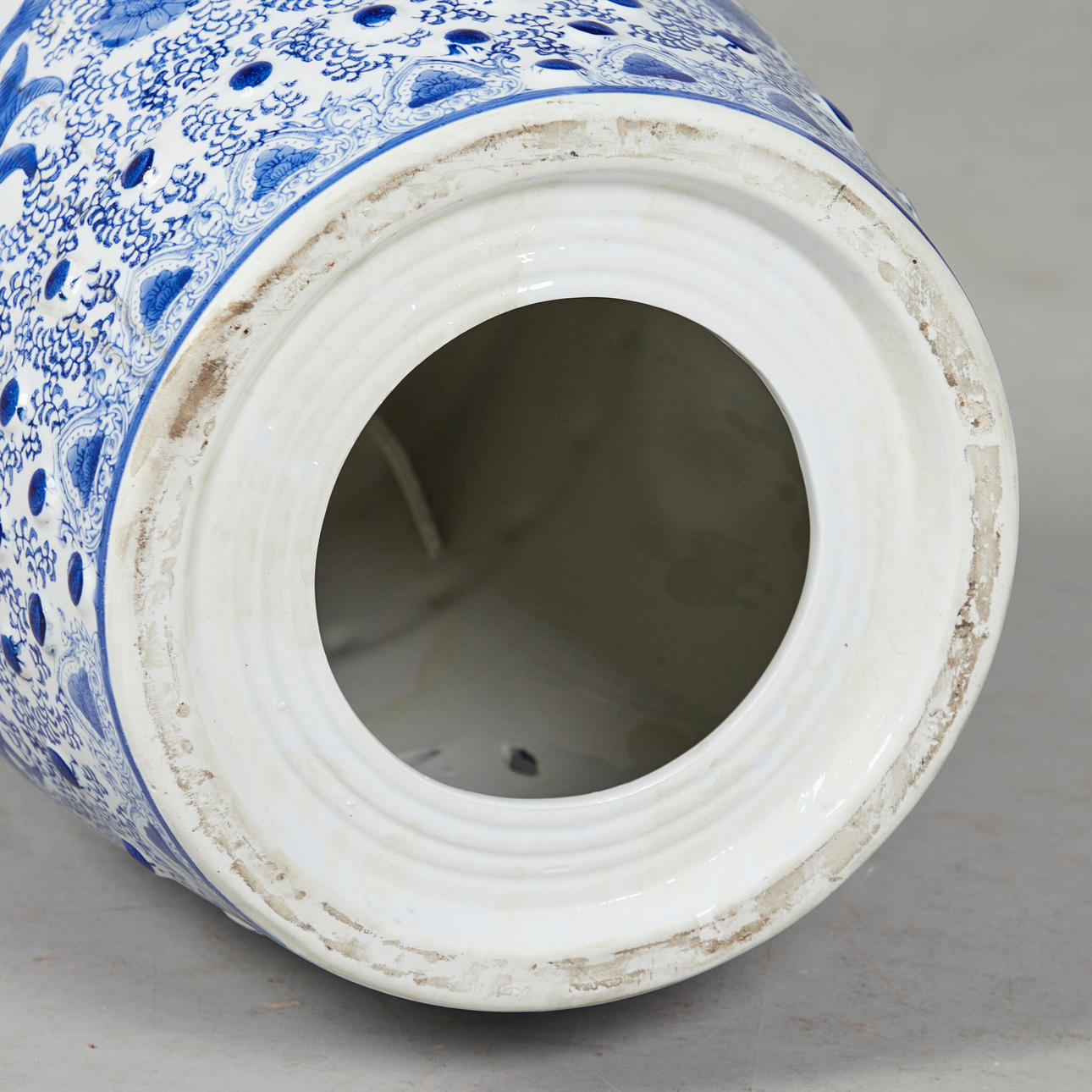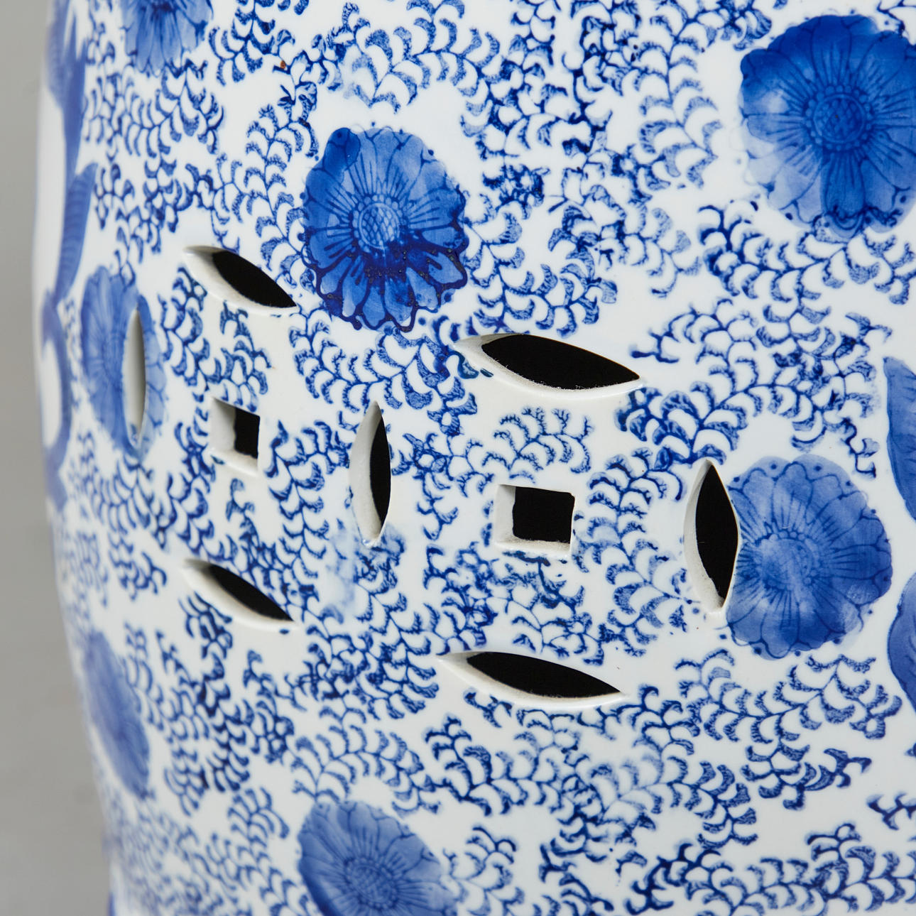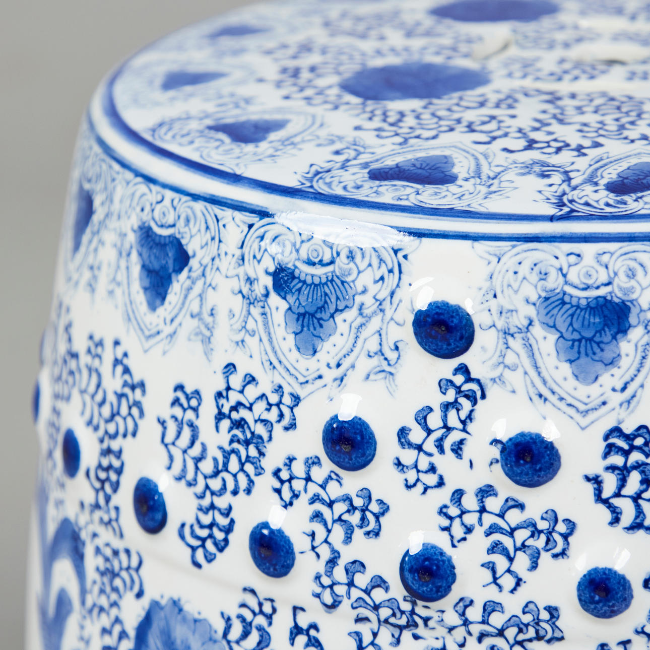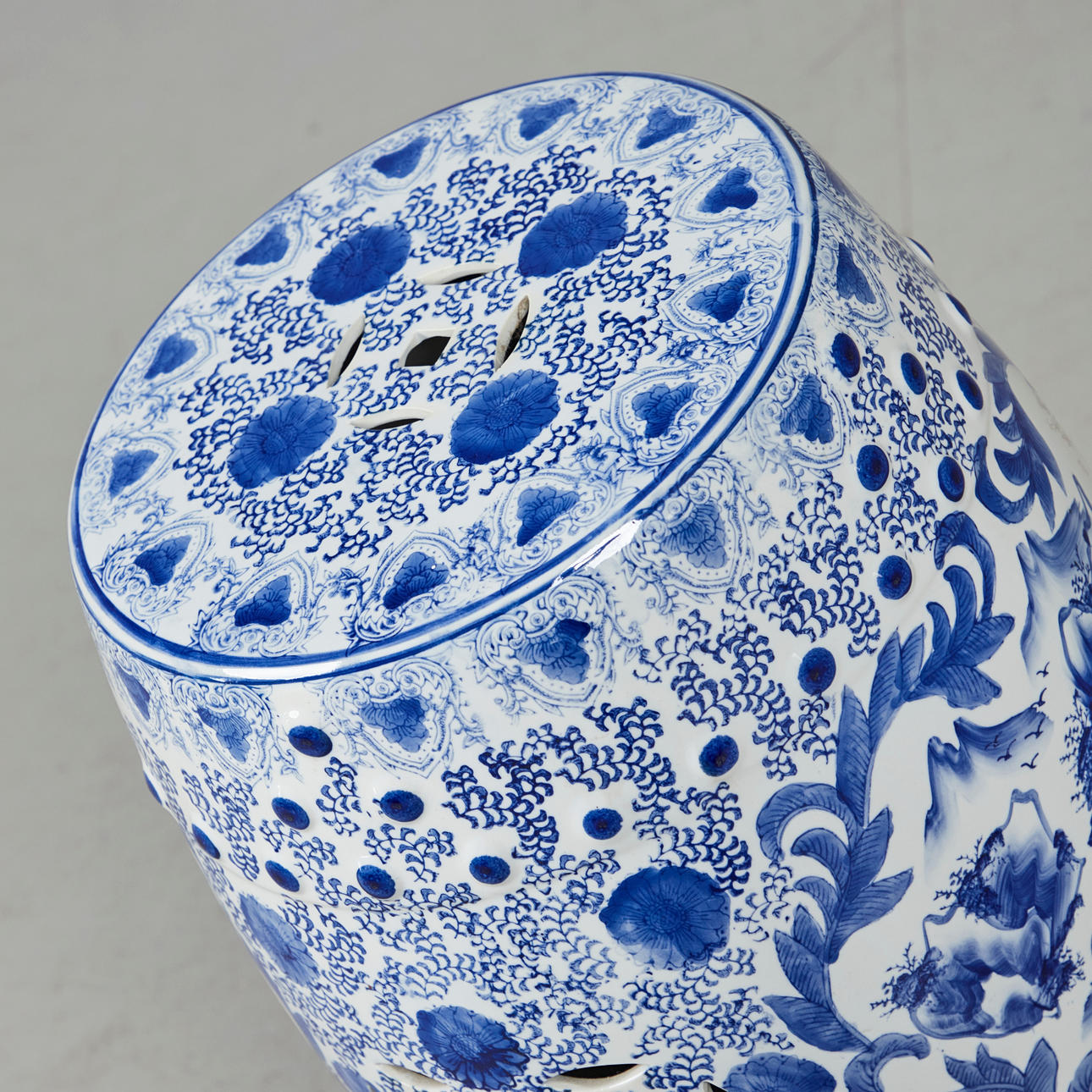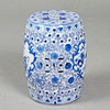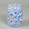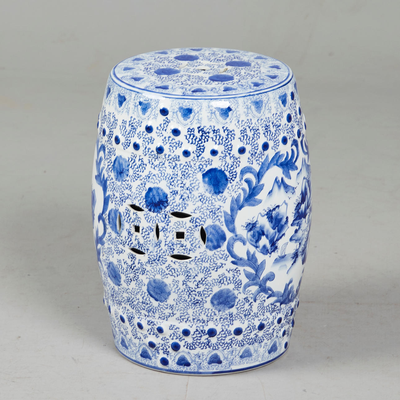 Gartenmöbel / Hocker, Porzellan, China. Runder Sitzhocker aus Porzellan mit handbemalter Dekoration in Unterglasurbau, diese in Form von Medaillons mit Landschaftsdarstellungen umgeben von Päonien, mit Aussparungen in Form stilisierter Münzen versehen, H.46cm, D.32cm.