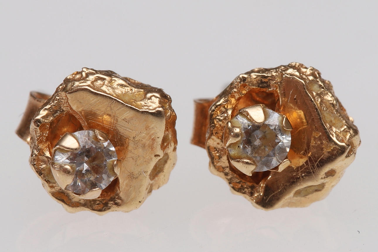 Ring, "Wildland", Guld Carlsén Ab, 18 Karat Gold und kleiner weißer Saphir von ca. 0,01 ct. Ringgröße ca. 17,45 / 56, Gewicht 3,1 Gramm Ohrringe, sogenannte Ohrstecker, 18 Karat Gold mit je einem Zirkonia von ca. 0,05 ct. Maße ca. 6x6 mm, Gewicht ca. 1,1 Gramm.