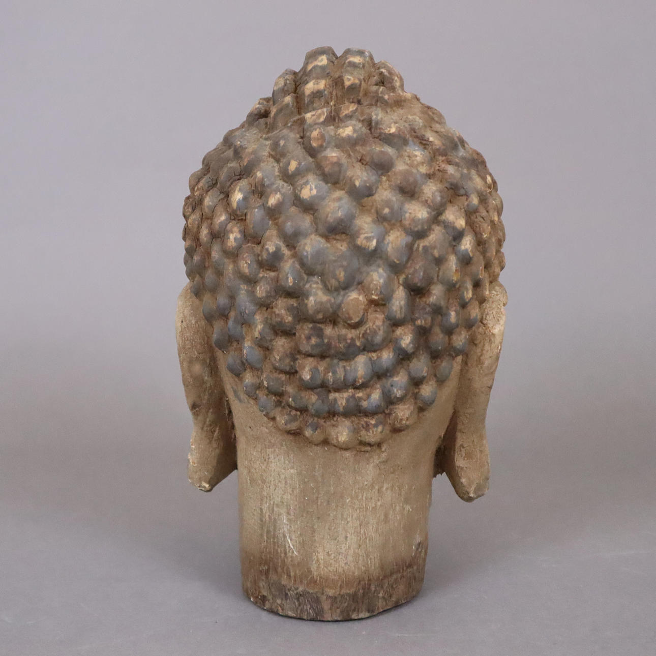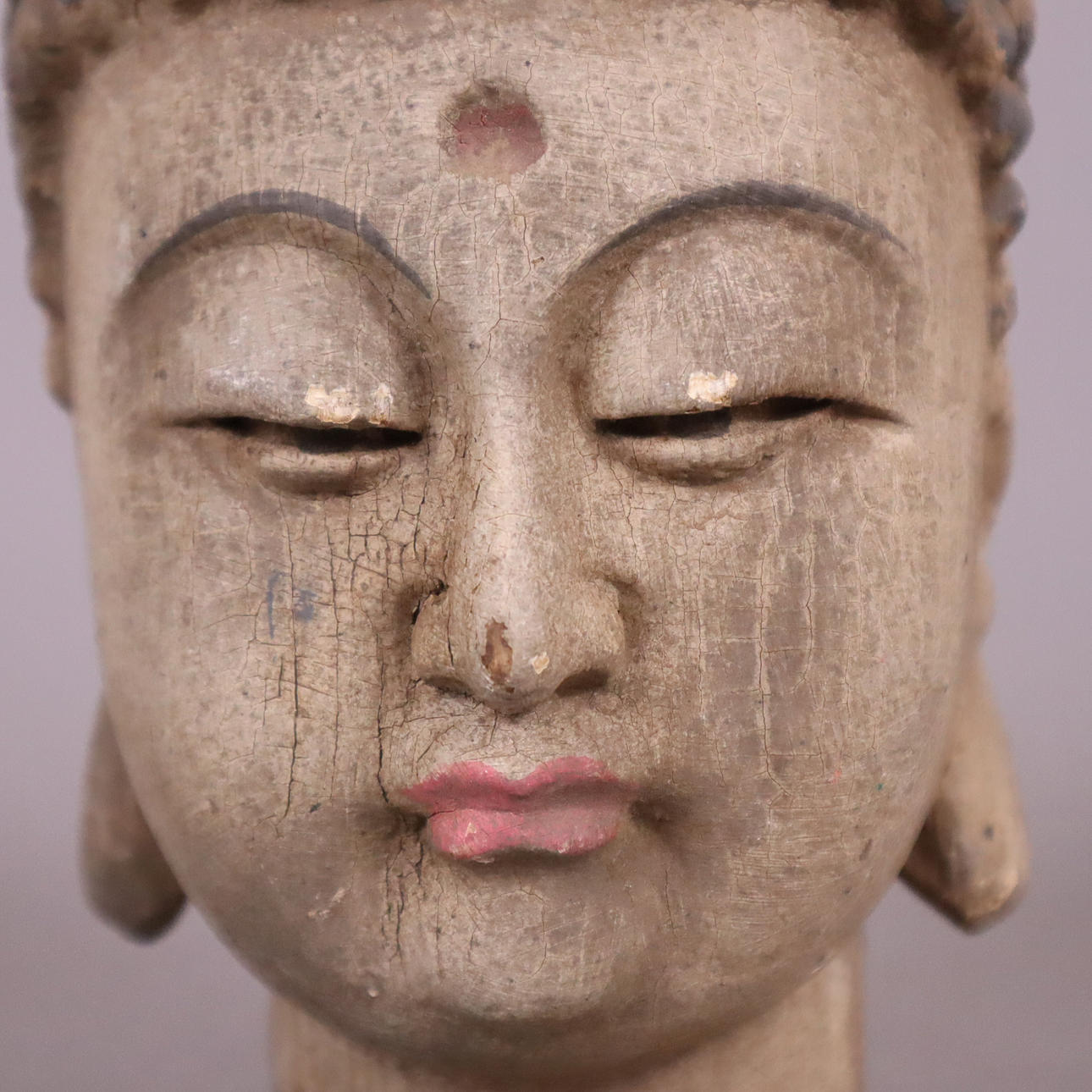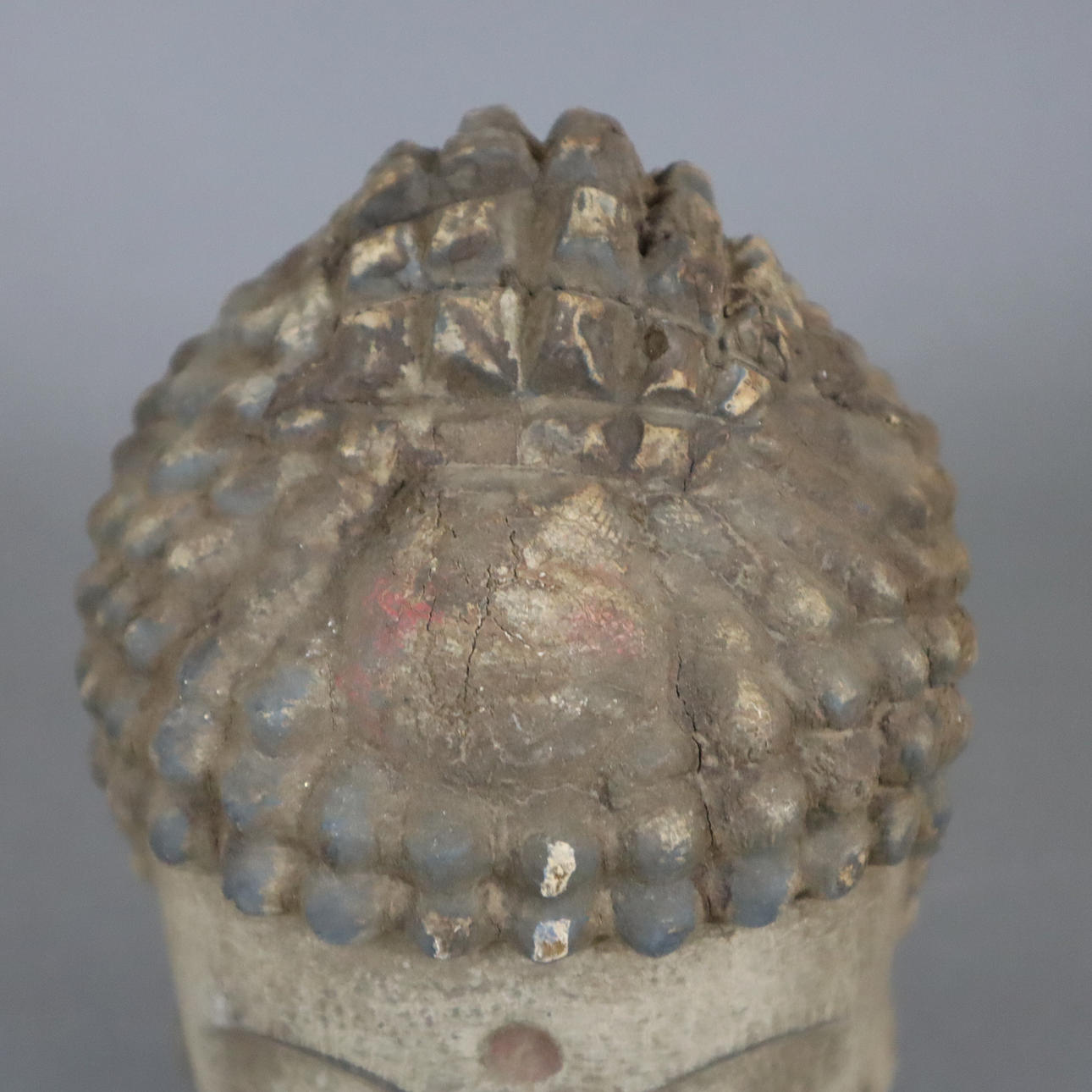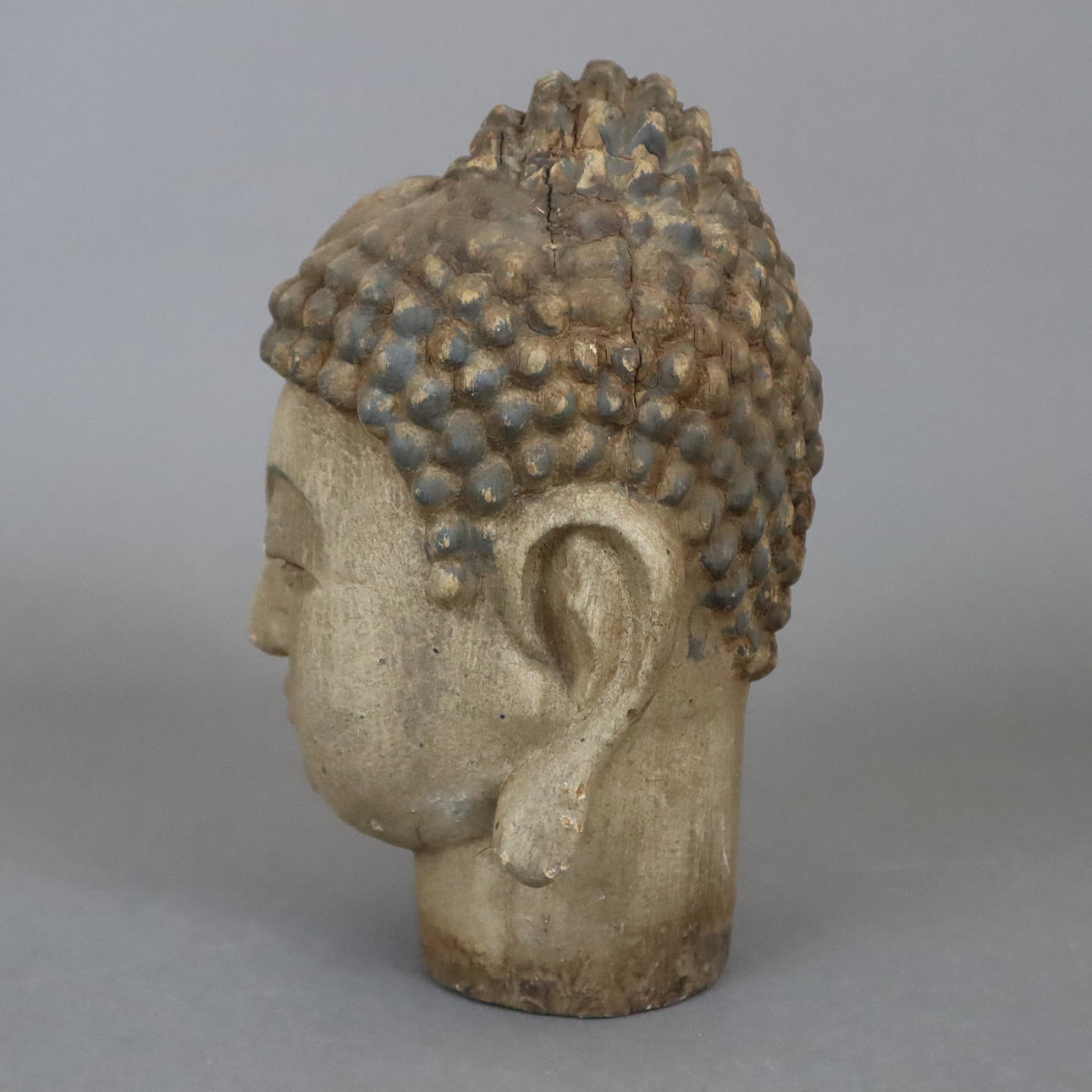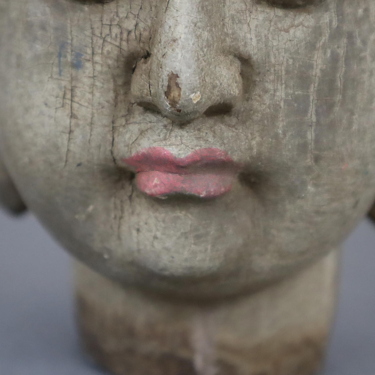 geschnitzt und farbig gefasst, vollplastisch gearbeitet, Kopf mit leicht geöffneten Augen und sanft lächelnden geschwungenen Lippen, H. ca.23,5 cm.