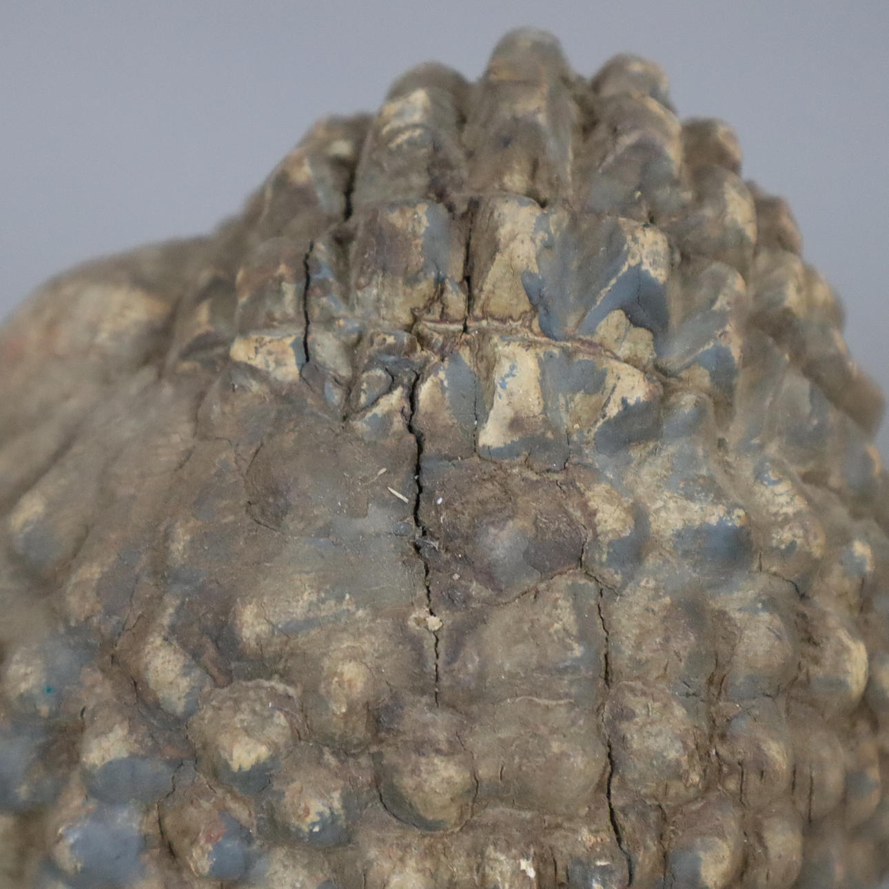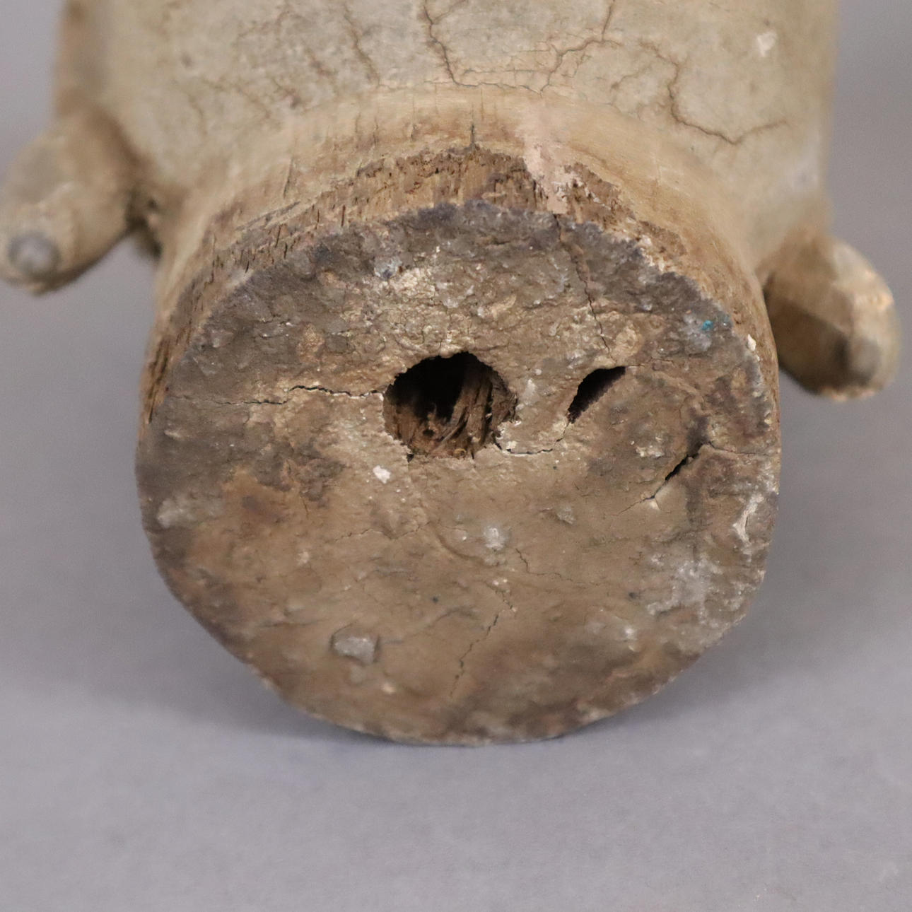 Altersspuren, leichte Risse, Fassung- und Substanzverluste, Hals unterseitig mit Bohrloch und Spalten.