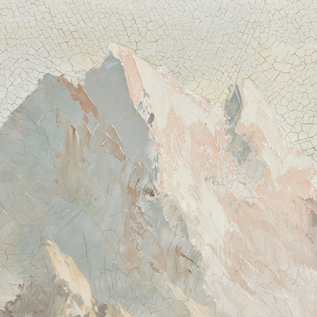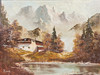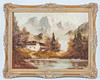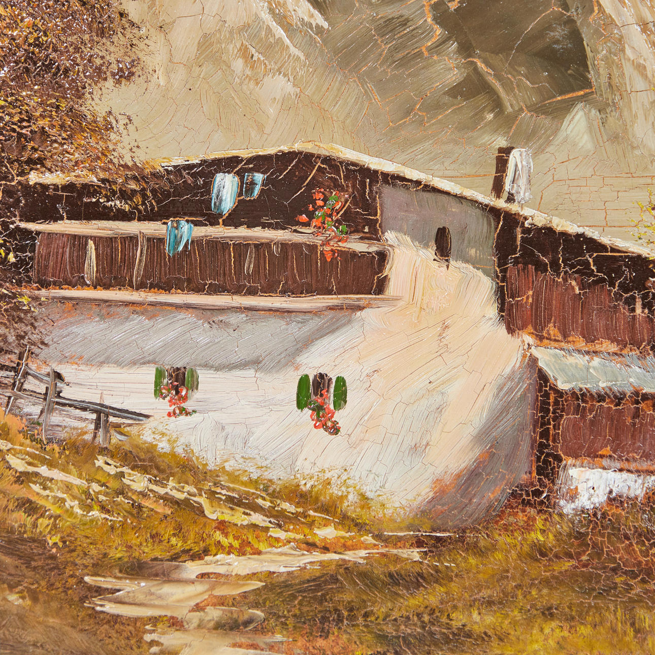 Jo Wirtz, Gemälde, 'Sonnenspitze', Öl auf Malplatte. Darstellung eines alpinen Exterieurs mit einem Haus an einem Gewässer im Vordergrund vor einer bewölkten Bergkette, unten links signiert, sowie rückseitig mit Klebeetikett versehen, 59x79cm (78x97cm).