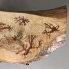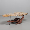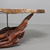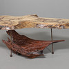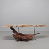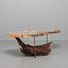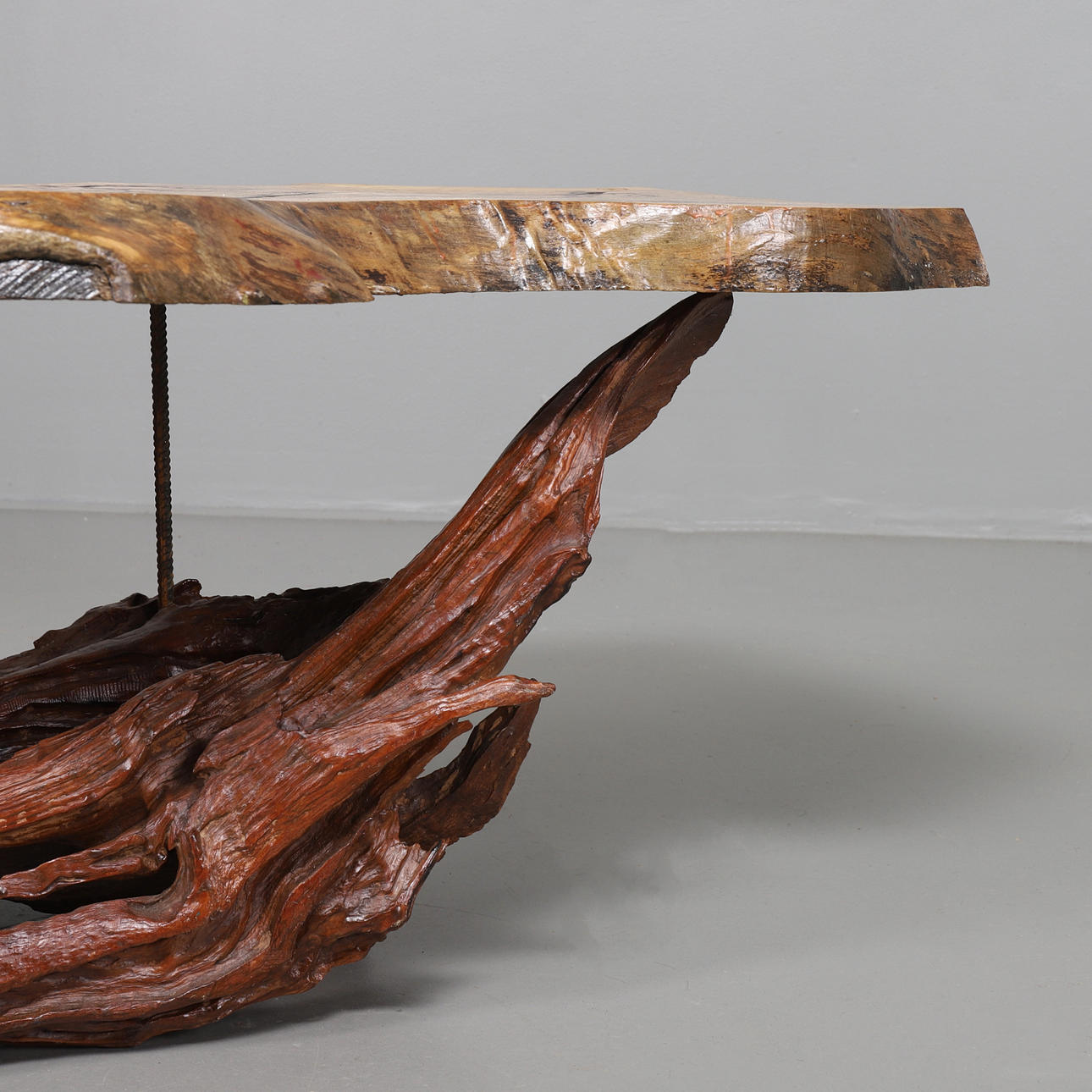 Platte aus massiver Eiche, die in die Form des Baumes gesägt ist, Basis aus Treibholz und Armierungseisen. Länge ca. 155 cm, größte Breite 73 cm, Höhe 56 cm.