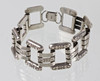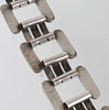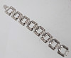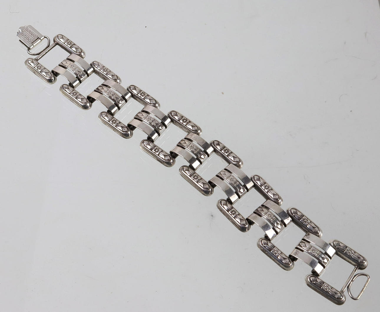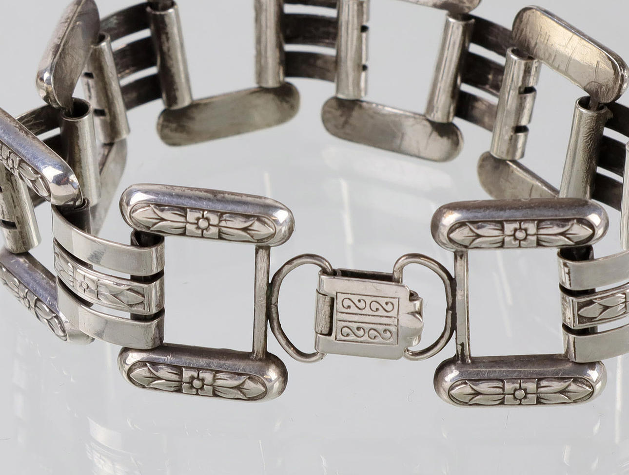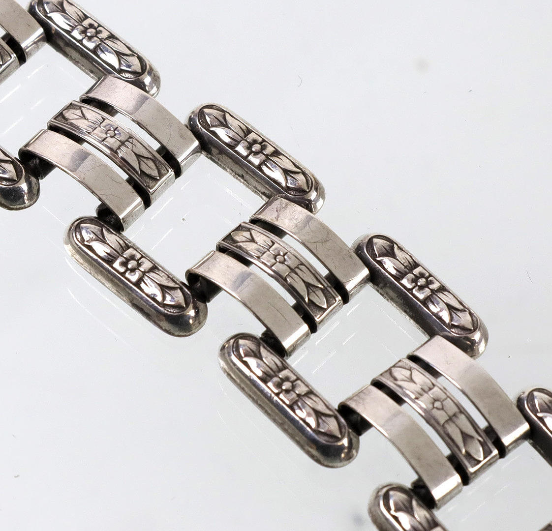 Die acht für den besseren Tragekomfort leicht gerundeten Glieder sind offen gearbeitet und mit feiner geometrischer Floral Gravur verziert. Ebenso sind die dreifach angeordneten Bogenbänder Zwischenstücke im Wechsel verziert. Das Armband erhält somit eine fließende Beweglichkeit und fühlt sich beim Tragen geschmeidig an.