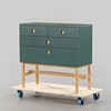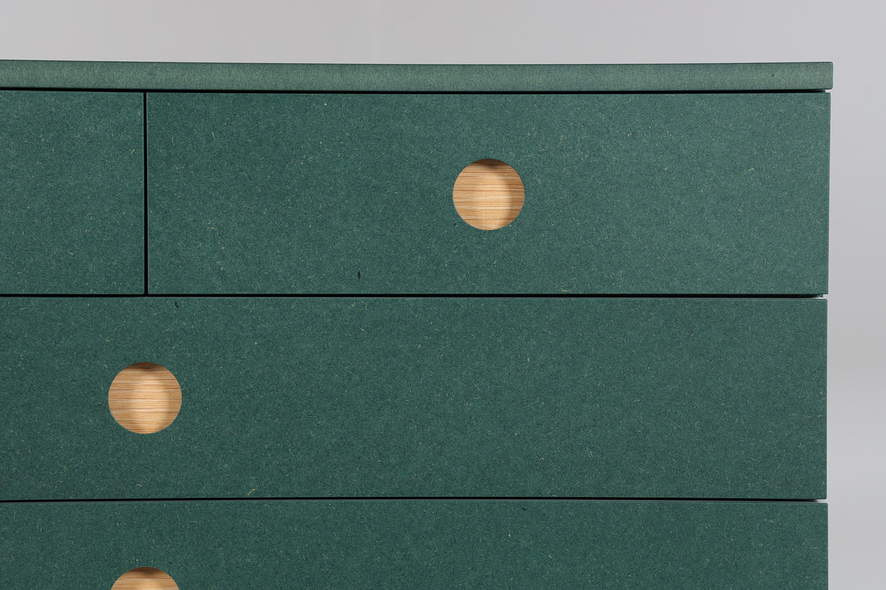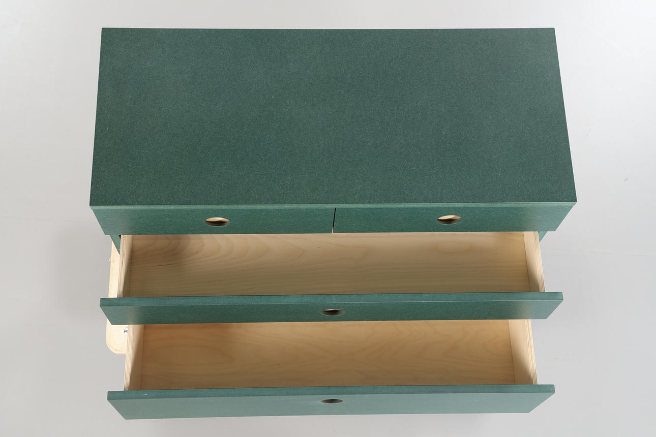 grünes MDF mit Sockel und Details in weiß geölter Eiche, 4 Schubladen, Höhe ca. 91,95x40 cm.