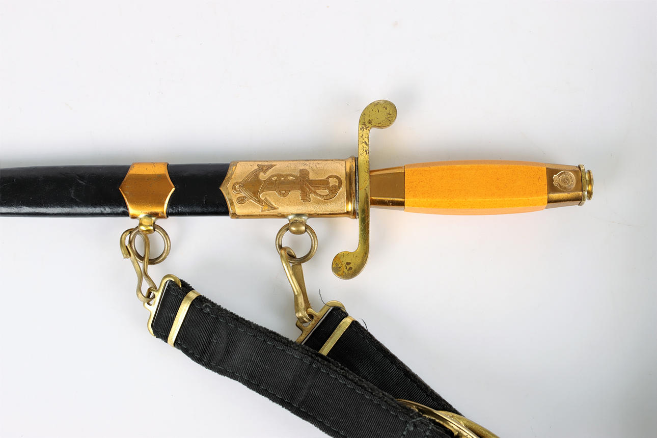 Zeremonielles Marineoffiziersabzeichen mit Uniformgürtel für Winteruniform, Sowjetunion 1972. Nudelholz mit Messingbeschlägen, die mit UdSSR-Emblem und Sternsymbol gestempelt sind.