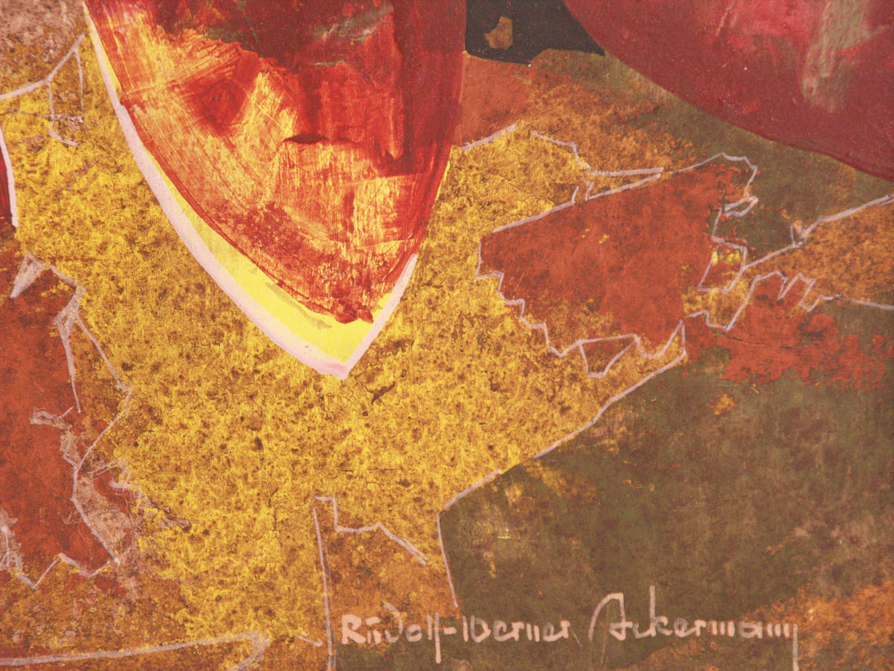 Ackermann, Rudolf Werner (Wuppertal 1908 - 1982 Düsseldorf. Studium an der Kunstgewerbeschule in Wuppertal und der AK Düsseldorf) - "Herbst", aus dem Jahreszeitenzyklus, Öl auf Holzfaserplatte, unten rechts signiert "Rudolf-Werner Ackermann", rückseitig betitelt, ca.60x50cm, gerahmt.