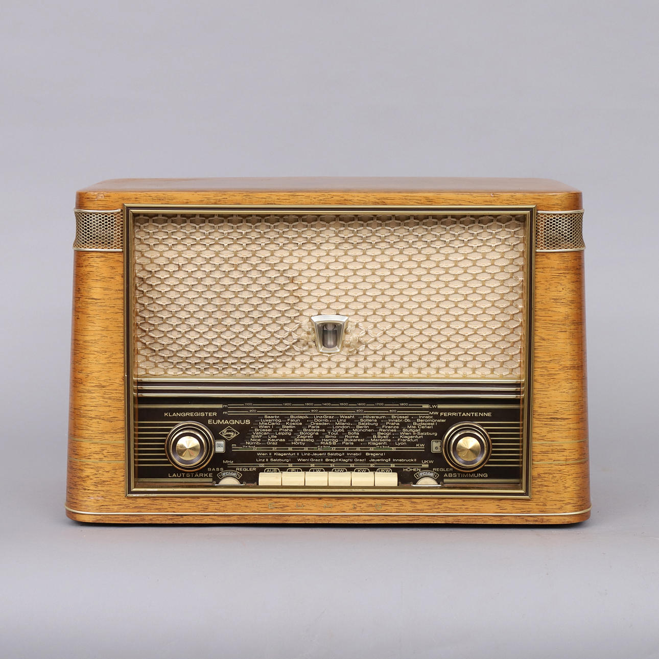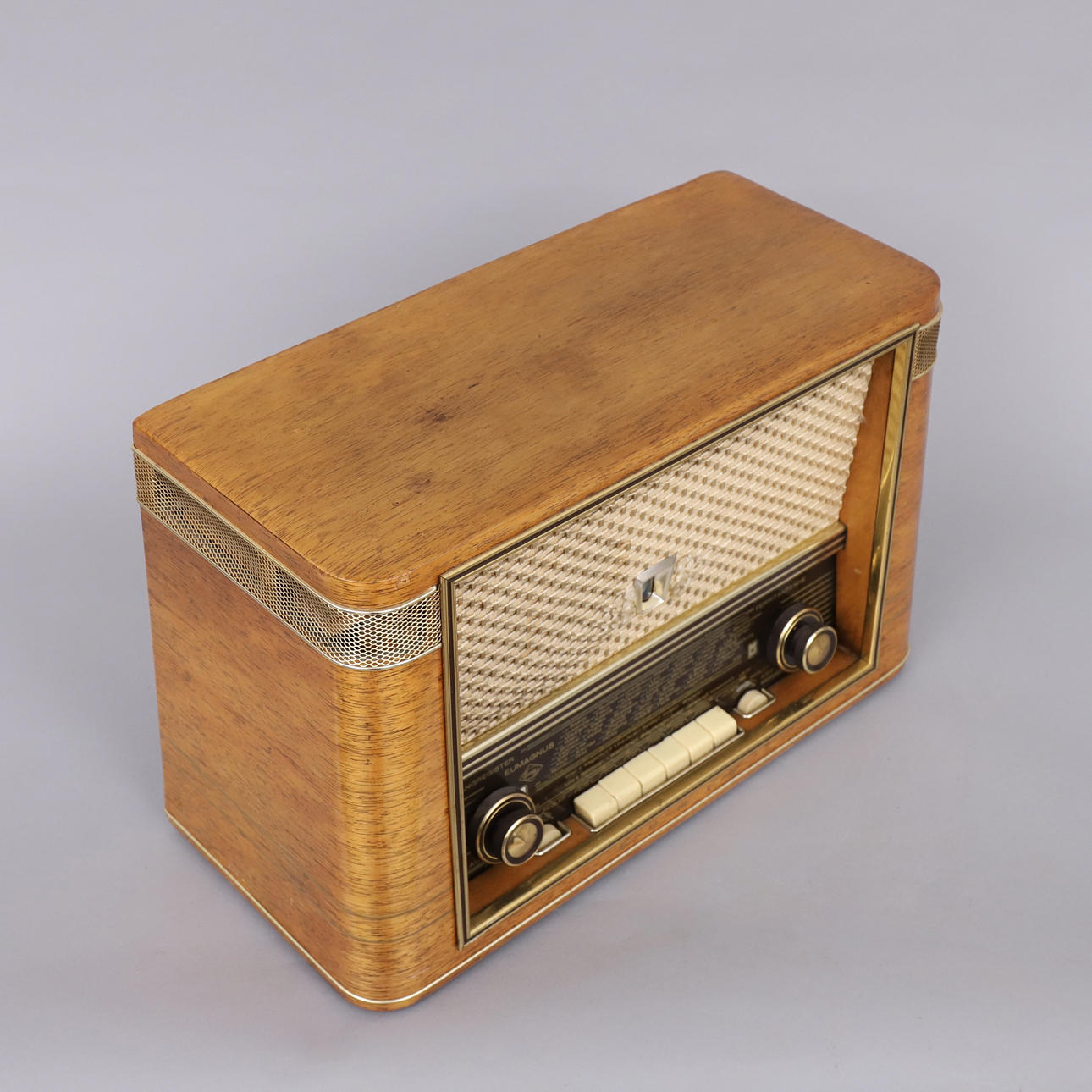 Eumig Eumagnus 383W, Gehäuse in Mahagoni. Maße: Breite 53, Tiefe 23,5, Höhe 34 cm.