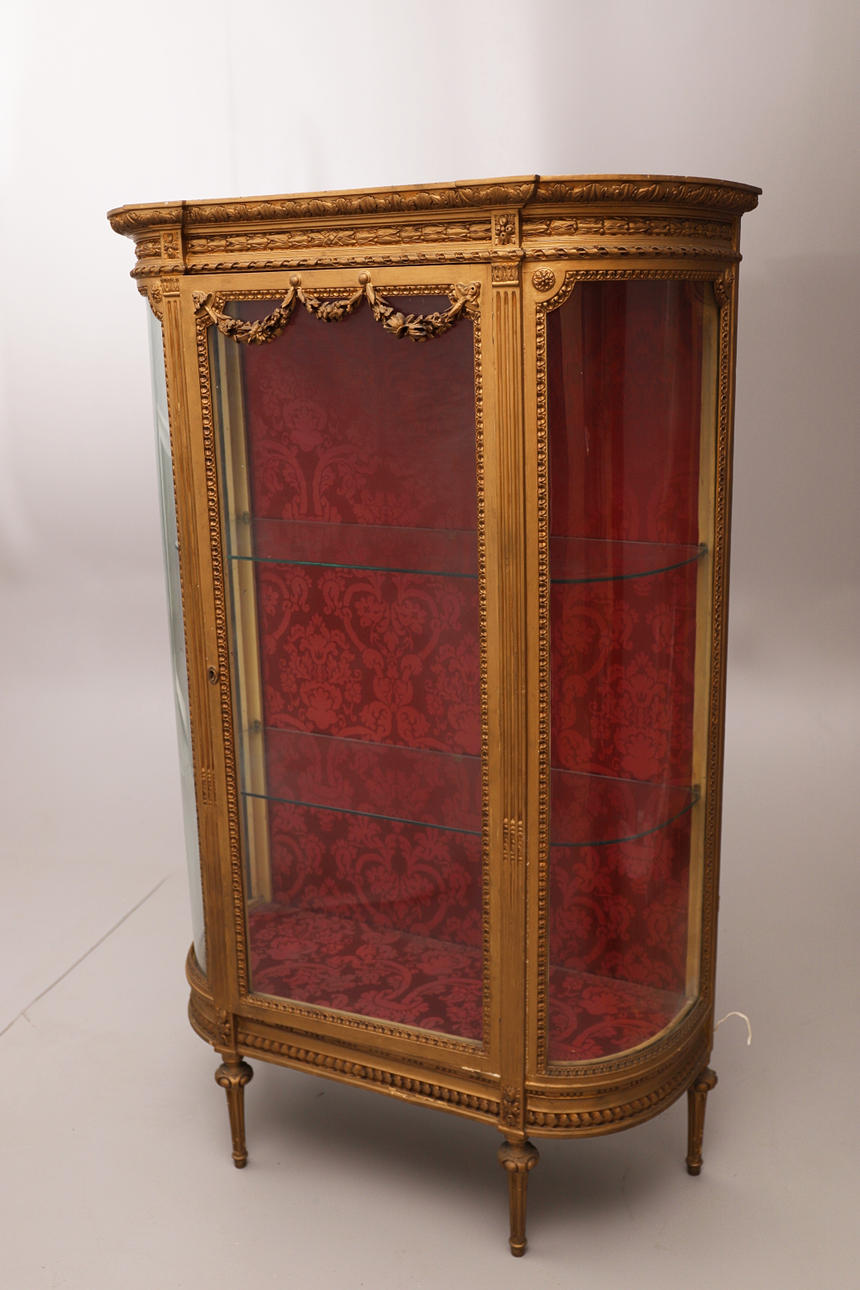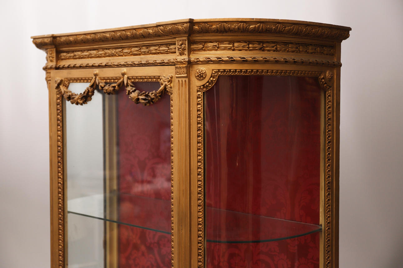mit drei Ebenen aus kupfervergoldetem Holz, mit Damastseide bezogen.