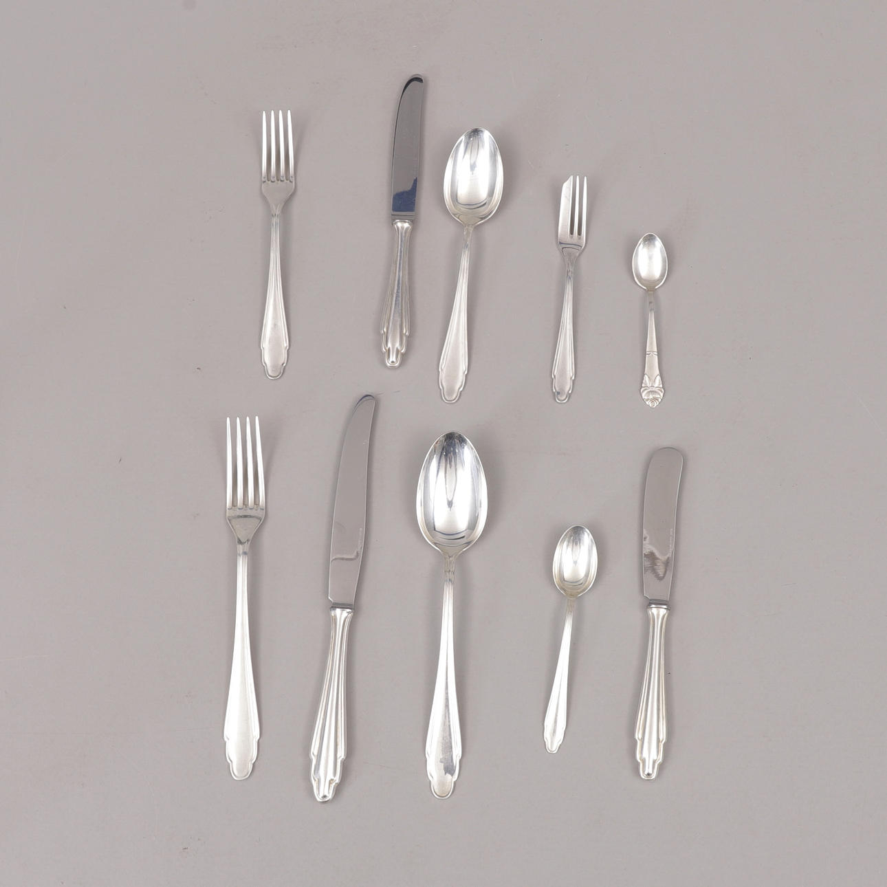 Menügabeln, 12-tlg. Messer, 12-tlg. Löffel, 12 Stk. Gabeln, 12-tlg. Messer, 12-tlg. Löffel, 12 Stk. Kaffeelöffel, 11 Stk. Kuchengabeln, 6-tlg. Buttermesser, 2-tlg.
