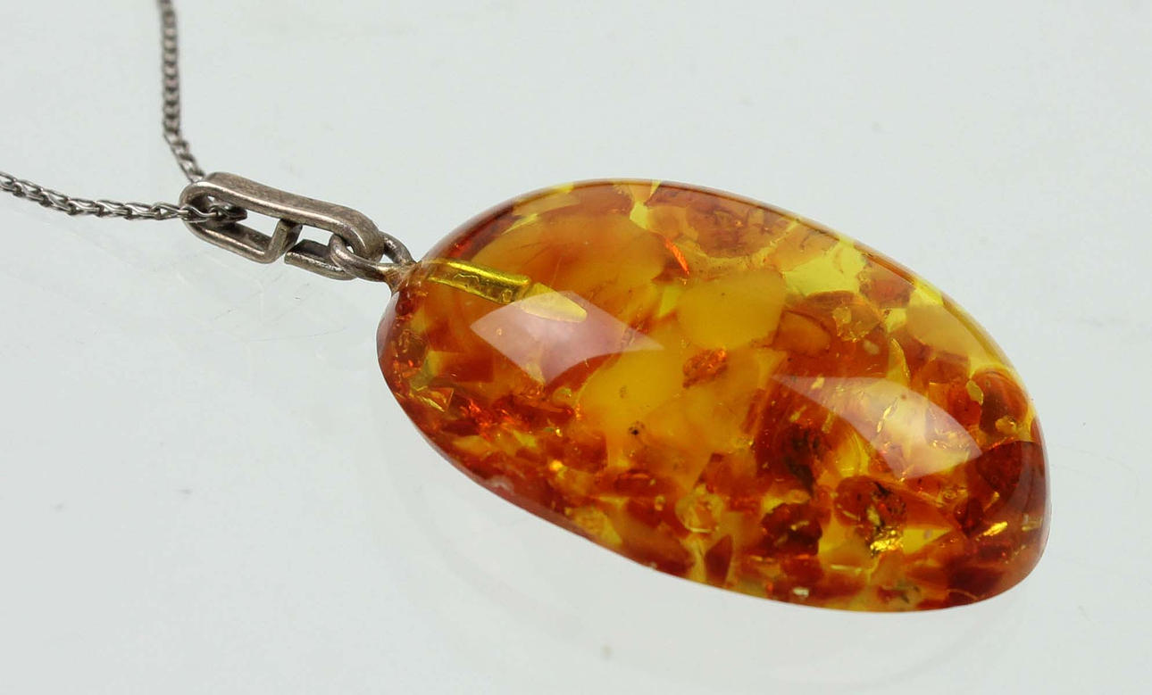 ovaler Bernstein Anhänger polierter Oberfläche. Trageöse, dort signiert für Fischland-Schmuck Ribnitz-Damgarten.