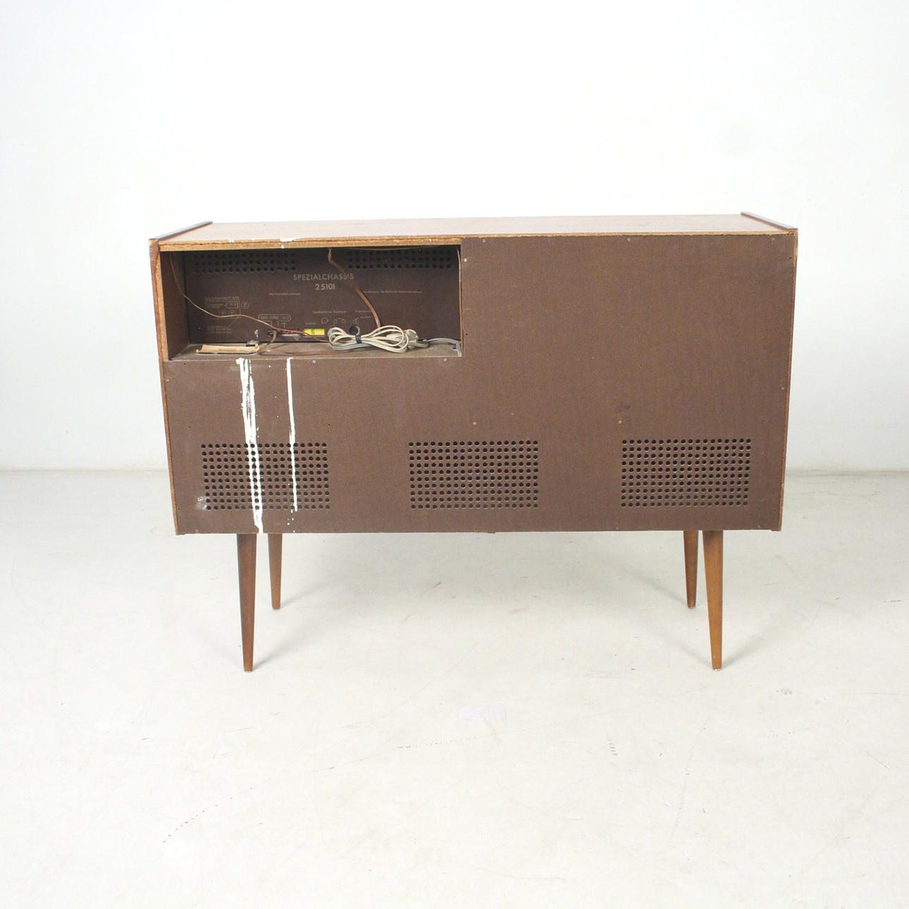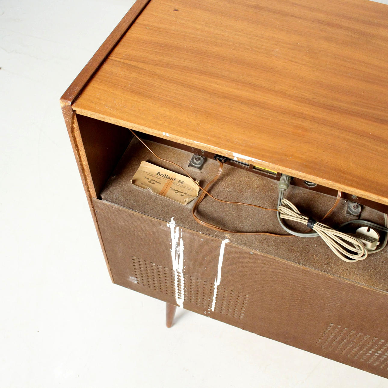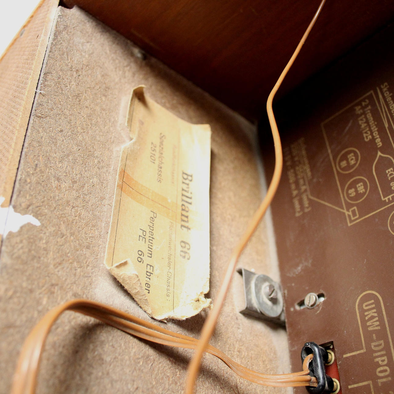 Die Musikbox wurde nicht auf Funktion geprüft. Altersgemäße Gebrauchsspuren, Kratzer, Bestoßungen, Farbflecken.
