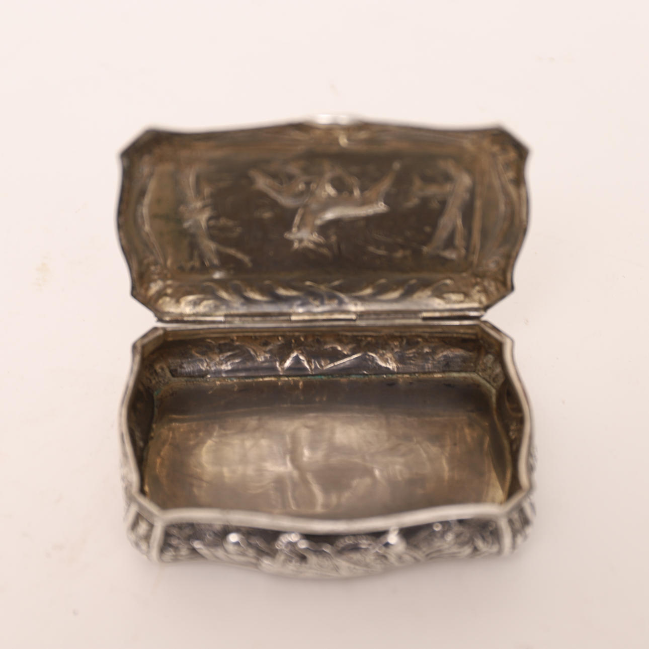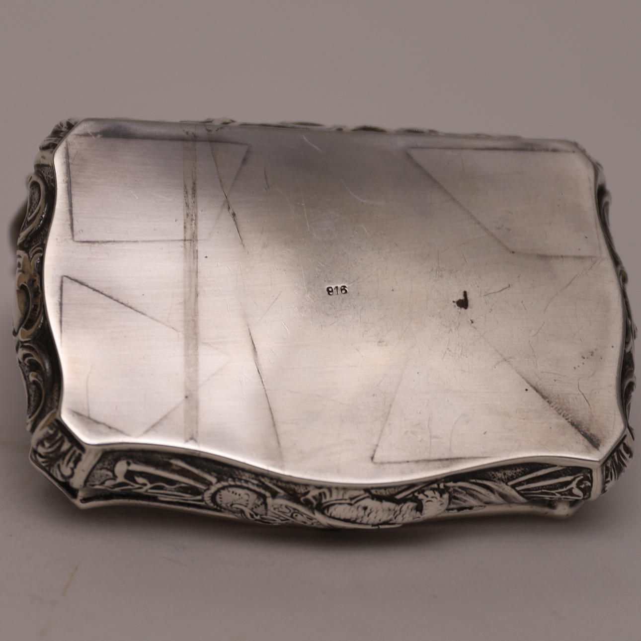 mit Hirsch- und Schriftrollenmotiven geschnitzt.
