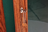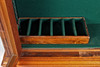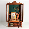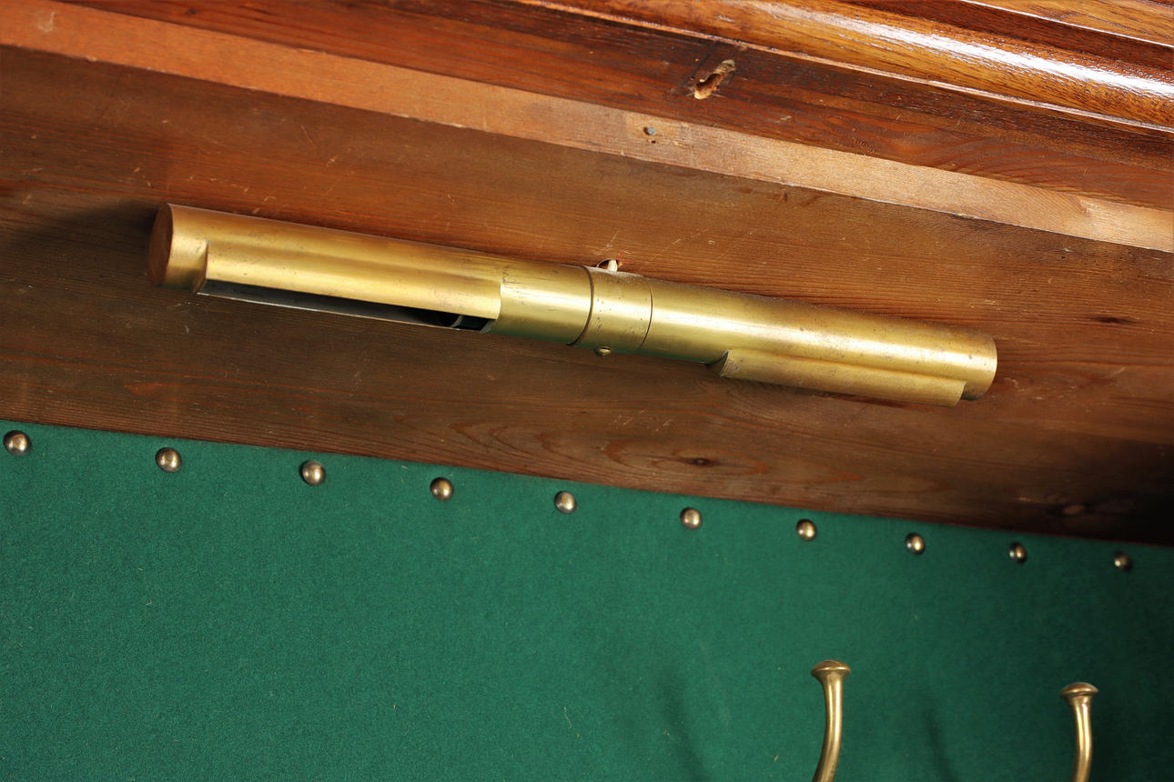 Oberteil älter als Unterteil. Beleuchtung älter, keine Funktionsgarantie gegeben. Verschleiß auf der Innenseite, Haken gerade durch den Rücken geschraubt. Altersspuren, Verschleiß, Patina.