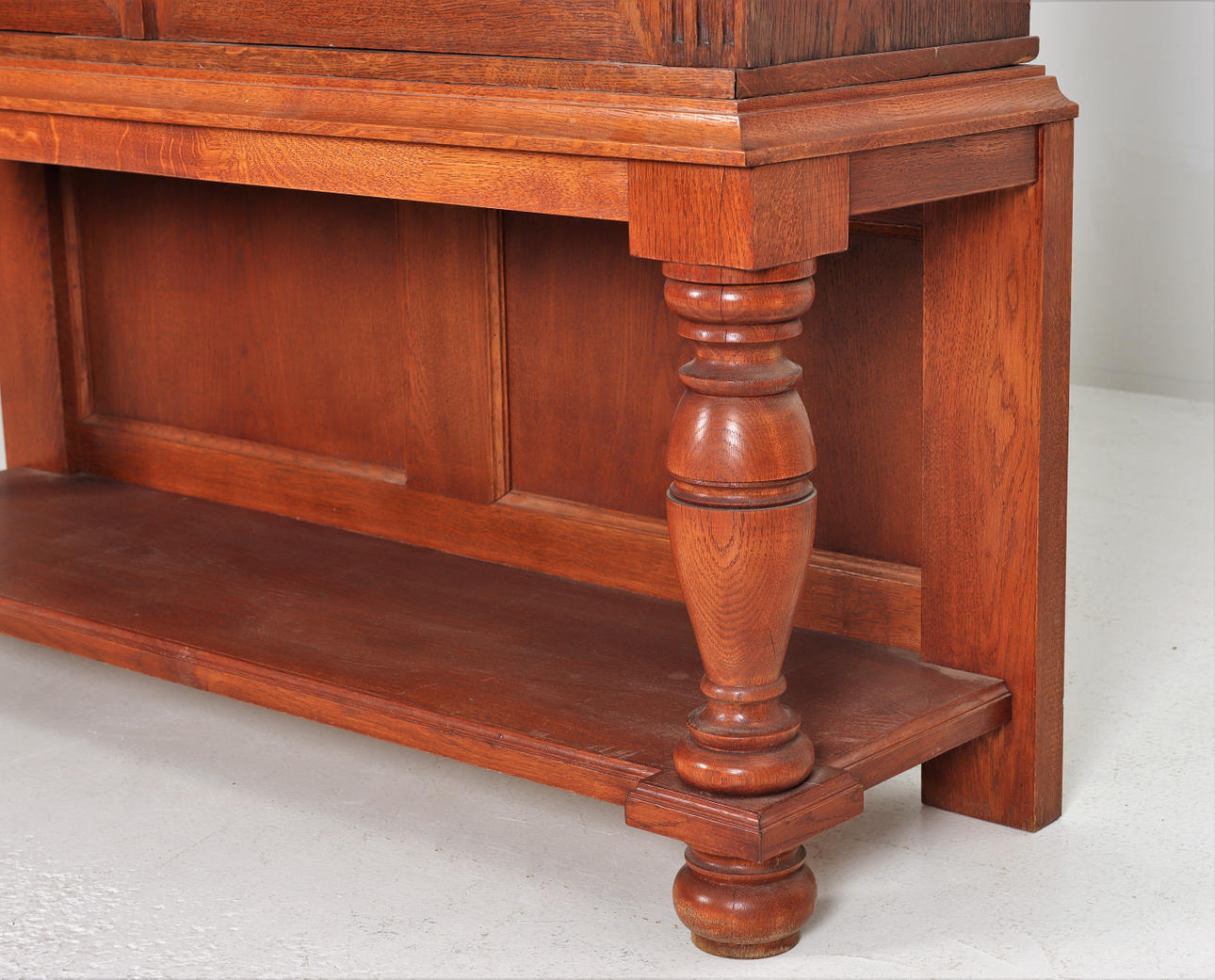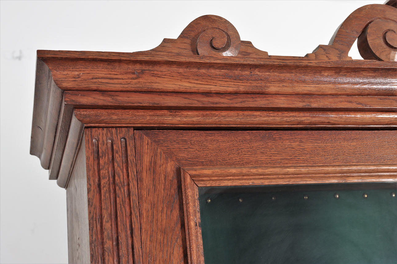 Vitrine, Waffenschrank. Zweiteilig, geschnittene, gedrechselte Eiche. Glas in den Türen. Abnehmbares Oberteil. Beleuchtung innen.