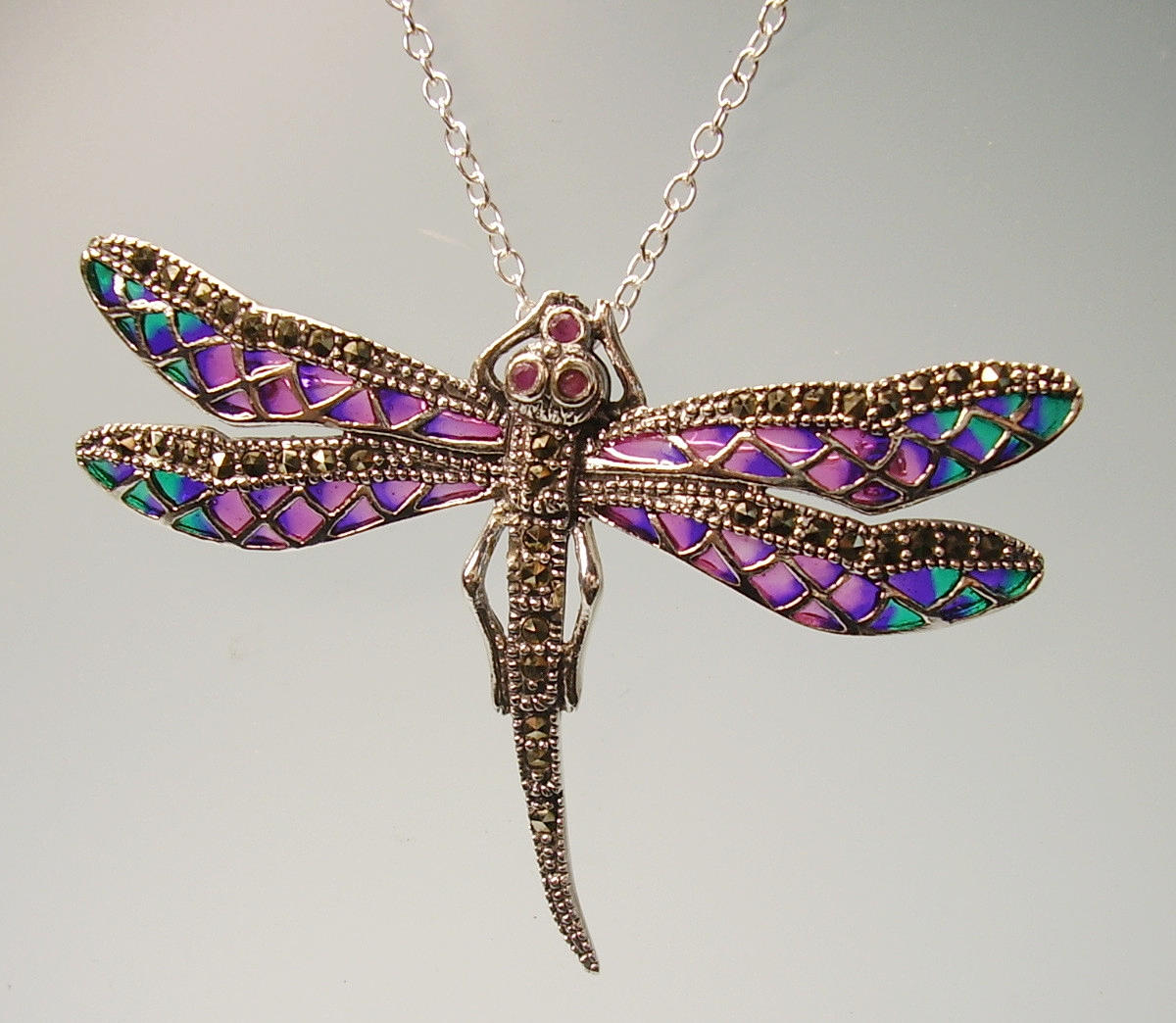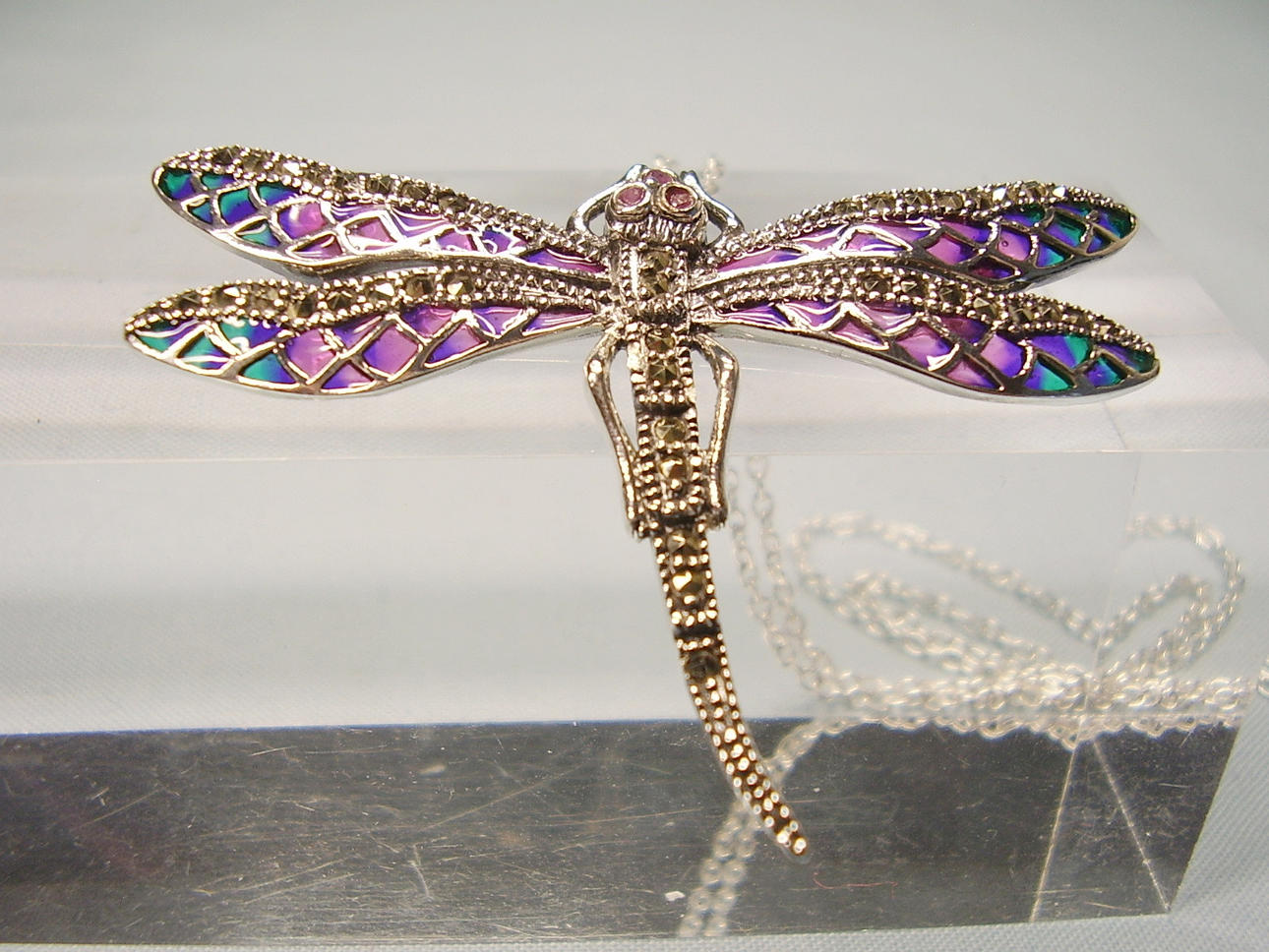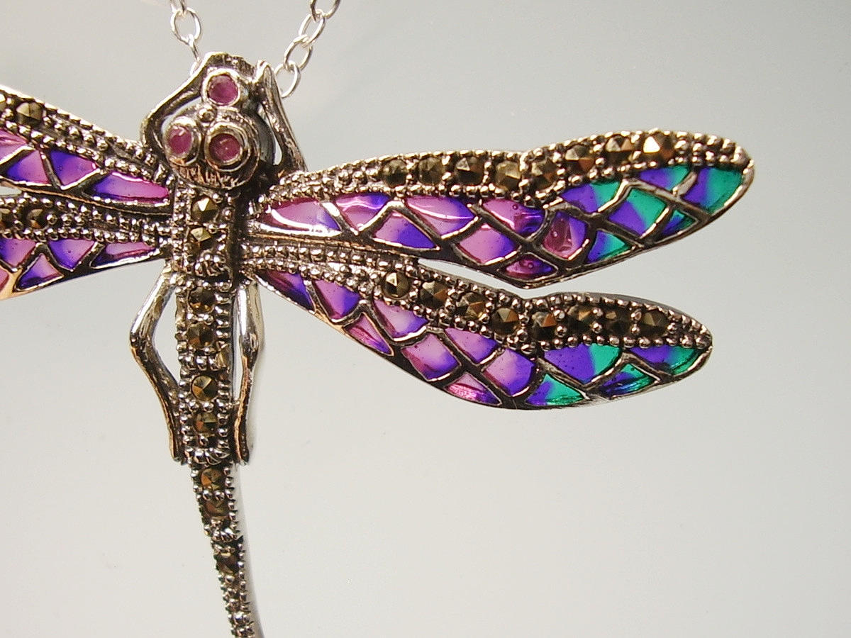 Er ist in Form einer Libelle mit ausgebreiteten Flügeln gearbeitet. Der Kopf ist mit rund facettierten Natur-Rubinen besetzt. Körper und Flügel tragen Markasiten.