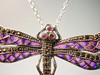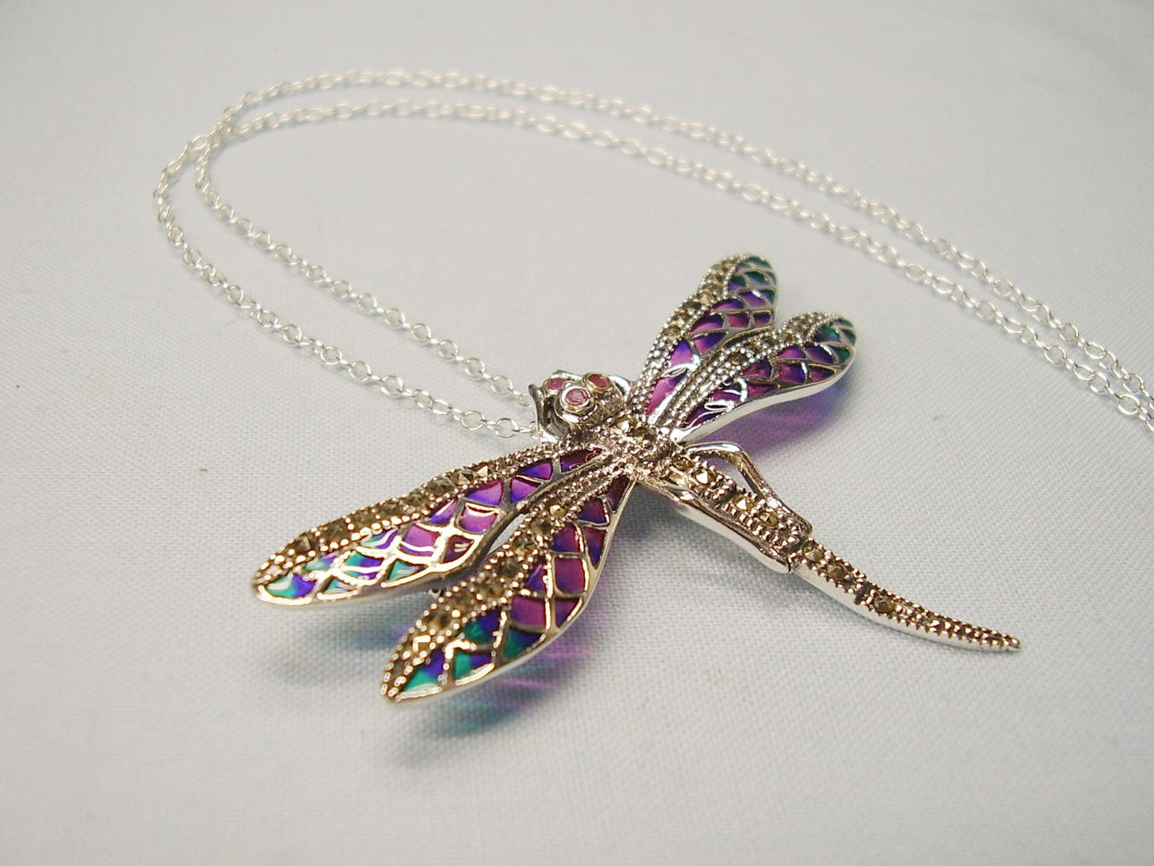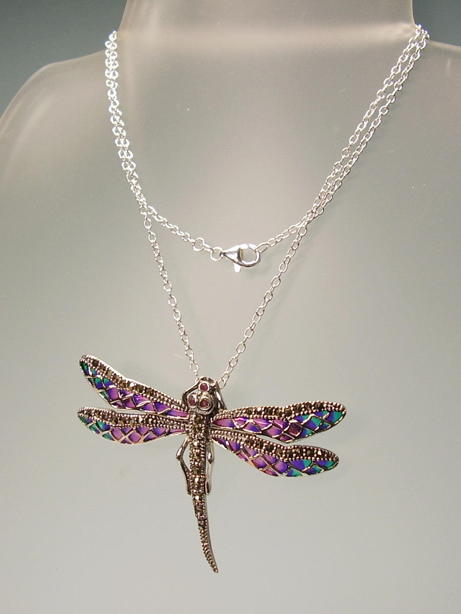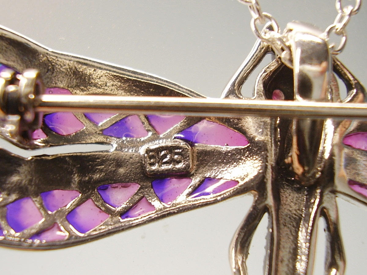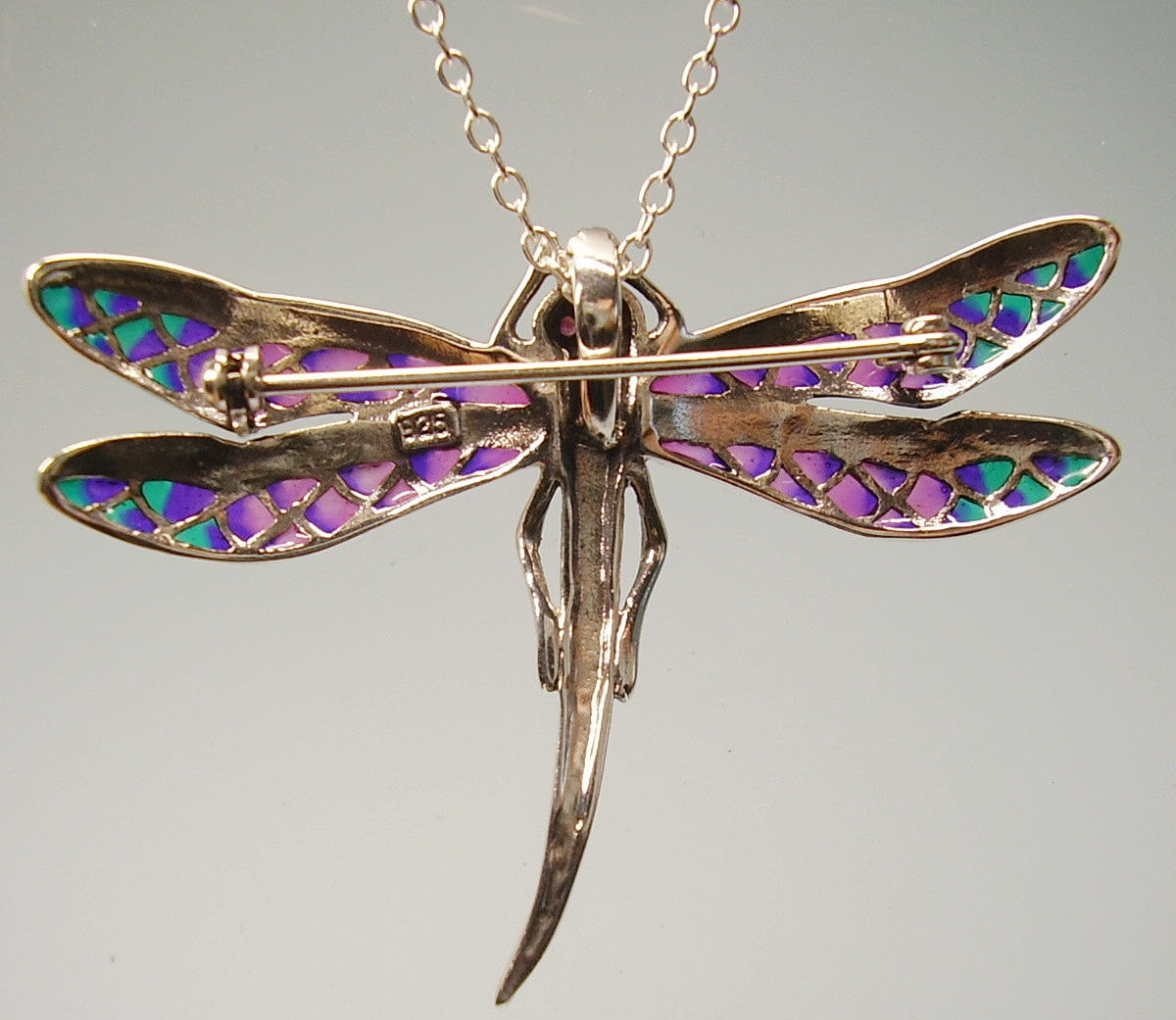 Er ist in Form einer Libelle mit ausgebreiteten Flügeln gearbeitet. Der Kopf ist mit rund facettierten Natur-Rubinen besetzt. Körper und Flügel tragen Markasiten.