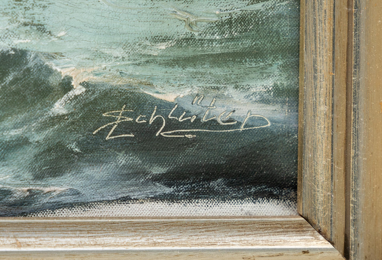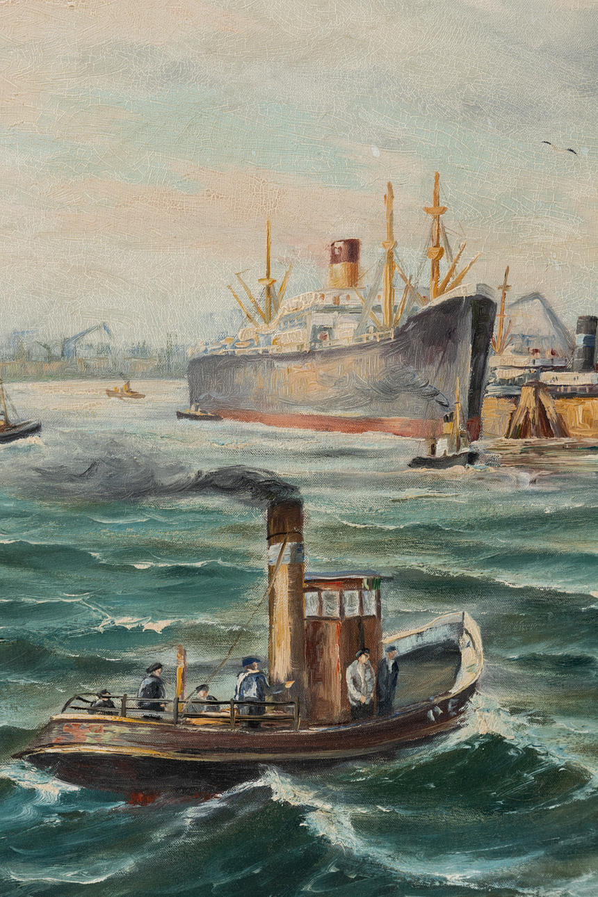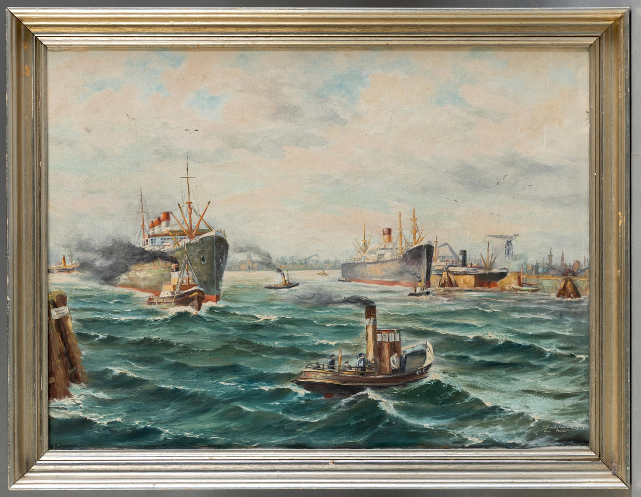 Lothar Schlüter (geb. 1928), Dampfschiffe im Hafen, Öl auf Leinwand, signiert, ca. 60 x 80, mit Rahmen ca. 70 x 90 cm.