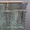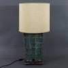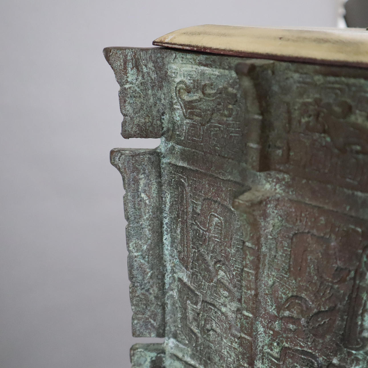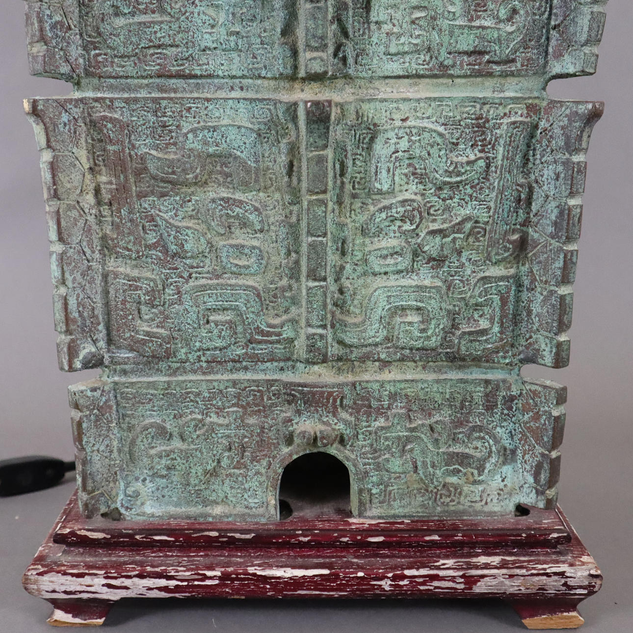 Fangyi-Gefäß (ritueller Weincontainer) mit ornamentalem Reliefdekor als Fuß, Gelbbronze mit grüner Patina, Holzsockel, höhenverstellbar, 2 Fassungen, Stoffschirm, China, H.ca. 57 cm, Gewicht ca.24 kg.
