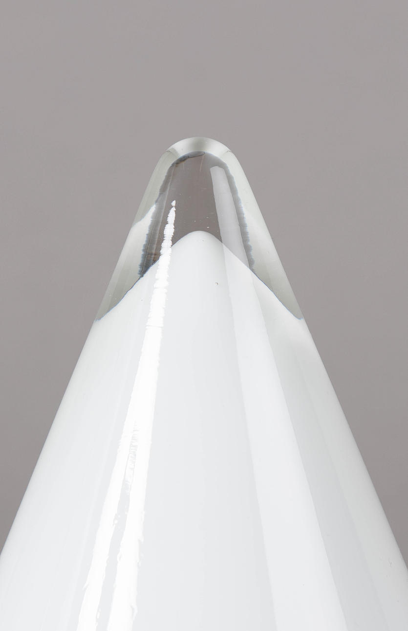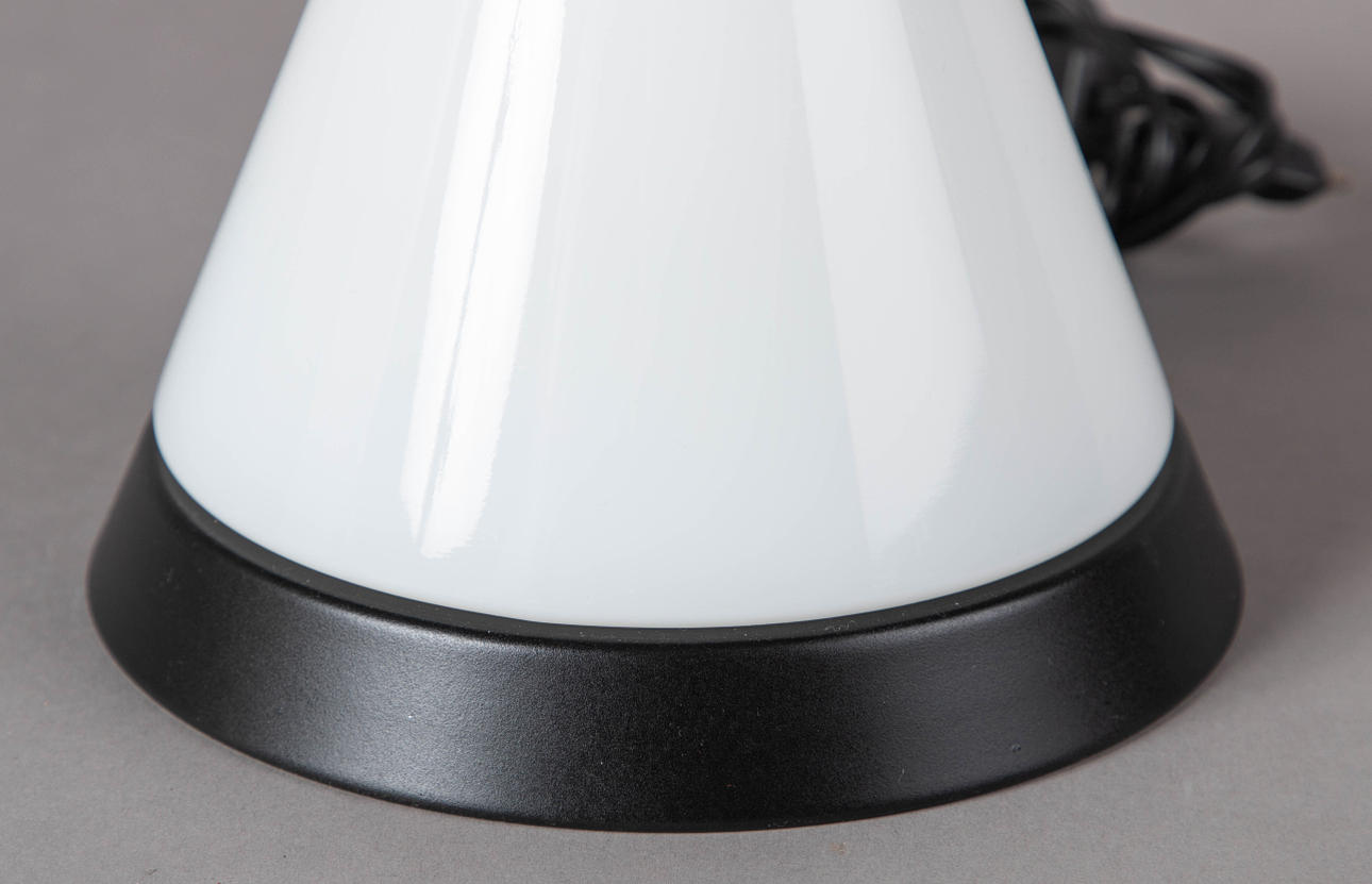 Tischlampe "Kibo" von Peill & Putzler. Weißes Opalglas in Kegelform mit durchscheinender Spitze. Schwarzer Metallsockel.