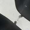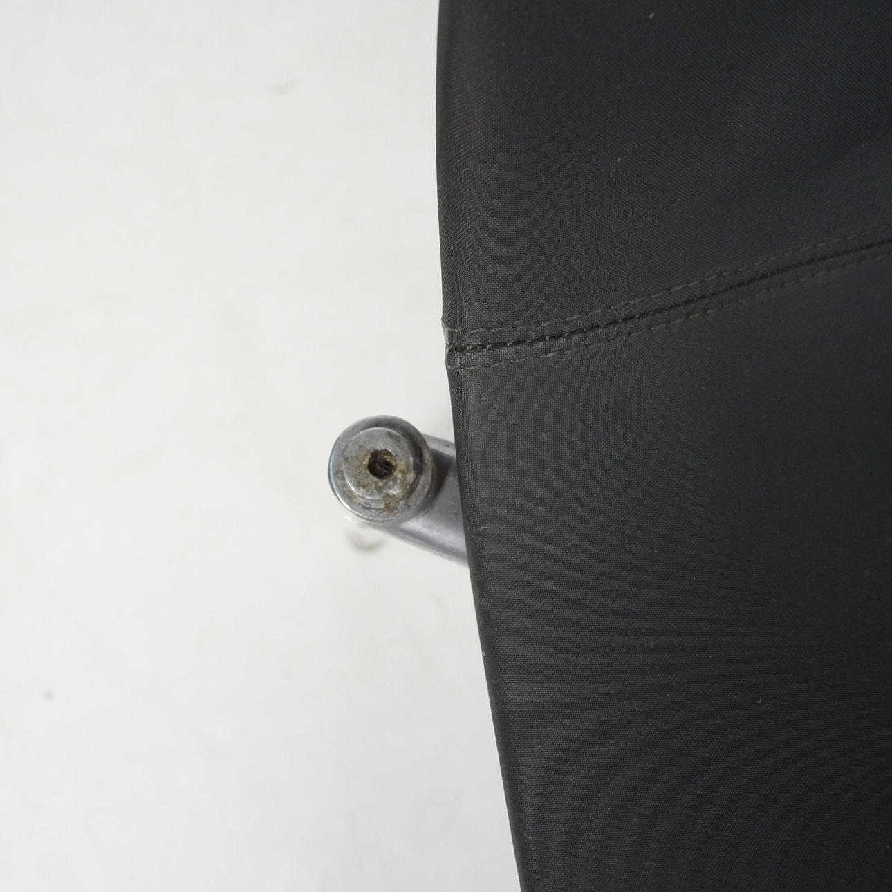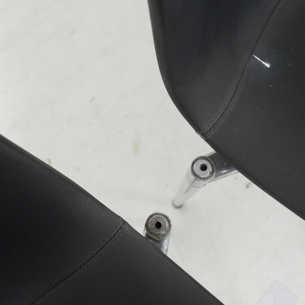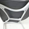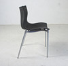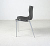 Stapelbare Stühle mit Gestell aus grau lackiertem Aluminium. Eloxierte Aluminiumbeine und Polypropylenschale mit dunkelgrauem Bezug.