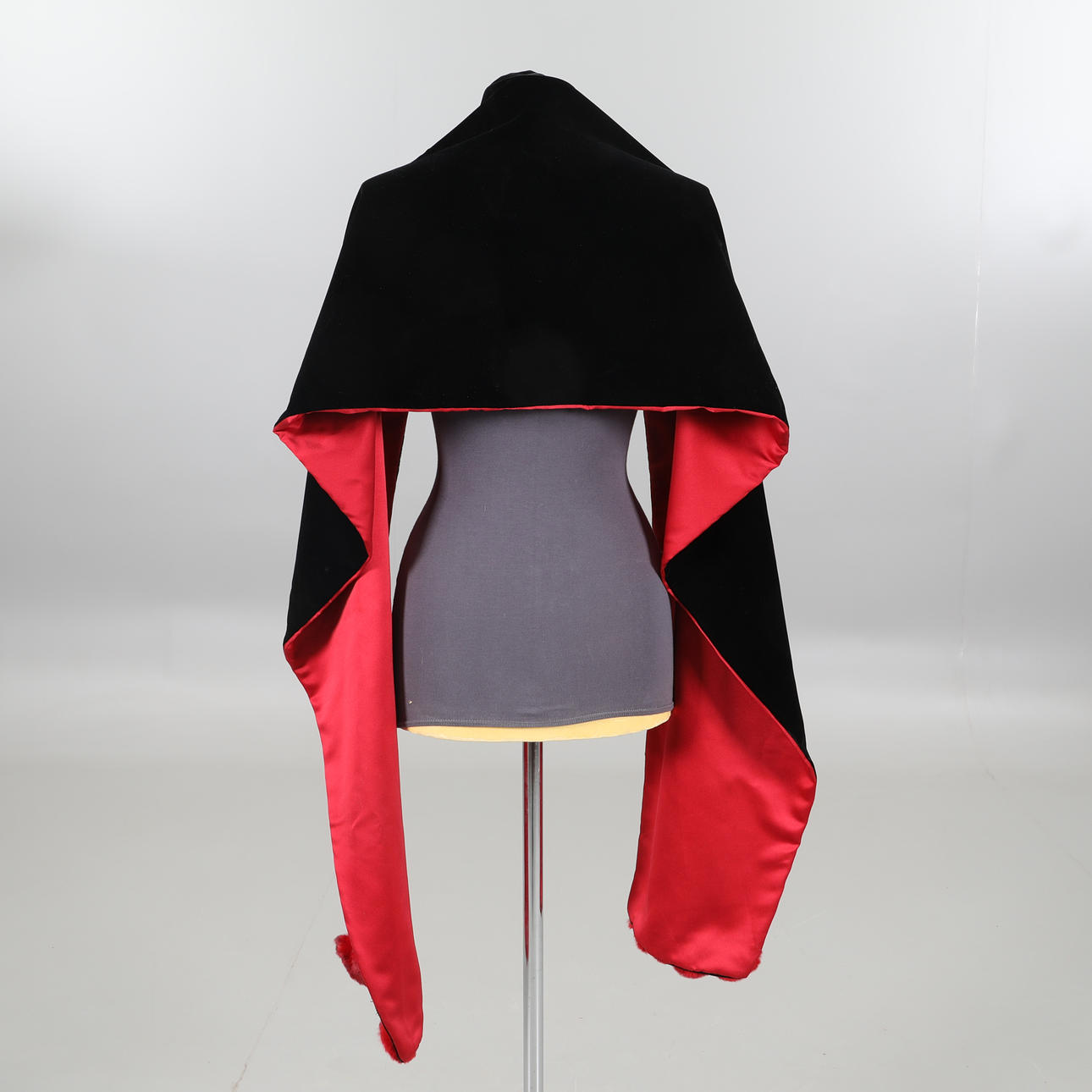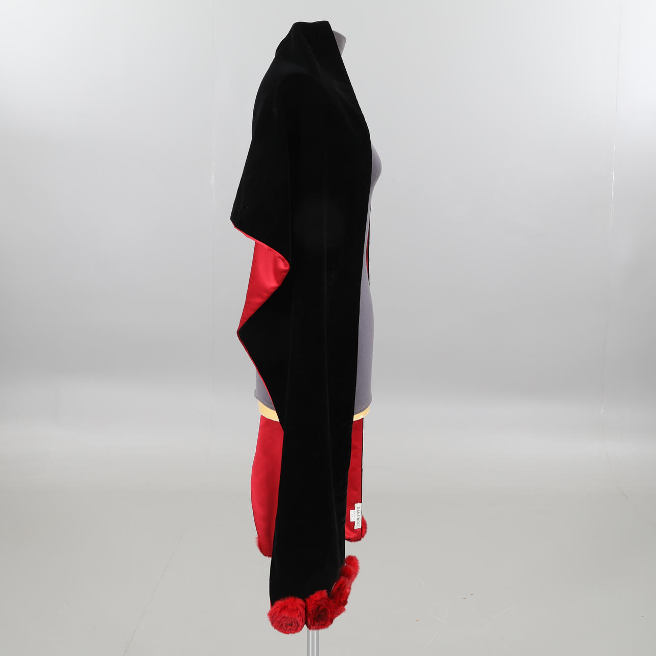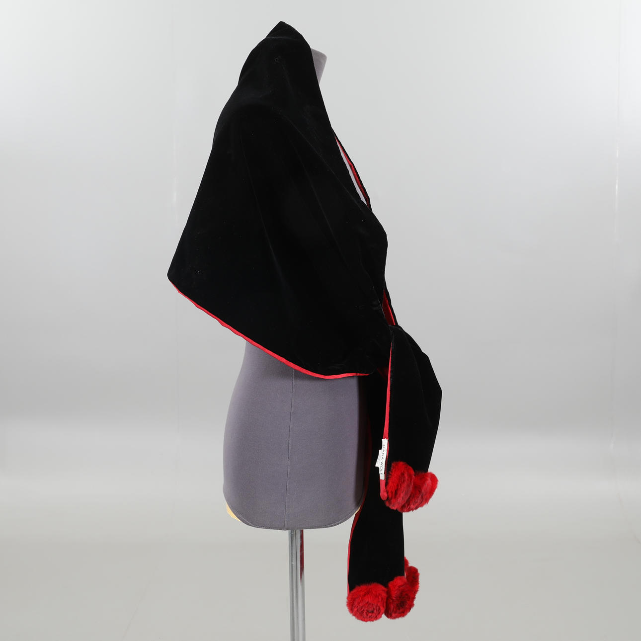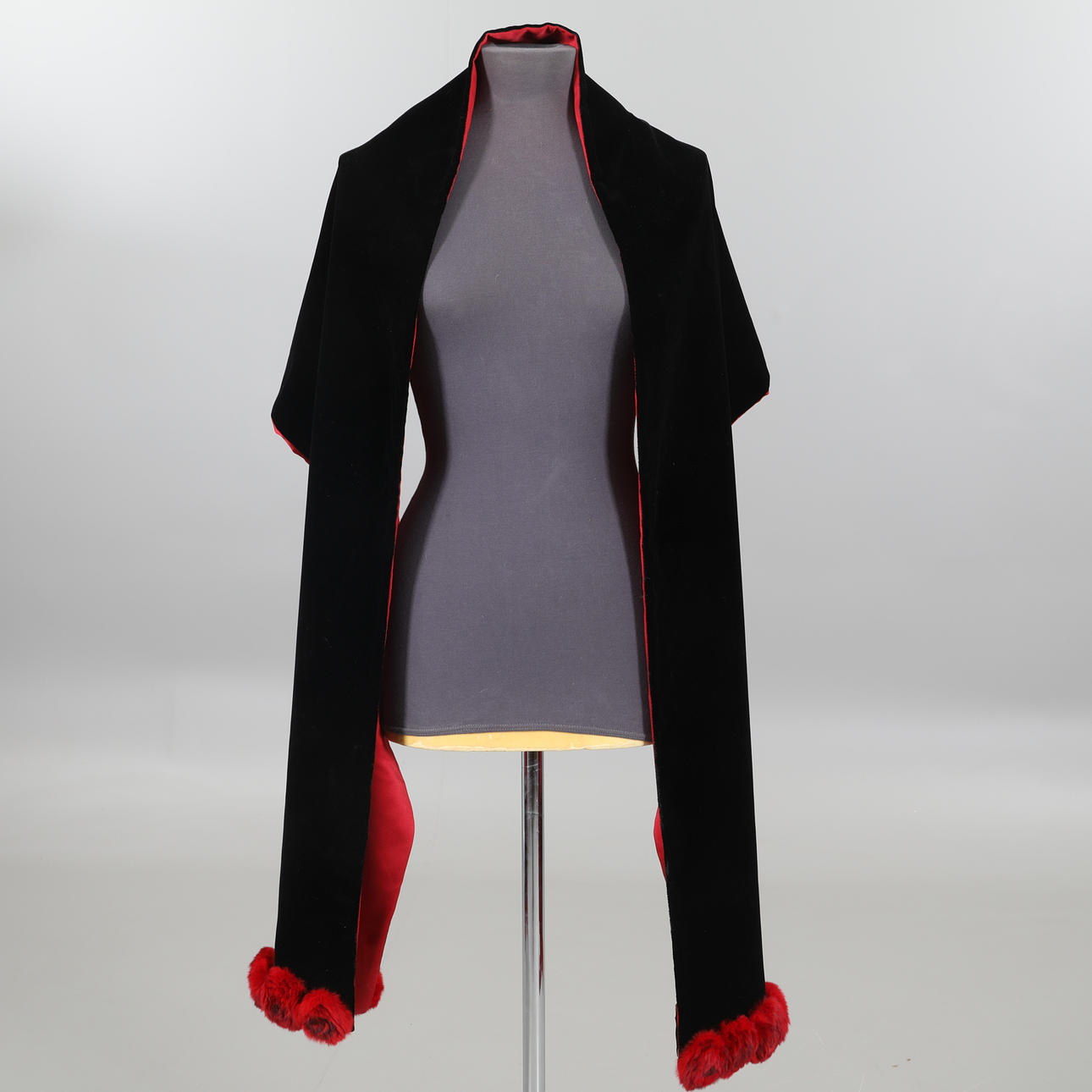 Stuhl, Schal aus schwarzem Samt, rotes Futter und mit roten Felldetails. Hergestellt von der amerikanischen Designerin Ilana Wolf.
