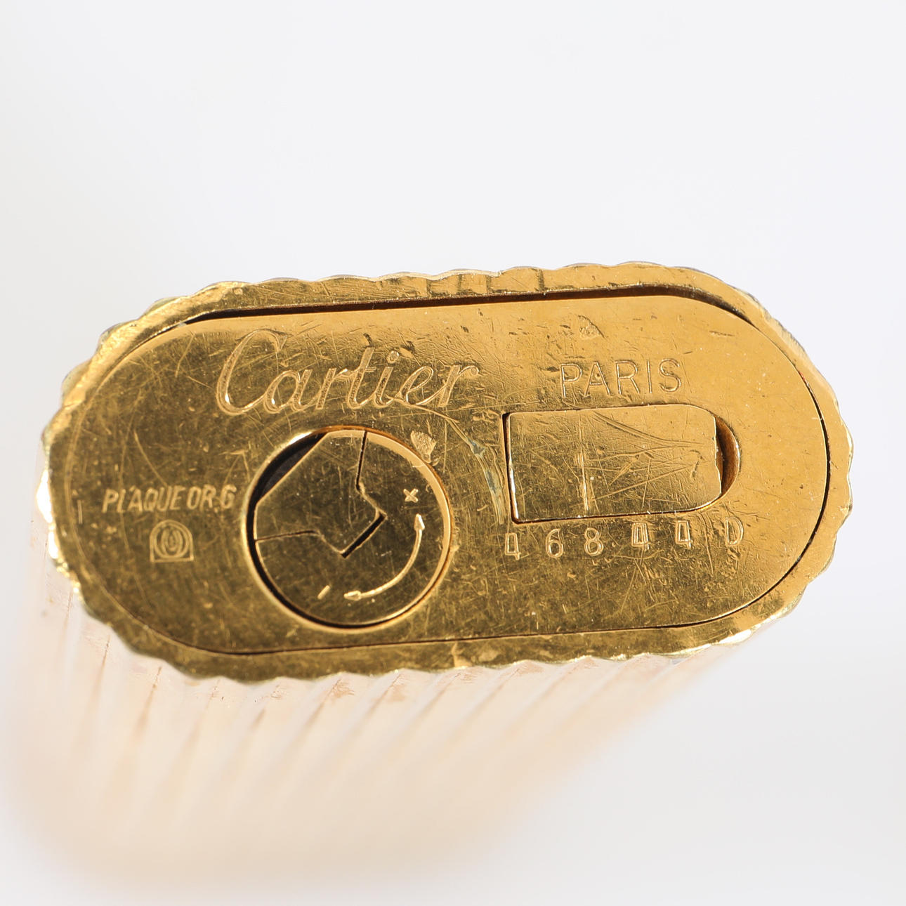 Vergoldetes Feuerzeug von Cartier. Paris, facettiertes Muster. Seriennummer 46844D Länge: ca. 7 cm Tiefe: ca. 1,25 cm Breite: ca. 2,5 cm.