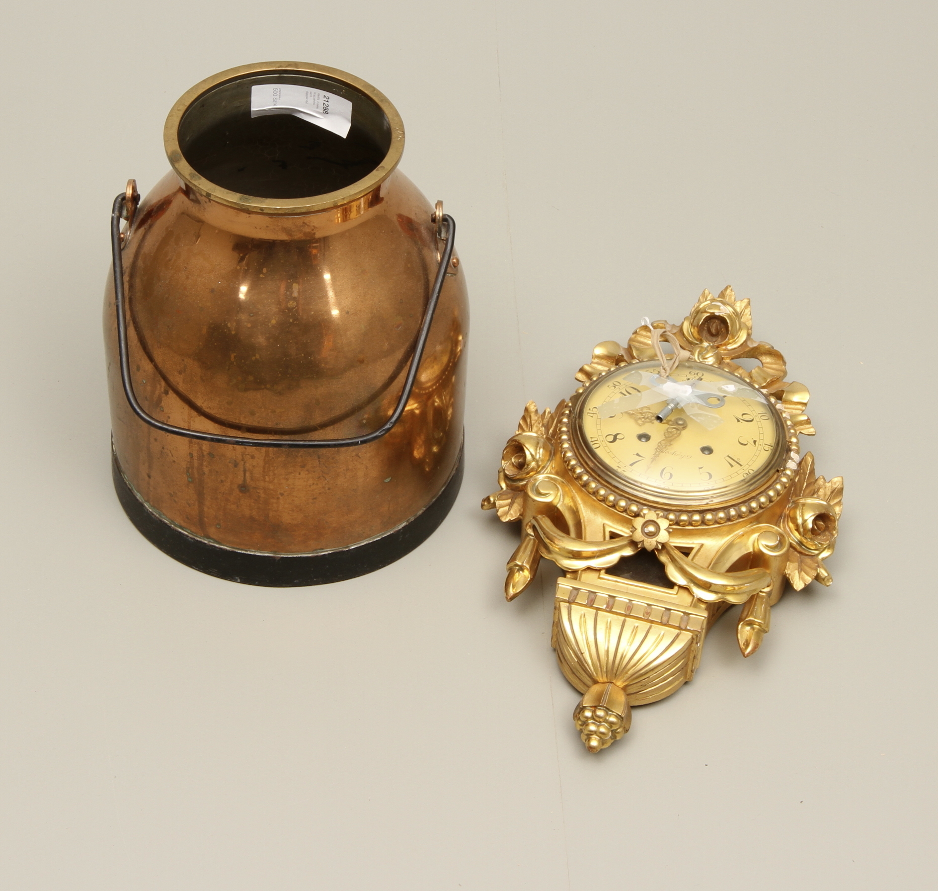 21288. Ein Menge, 2 Teile, Kupferkübel und Wandpendel.