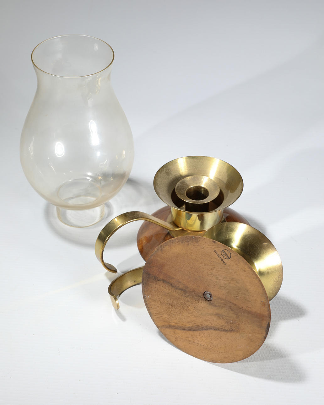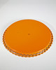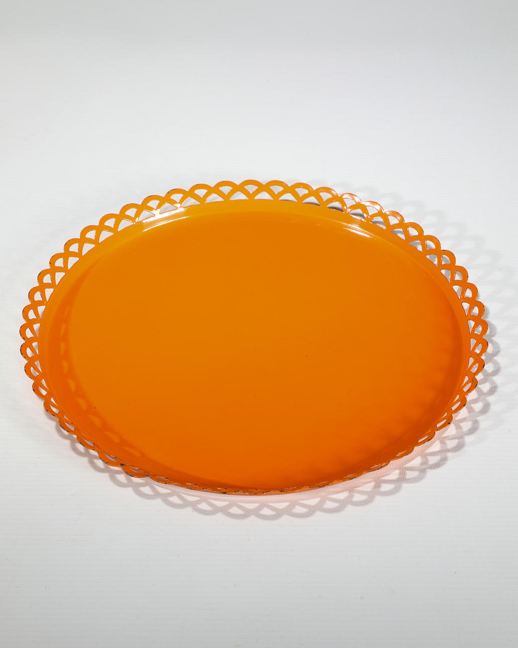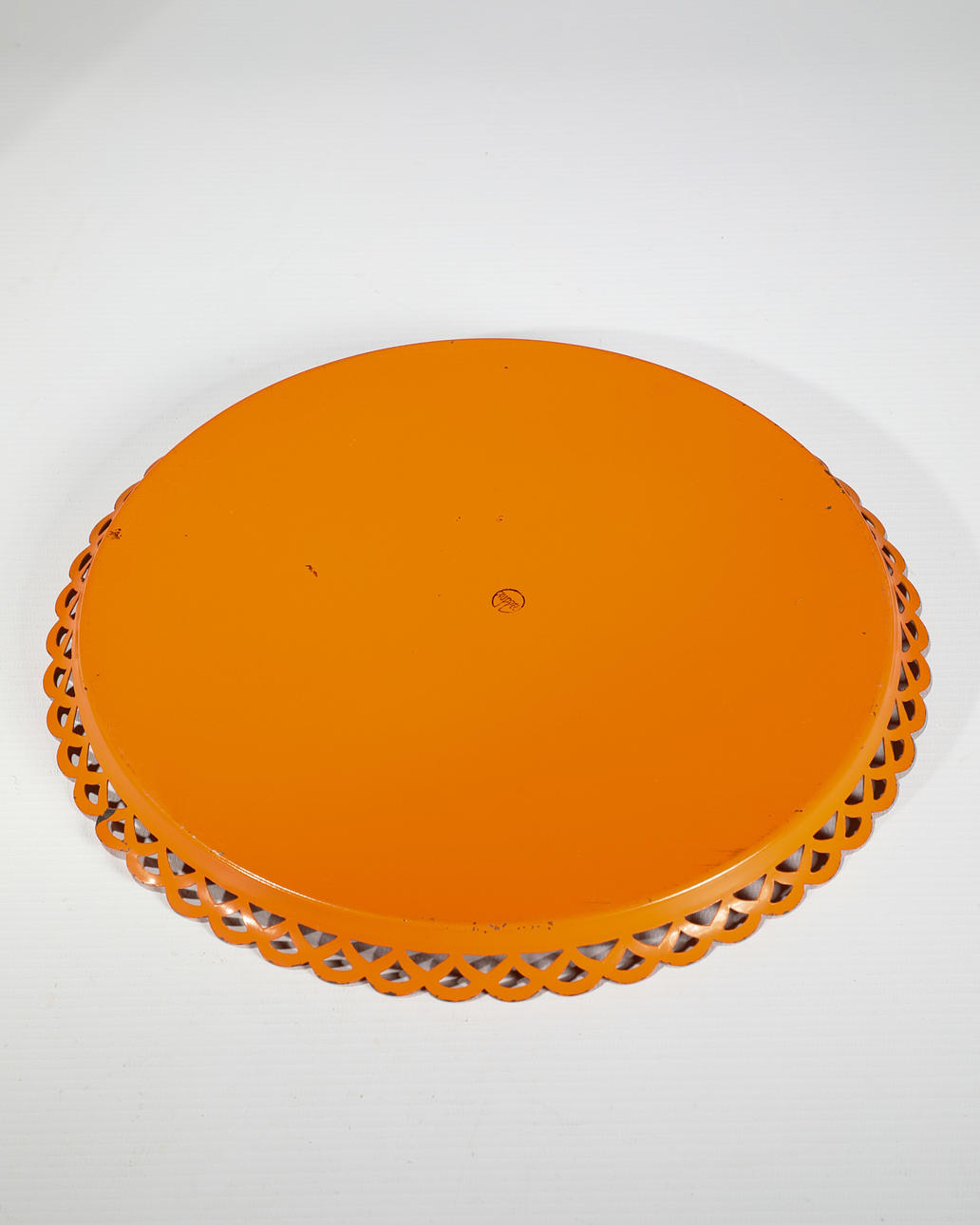 Oranges Tablett mit zwei Leuchten. Orange lackiertes Metall Tablett mit ornamentiertem Rand. D: 30 cm. Zwei Leuchten aus Messing, mit Holzfuß, eine mit Glas. H. 23 cm / 8 cm. D. 12,5 cm. Jeweils am Boden mit Stempel bezeichnet: Ruppel geschützt.