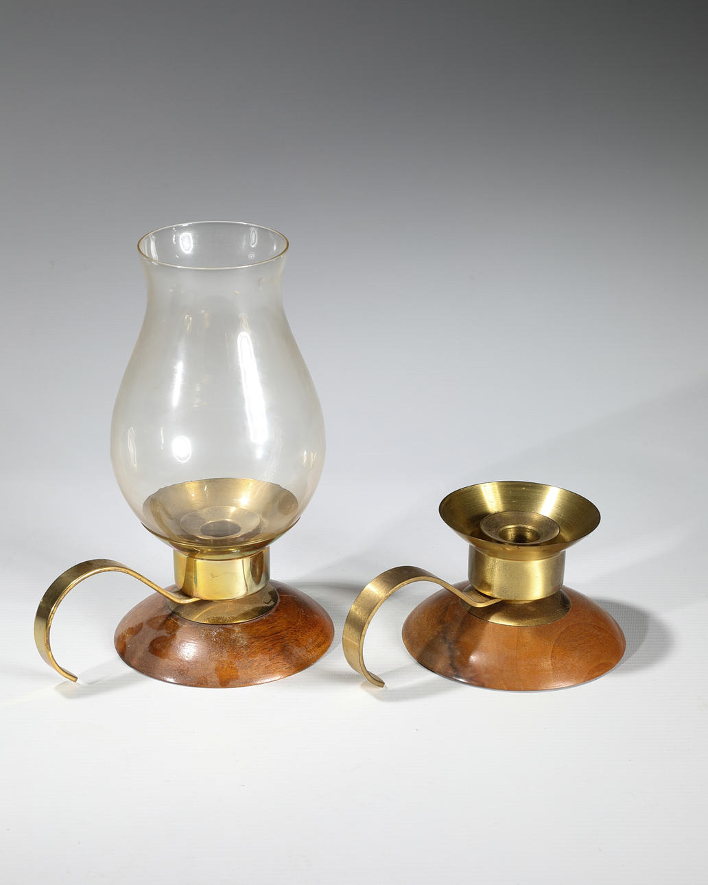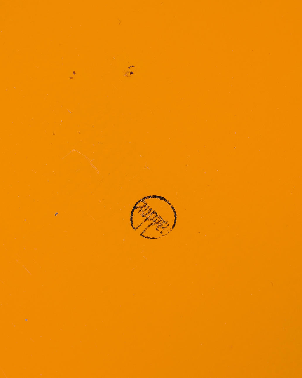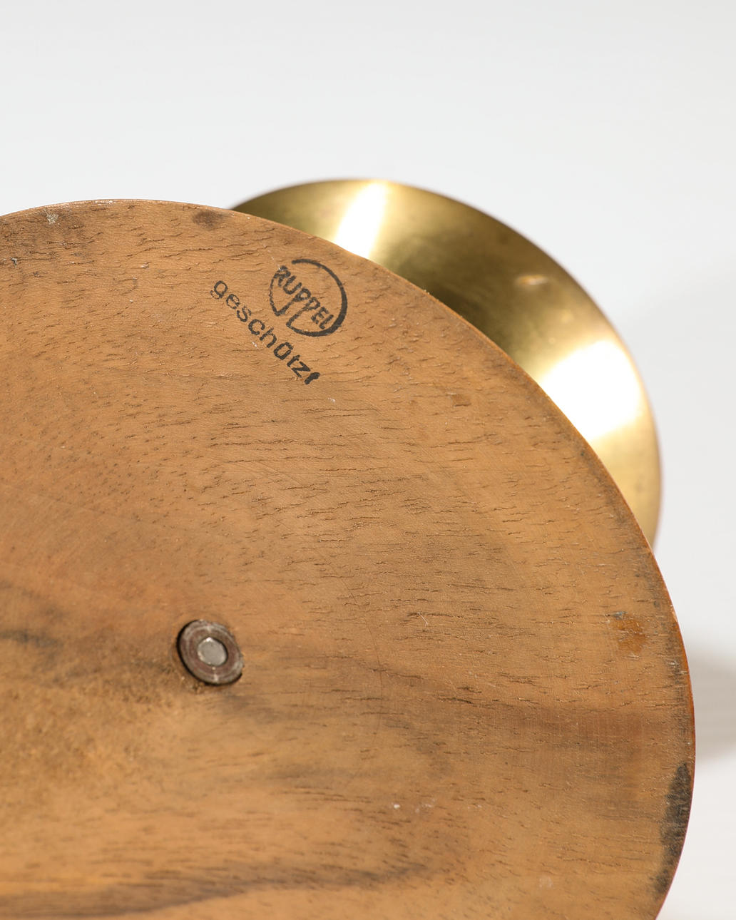 Oranges Tablett mit zwei Leuchten. Orange lackiertes Metall Tablett mit ornamentiertem Rand. D: 30 cm. Zwei Leuchten aus Messing, mit Holzfuß, eine mit Glas. H. 23 cm / 8 cm. D. 12,5 cm. Jeweils am Boden mit Stempel bezeichnet: Ruppel geschützt.