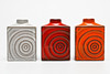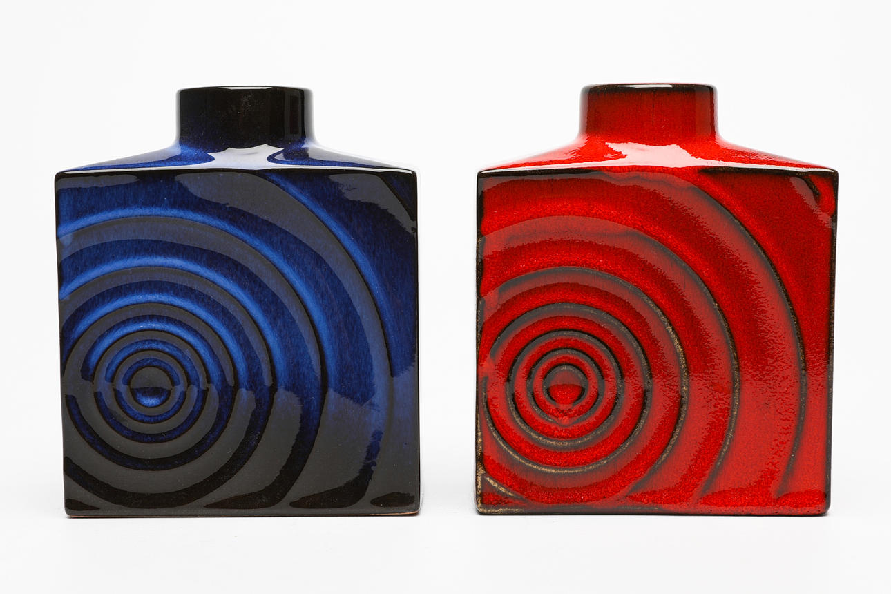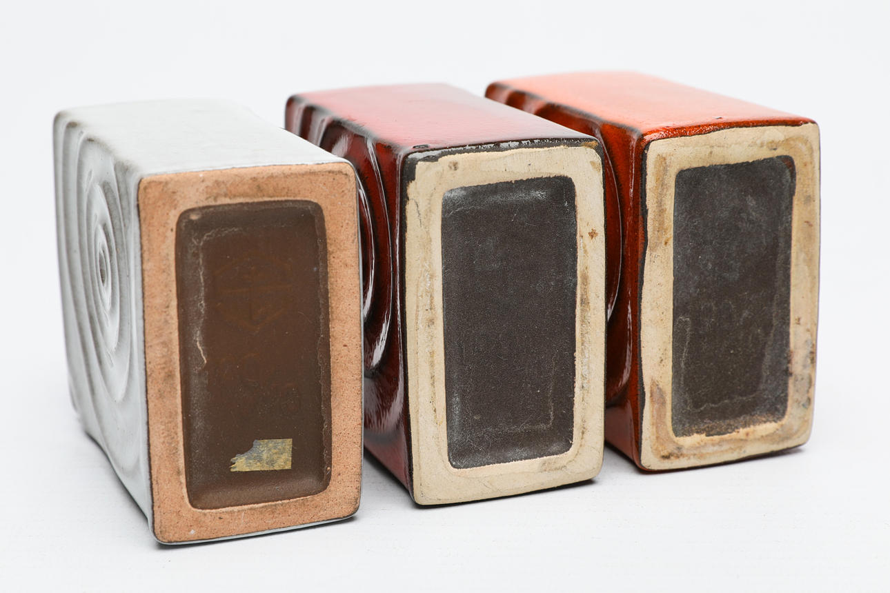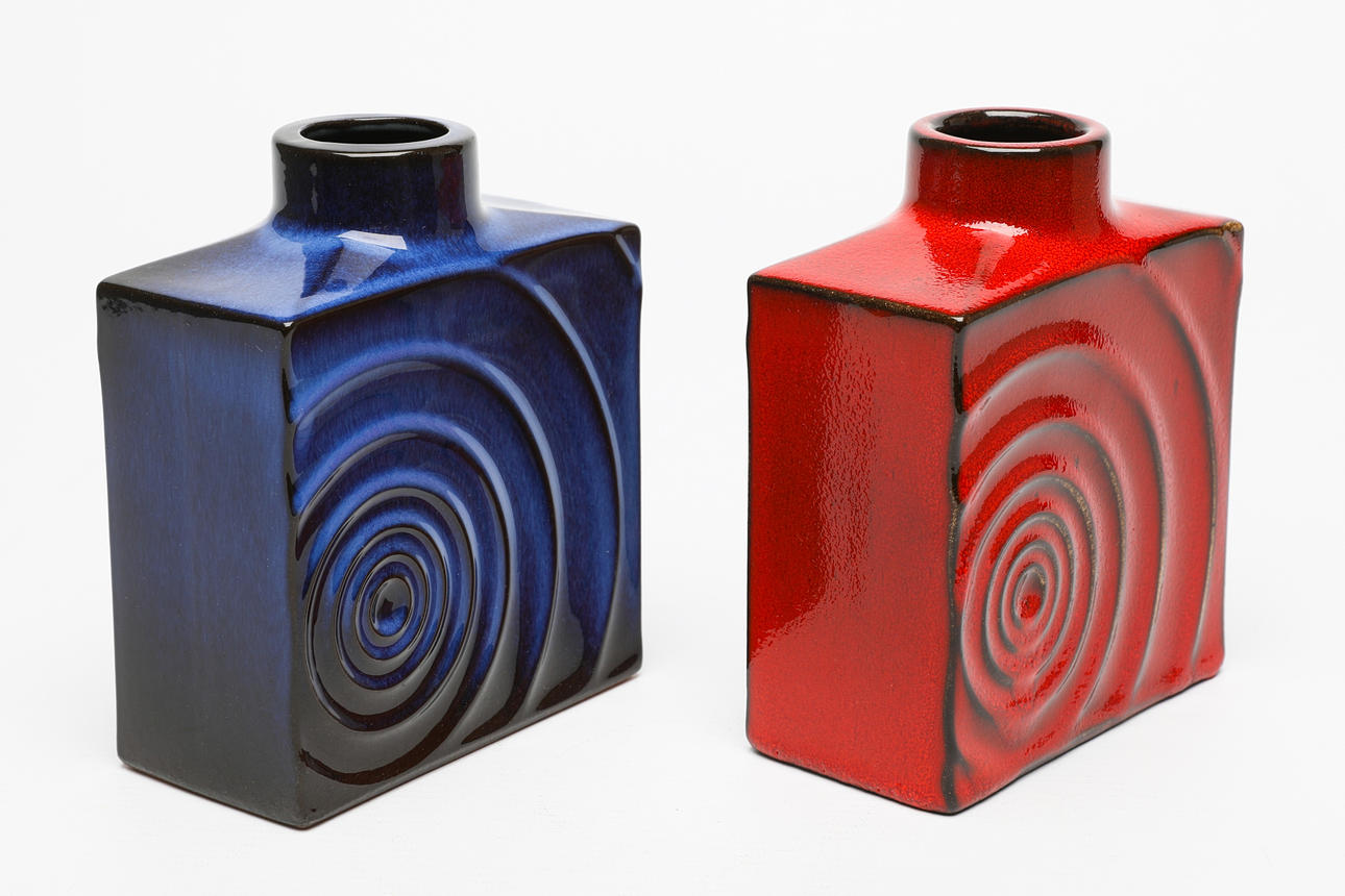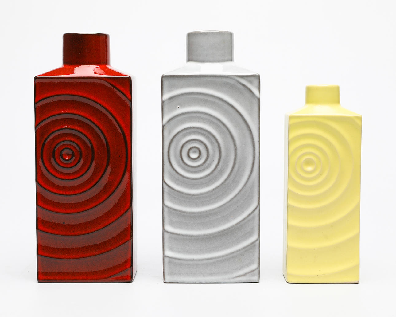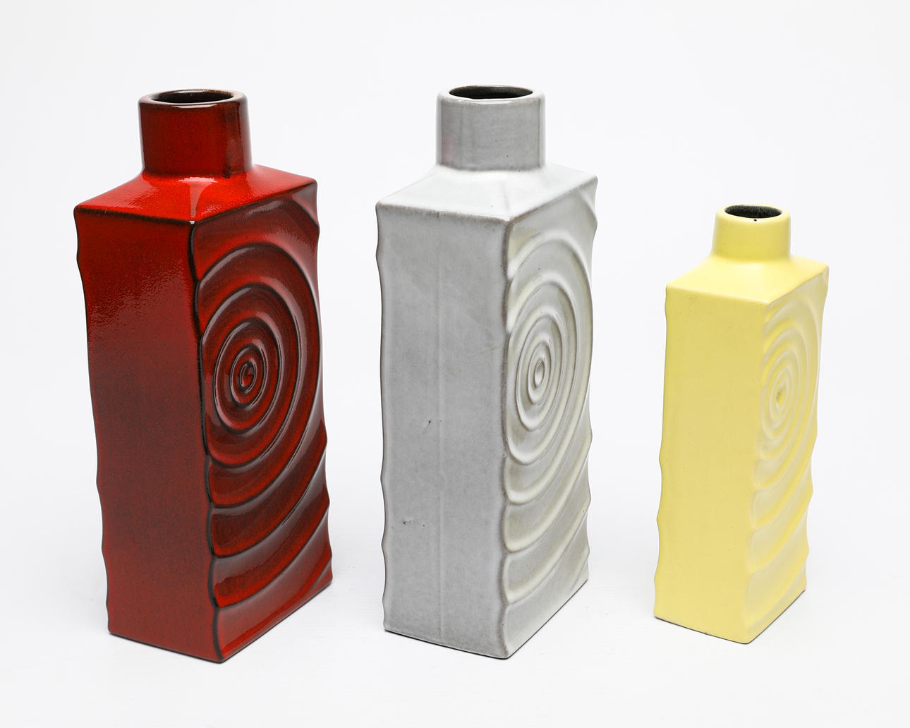 Konvolut Zyklon Vasen. Entworfen von Cari Zalloni für Steuler. Steinzeug. 9 Teile, bestehend aus 8 Vasen und einer kleinen Schale. 2 x Mod. 215/25, weiß/ rot glasiert, H. 25,5 cm; 1x Mod. 213/20, hellgelb (matt) glasiert, H. 20 cm; 2 x Mod. 191/15, dunkelblau/ rot glasiert, H. 15 cm; 3 x Mod. 190/10, rot/ orange/ weiß glasiert, H. 10 cm; 1 x Mod. 189/10, weiß glasiert, H. 7,5 cm. Jeweils am Boden mit Firmenmarke und Modellnummer bezeichnet.