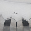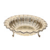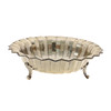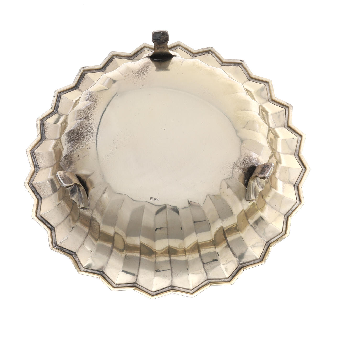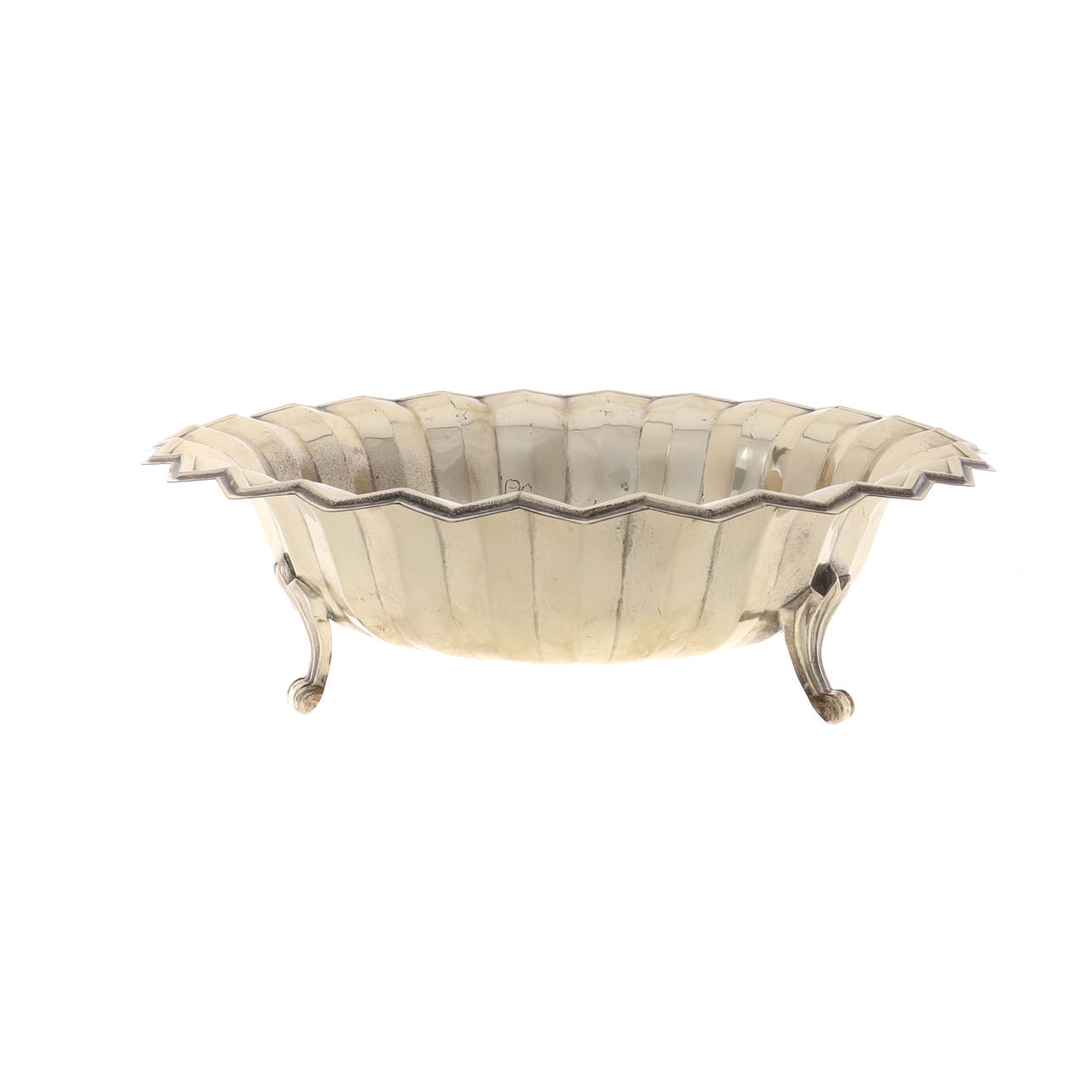 die getäfelten ausgestellten Seiten mit einem Zickzackrand, auf drei Rollfüßen, 27,5 cm Durchmesser x 8 cm hoch, 437 g, 14 Unzen.