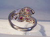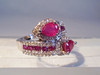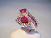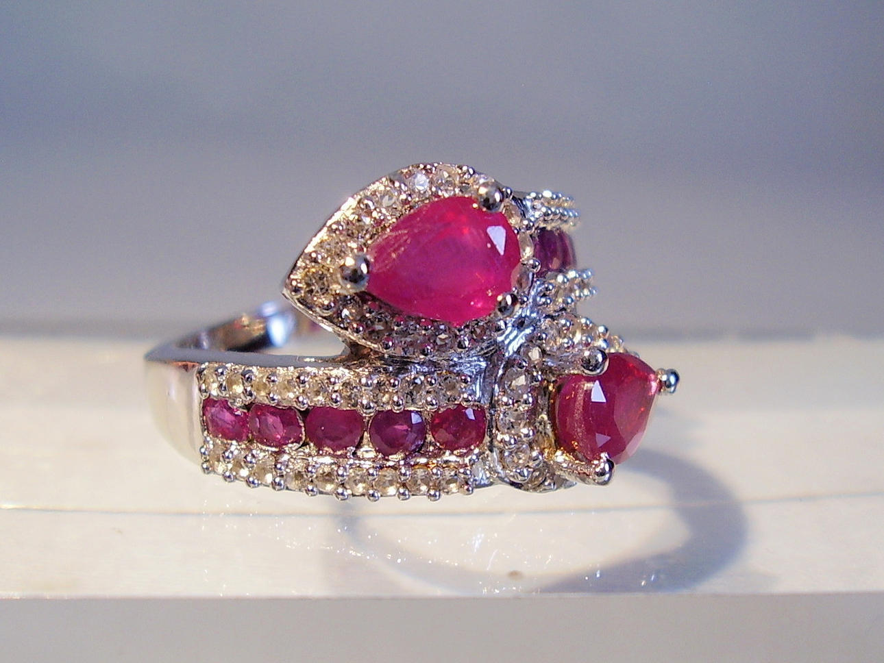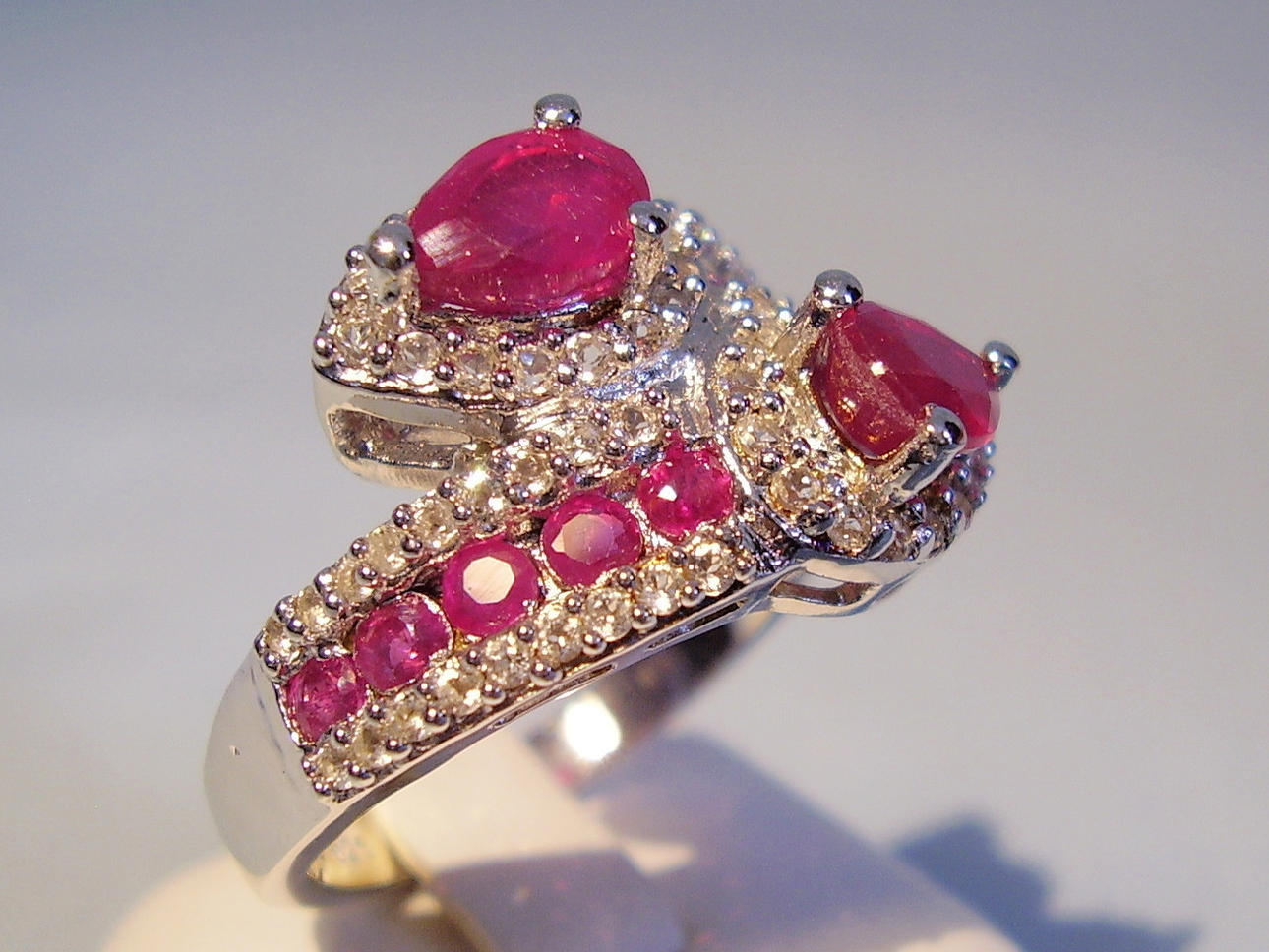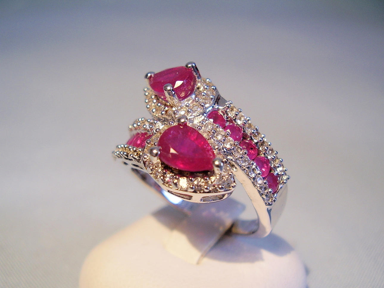 Der Ring ist in Silber 925 gearbeitet und auch so punziert. Der Ringkopf ist gegenläufig gearbeitet und mit zwei facettierten, echten Rubinen im Birn-Schliff besetzt. Diese sind umgeben von einer Vielzahl von weißen Topasen als Entourage. Die Ringschultern sind besetzt mit 10 rund facettierten Rubinen, die beidseitig von rund facettierten weißen Topasen eingerahmt sind Die Rubine haben zusammen ca. 1,6 ct., die weißen Topase haben zusammen 0,7 ct.