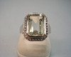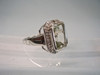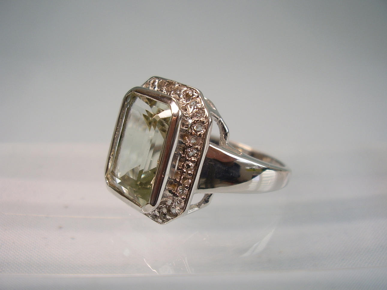Er ist besetzt mit einem achteckig facettierten hellgünen Prasiolith in sehr guter Qualität, der von einer Entourage von rund facettierten, weißen Topasen umgeben ist.