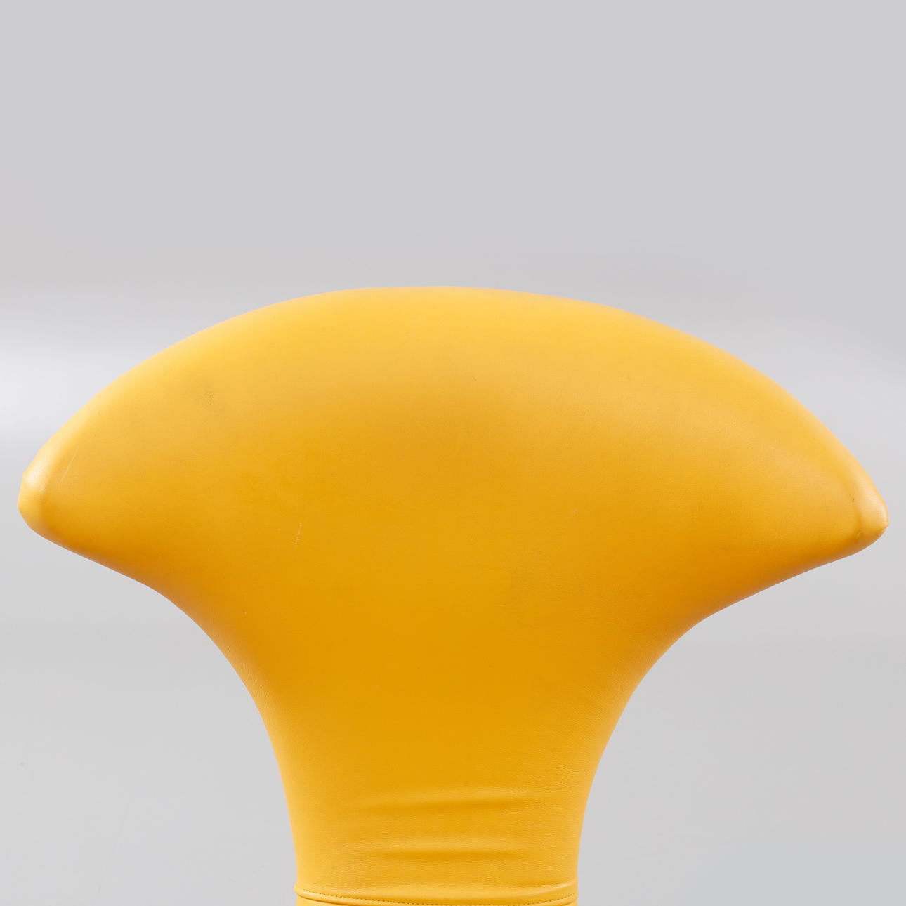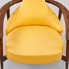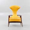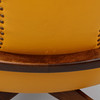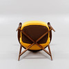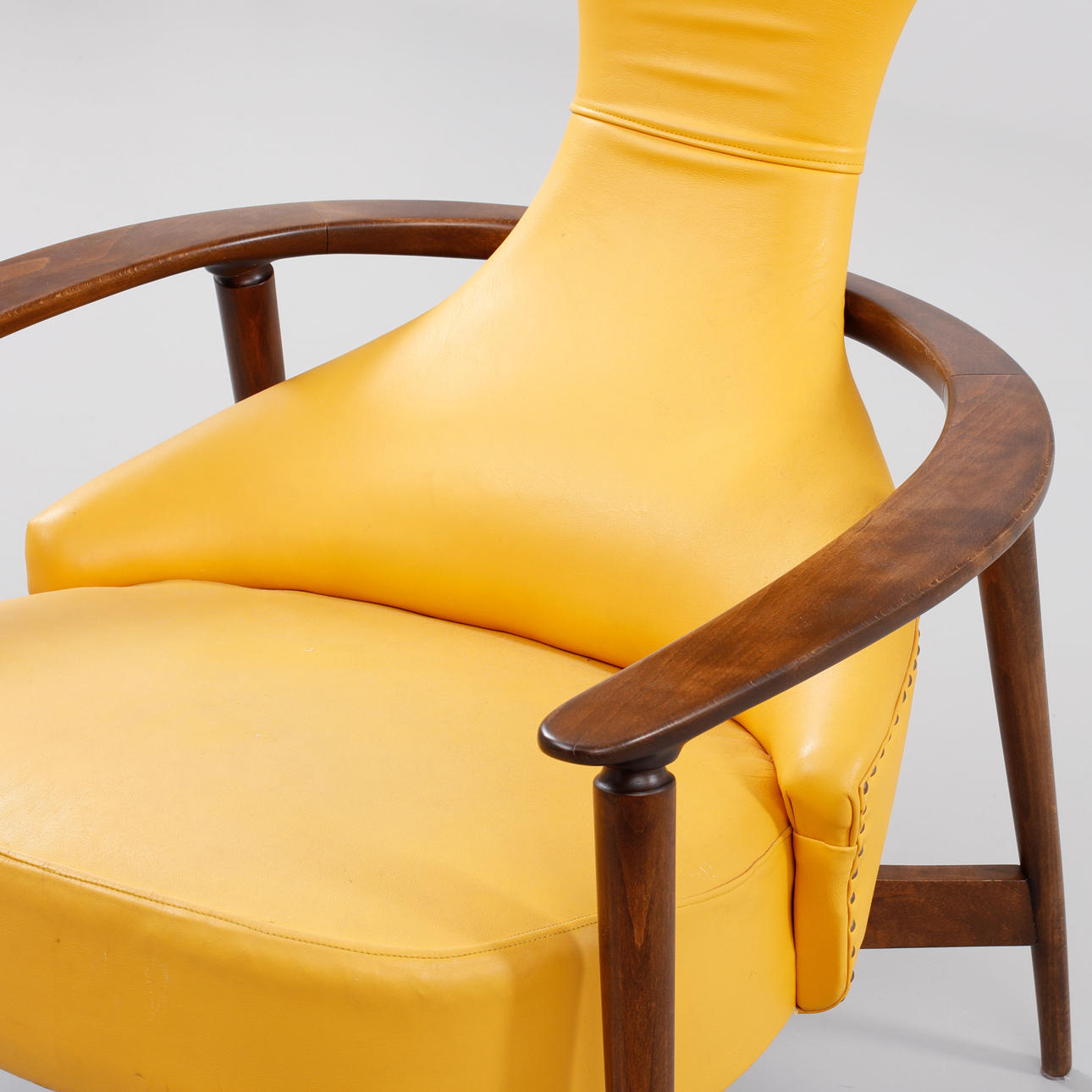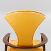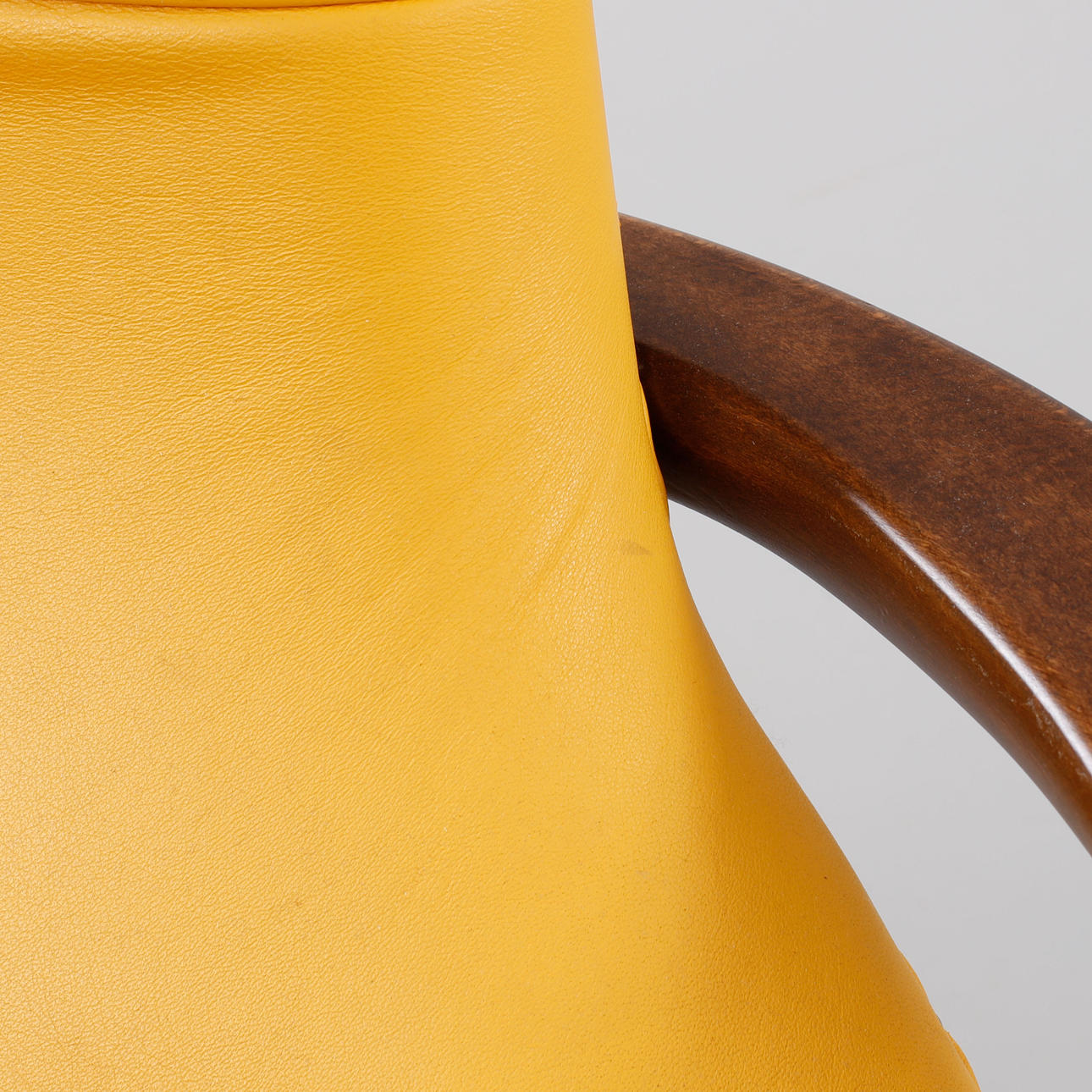 Gestell aus gebeizter Rotbuche. Gepolsterter Sitz und Rücken mit gelbem Lederbezug. Hinten mit Perlennieten. Breite 72 cm, Sitzhöhe ca. 41 cm, Gesamthöhe ca. 105 cm.