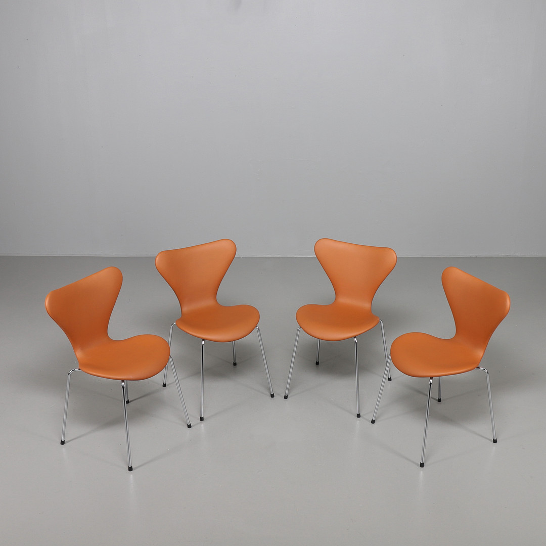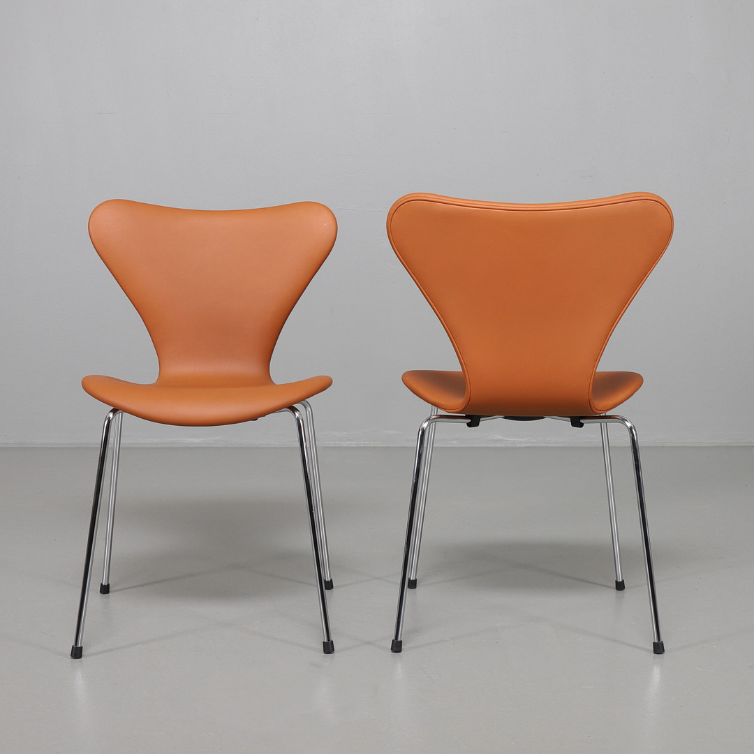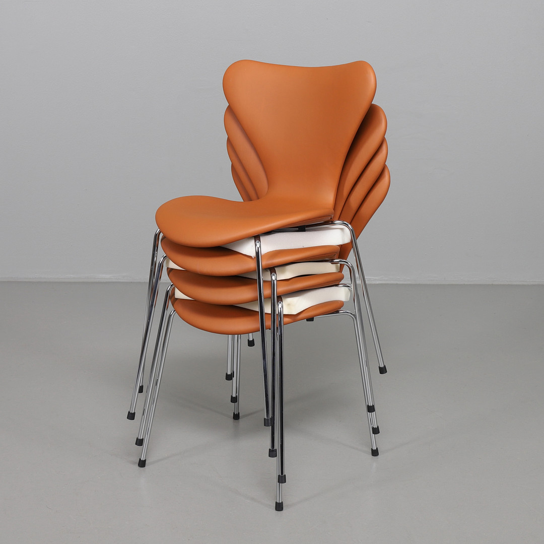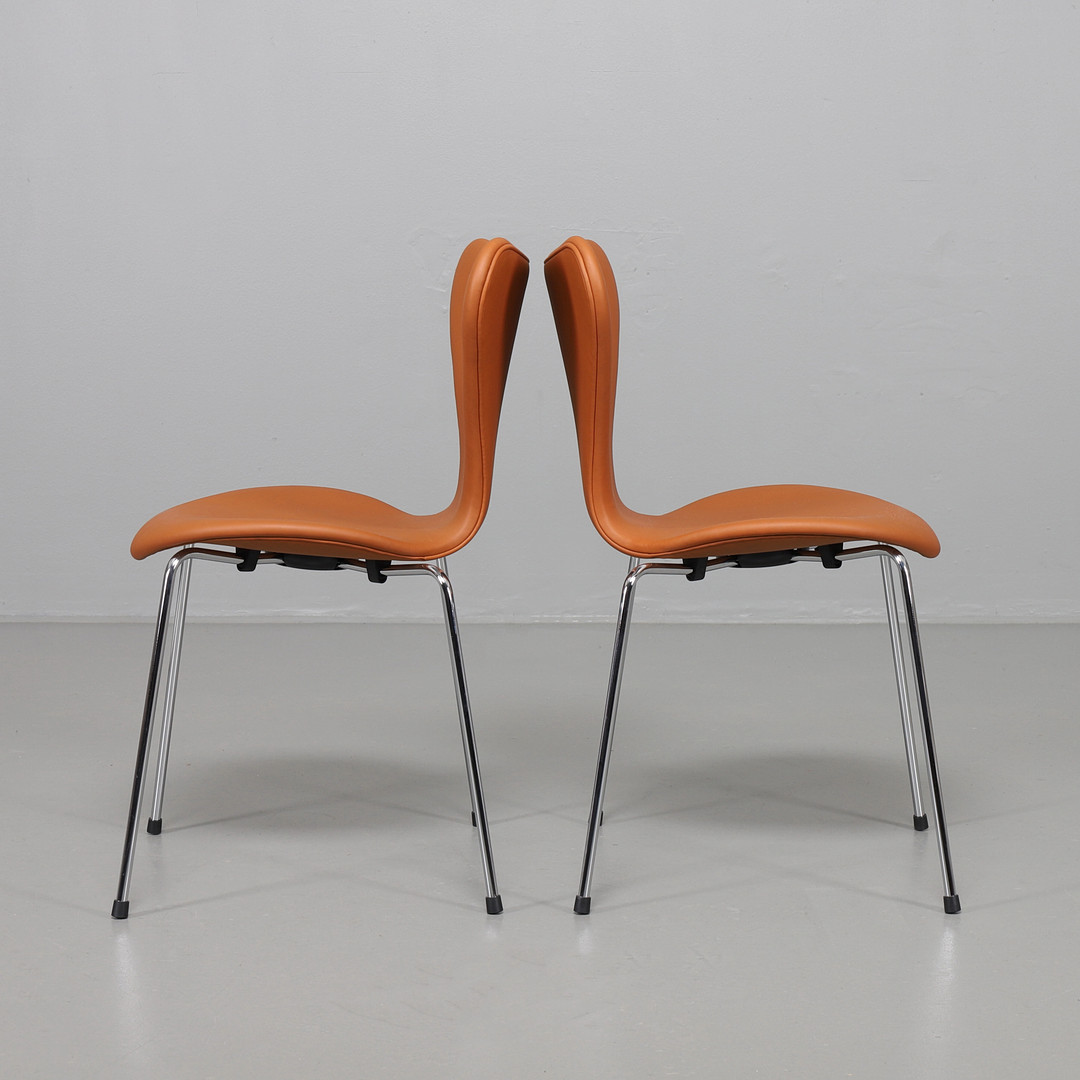 2153621. ARNE JACOBSEN. Sieben Stühle, davon 4 in Leder Elegance Nussbaum.