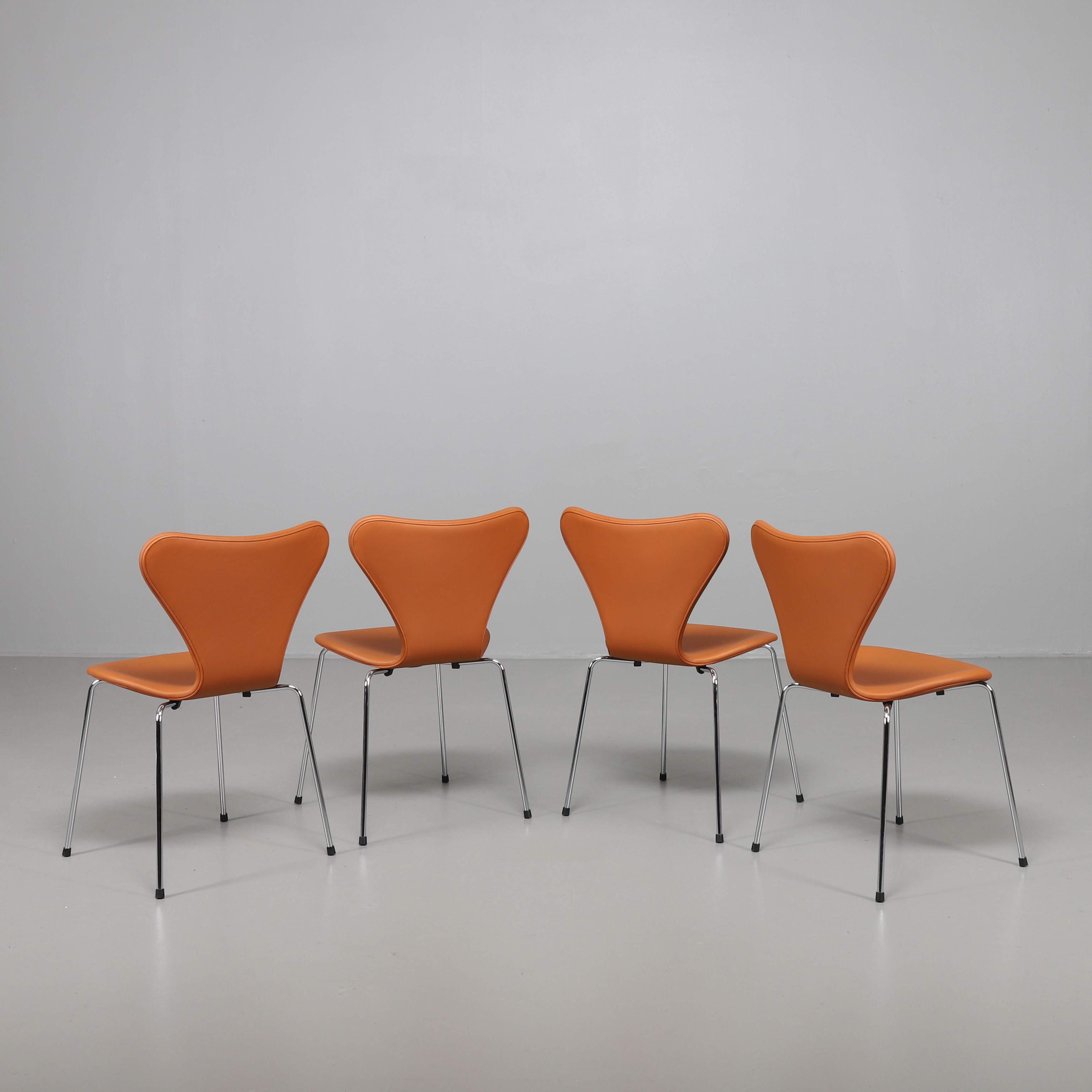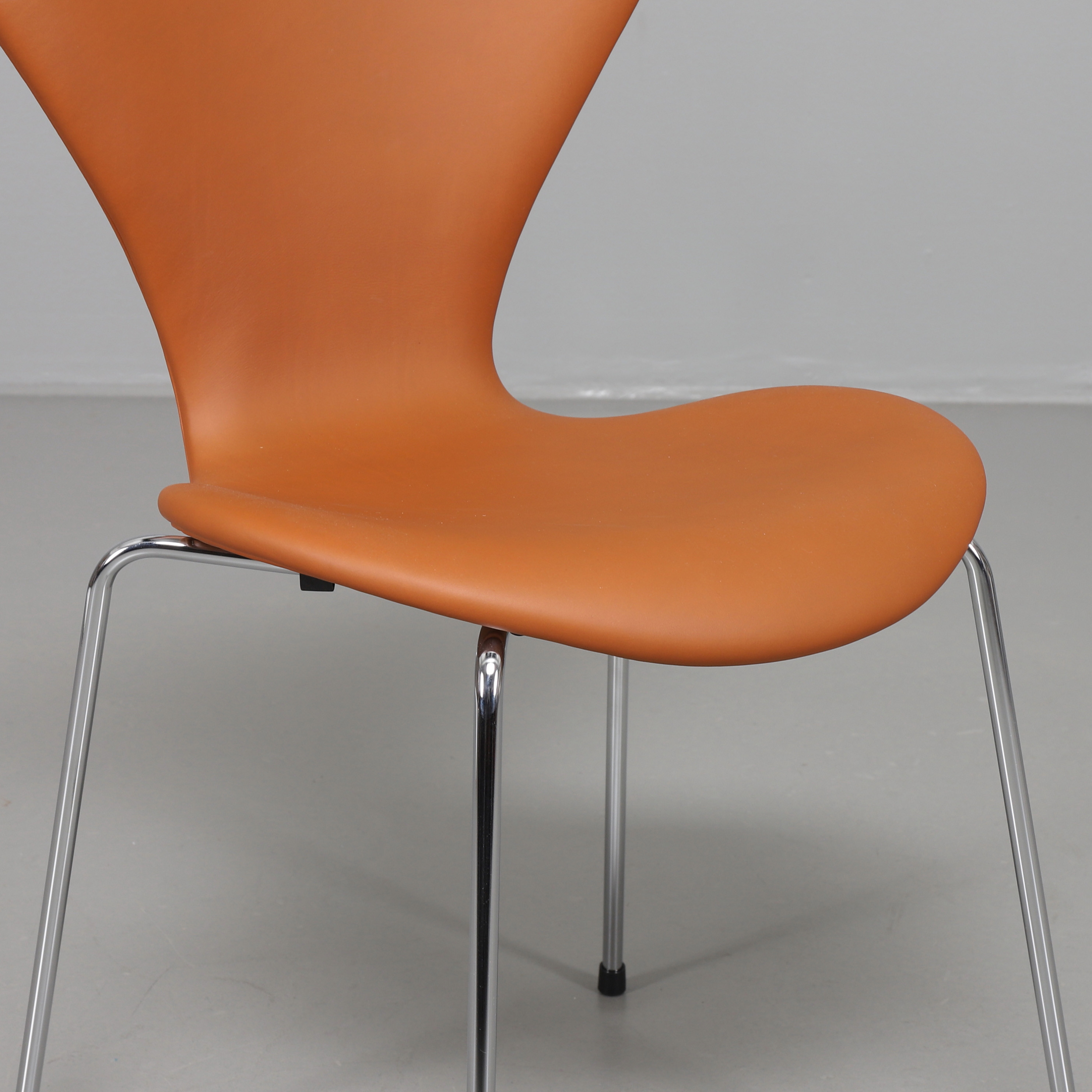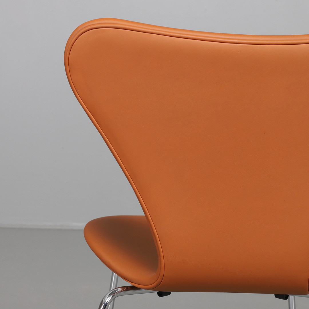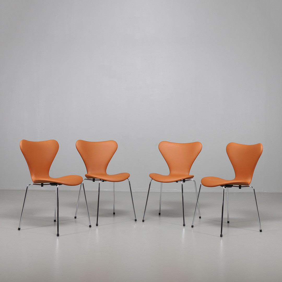 2153621. ARNE JACOBSEN. Sieben Stühle, davon 4 in Leder Elegance Nussbaum.